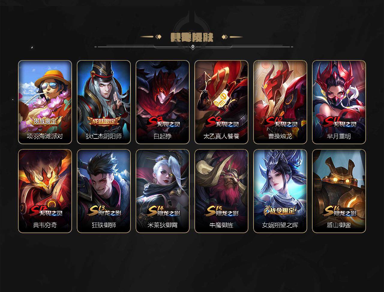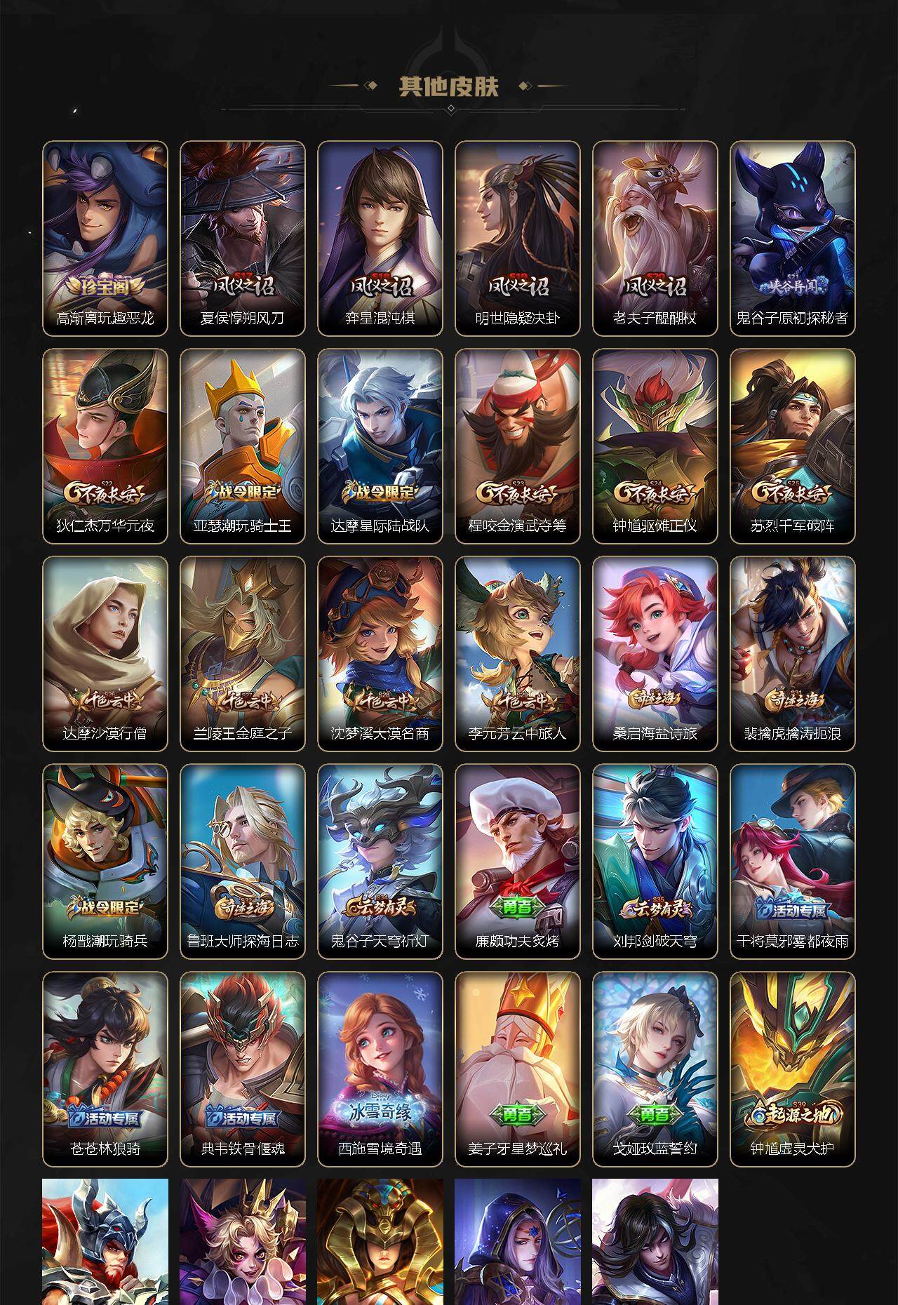 【赛季限定】:白起狰,芈月重明,夏侯惇朔风刀,曹操烛龙,典韦穷奇,狄仁杰万华元夜,达摩沙漠行僧,老夫子醍醐杖,程咬金演武夺筹,兰陵王金庭之子,牛魔御旌,李元芳云中旅人,钟馗驱傩正仪,太乙真人饕餮,鬼谷子原初探秘者,苏烈千军破阵,弈星混沌棋,沈梦溪大漠名商,明世隐疑决卦,裴擒虎擒涛扼浪,狂铁御狮,米莱狄御霄,盾山御銮,鲁班大师探海日志,桑启海盐诗旅,鬼谷子天穹祈灯,刘邦剑破天穹