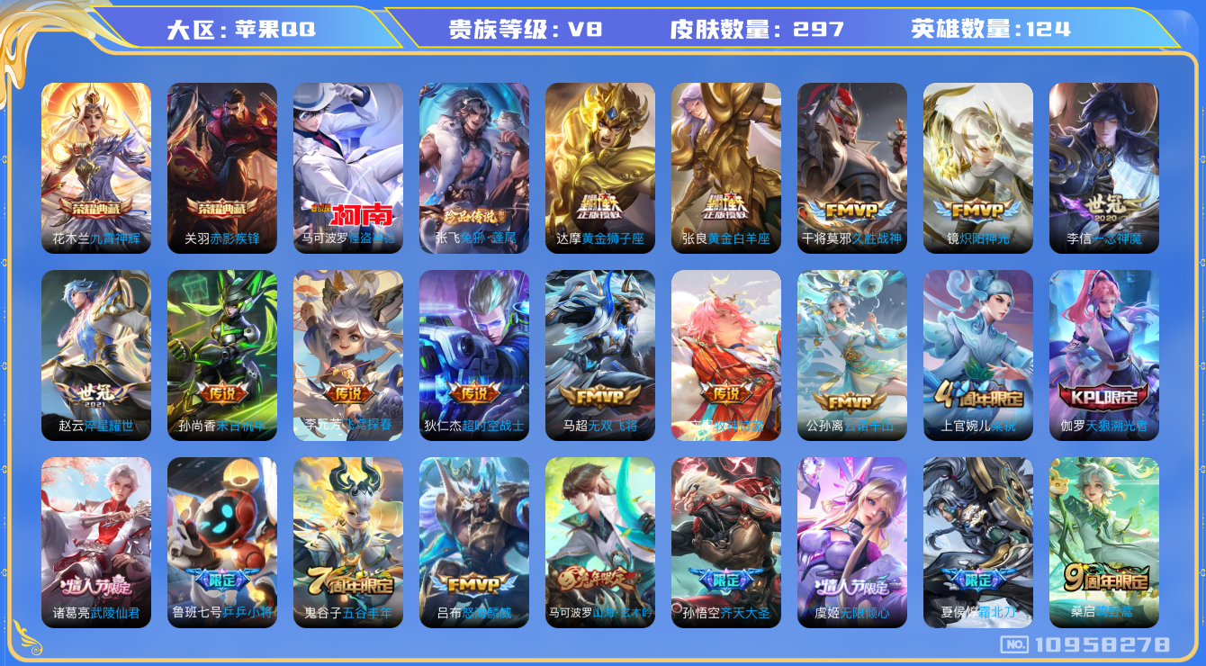 [10958278]【商品标题】:苹果Q-V8-至尊星耀II段位-124英雄-297皮肤-2典藏-0珍品无双-0无双-2珍品传说-22传说-78史诗