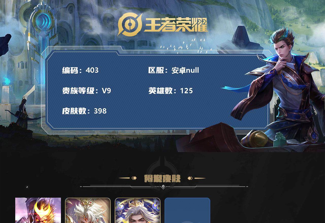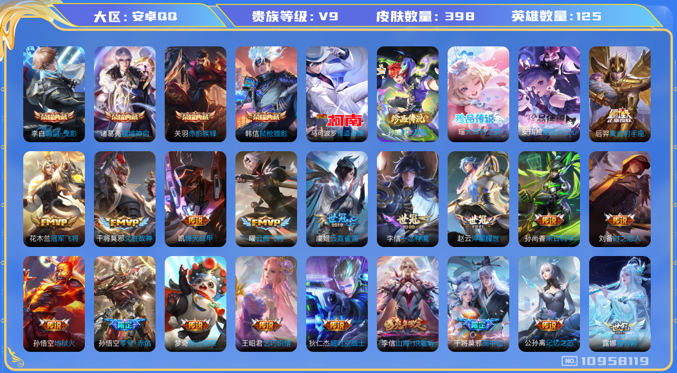 [10958119]【商品标题】:安卓Q-V9-至尊星耀I段位-125英雄-398皮肤-4典藏-0珍品无双-0无双-4珍品传说-29传说-114史诗