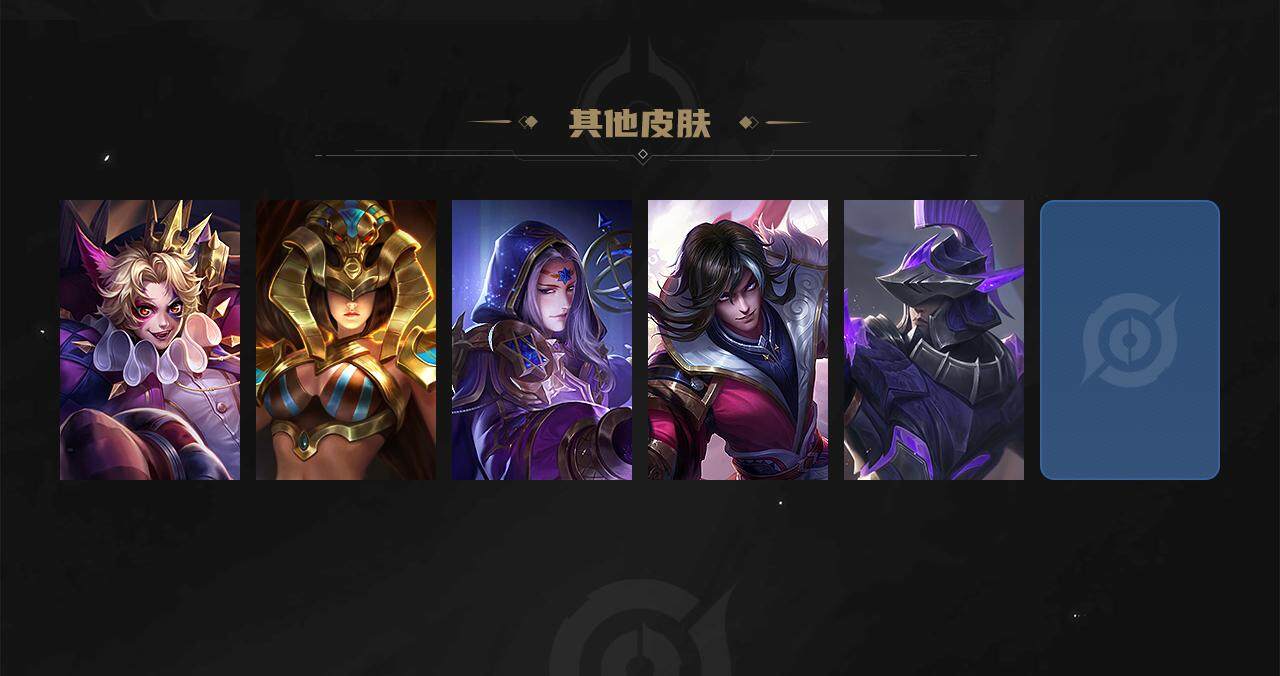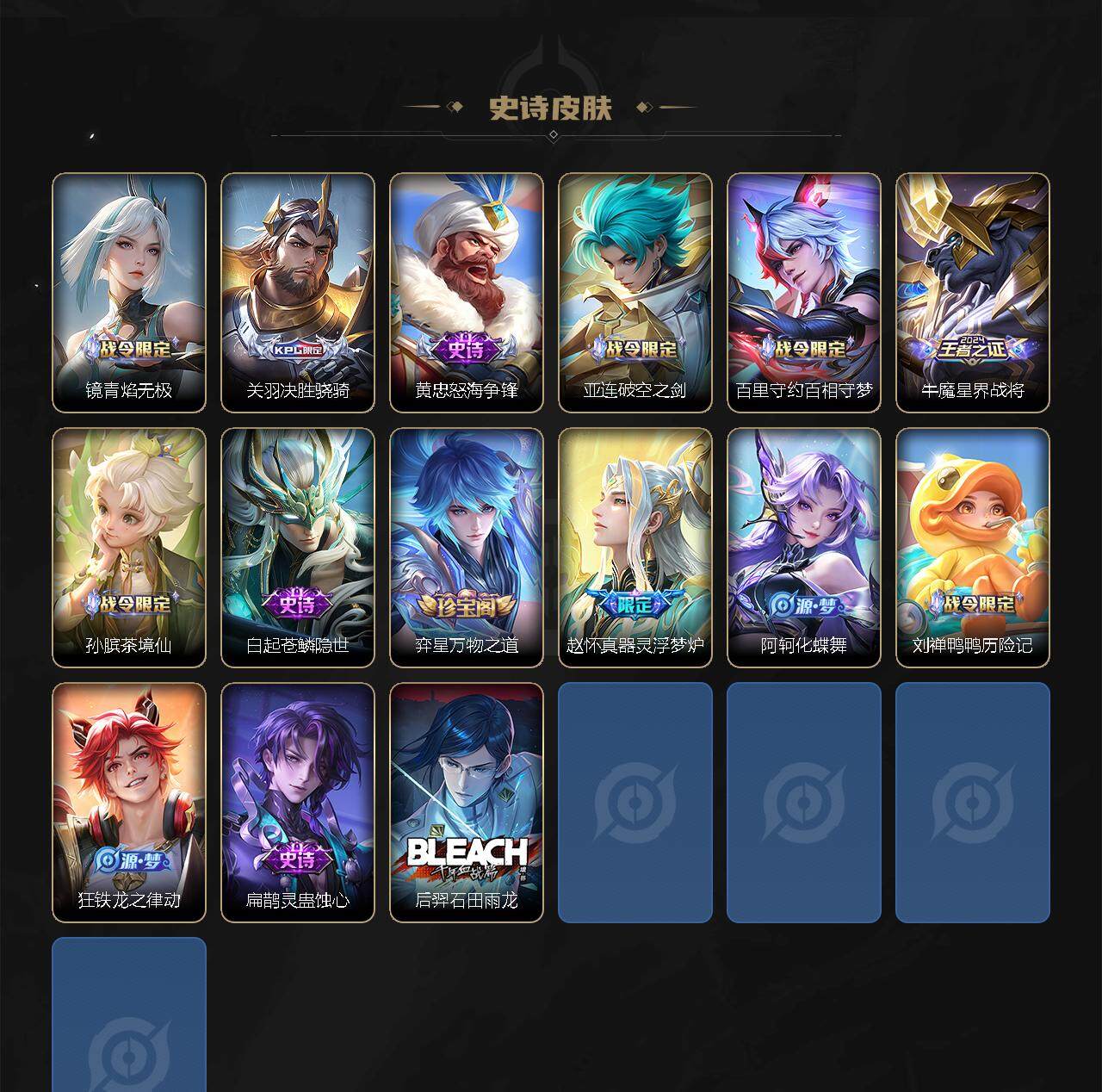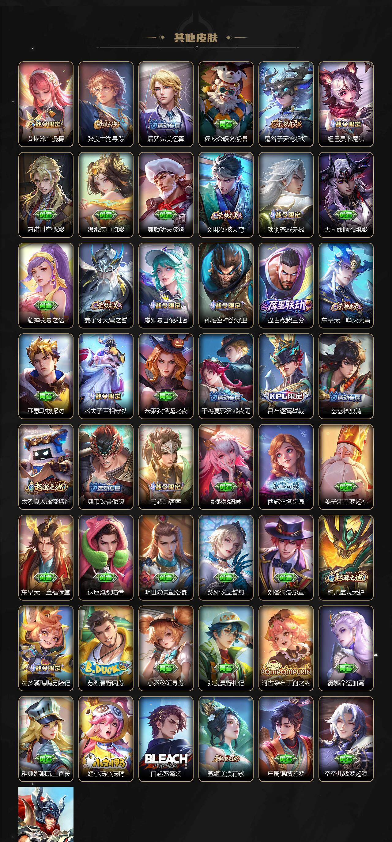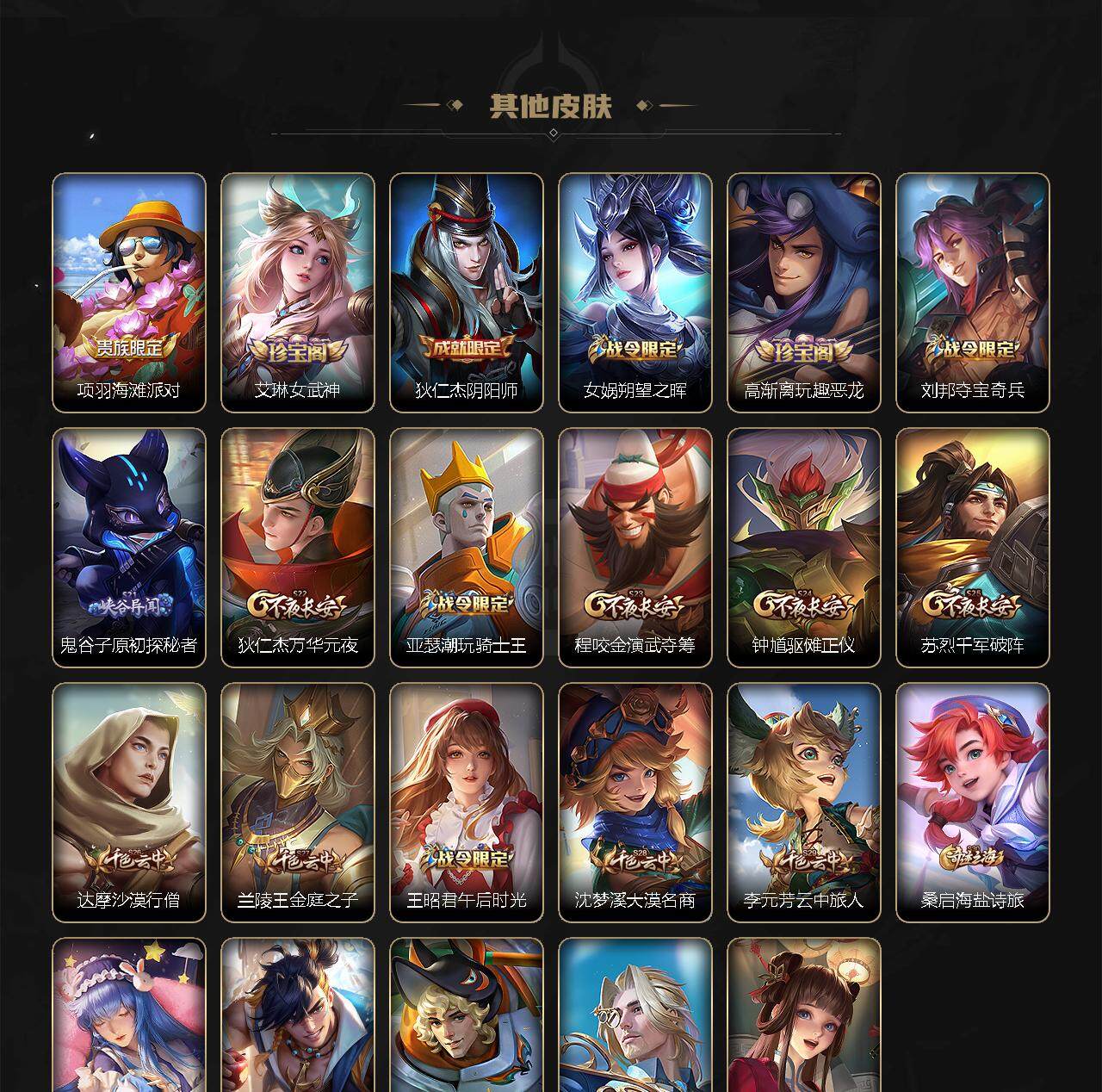 【限定皮肤】:铠冥王哈迪斯,暃埋骨钱,蒙犽顽岩魄,蔡文姬夏日便利店,大乔绒语心约,虞姬夏日便利店,姜子牙天穹之誓,杨戬破阵退雄兵,李白谪仙醉月,狄仁杰阴阳师,赵云皇家上将,赵云百木心枪,高渐离玩趣恶龙,扁鹊奇幻香踪,吕布御风骁将,元歌云间偶戏,元歌无心,马可波罗暗影游猎,狄仁杰魔术师,狄仁杰万华元夜,达摩沙漠行僧,项羽海滩派对,安琪拉魔法小厨娘,程咬金演武夺筹,刘邦夺宝奇兵,王昭君午后时光,兰陵王金庭之子,花木兰瑞麟志,亚瑟潮玩骑士王,孙悟空至尊宝,孙悟空零号赤焰,孙悟空孙行者,孙悟空齐天大圣,后羿如梦令,刘备百相守梦,李元芳云中旅人,虞姬启明星使,钟馗驱傩正仪,杨玉环遇见飞天,杨戬潮玩骑兵,女娲朔望之晖,干将莫邪画中仙,蔡文姬繁星吟游,鬼谷子原初探秘者,鬼谷子五谷丰年,诸葛亮时雨天司,铠青龙志,苏烈千军破阵,百里玄策白虎志,百里玄策原初追逐者,沈梦溪大漠名商,裴擒虎李小龙,裴擒虎擒涛扼浪,狂铁电玩高手,云中君纤云弄巧,李信山海炽霜斩,猪八戒猪悟能,嫦娥拒霜思,嫦娥暖冬兔眠,西施玲珑珍味,鲁班大师探海日志,桑启海盐诗旅,暃星界游侠,戈娅驭风魔法,艾琳女武神,艾琳流音漫舞,司空震地狱燃心,阿古朵江河有灵,张良古海寻踪,蒙犽百解令,蒙恬荣光圣徽,高渐离燃音魔法,妲己灵卜魔法,鬼谷子天穹祈灯,伽罗琥珀纪元,沈梦溪龙舞盛年,鲁班七号蔬乡物语,李元芳蔬乡物语,刘邦剑破天穹,程咬金群星魔术团,关羽决胜骁骑,镜青