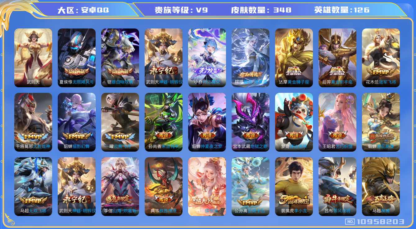 [10958203]【商品标题】:安卓Q-V9-最强王者段位-126英雄-348皮肤-2典藏-0珍品无双-2无双-1珍品传说-23传说-95史诗