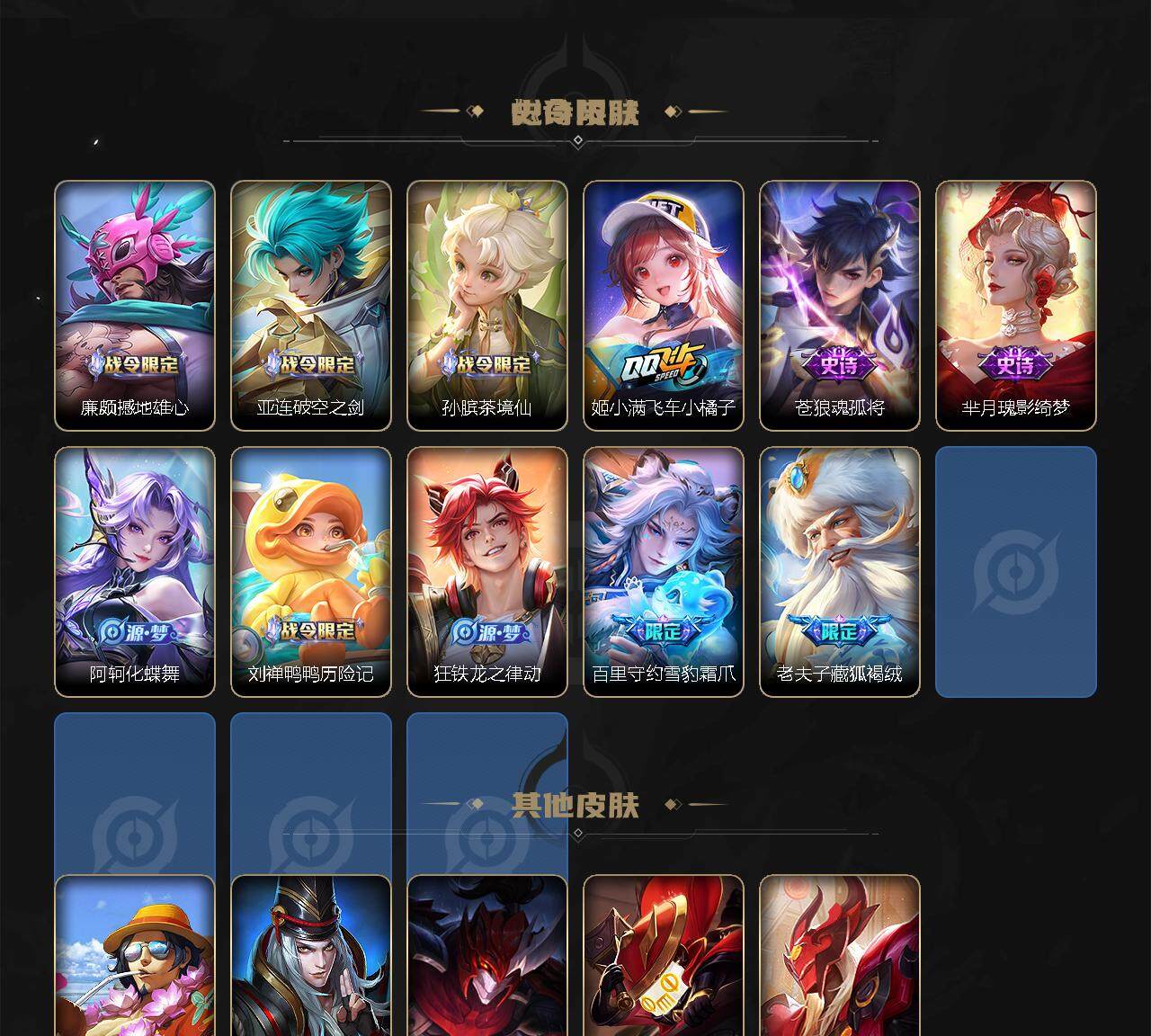 【史诗皮肤】:项羽职棒王牌,项羽苍穹之光,露娜紫霞仙子,赵云皇家上将,赵云未来纪元,貂蝉圣诞恋歌,甄姬冰雪圆舞曲,王昭君偶像歌手,狄仁杰魔术师,宫本武藏鬼剑武藏,孙尚香水果甜心,嬴政暗夜贵公子,嬴政摇滚巨星,妲己魅力维加斯,墨子龙骑士,墨子金属风暴,吕布圣诞狂欢,曹操幽灵船长,李白千年之狐,吕布末日机甲,张飞乱世虎臣,关羽冰锋战神,刘邦德古拉伯爵,韩信逐梦之影,夏侯惇乘风破浪,小乔缤纷独角兽,兰陵王暗隐猎兽者,诸葛亮黄金分割率,雅典娜冰冠公主,百里守约特工魅影,刘禅天才门将