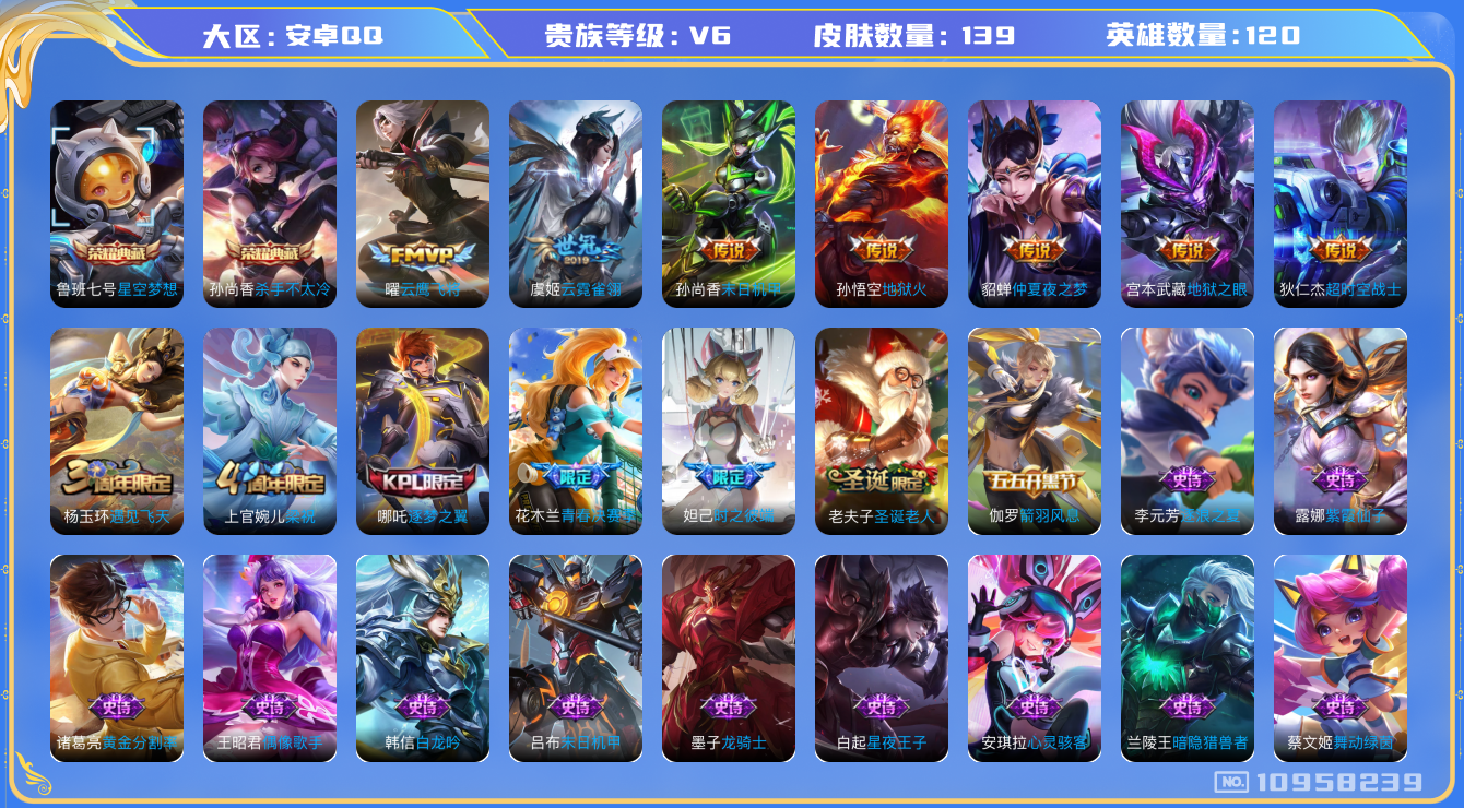 [10958239]【商品标题】:安卓Q-V6-永恒钻石III段位-120英雄-139皮肤-2典藏-0珍品无双-0无双-0珍品传说-7传说-30史诗
