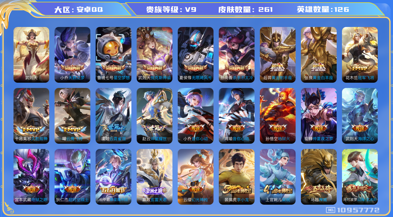 [10957772]【商品标题】:安卓Q-V9-至尊星耀I段位-126英雄-261皮肤-5典藏-0珍品无双-0无双-0珍品传说-23传说-62史诗