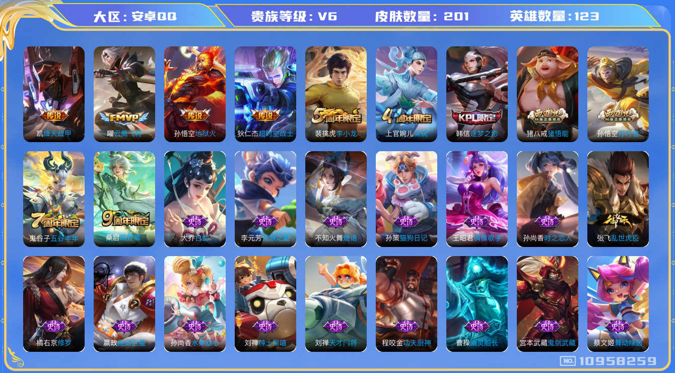 [10958259]【商品标题】:安卓Q-V6-尊贵铂金III段位-123英雄-201皮肤-0典藏-0珍品无双-0无双-0珍品传说-5传说-44史诗