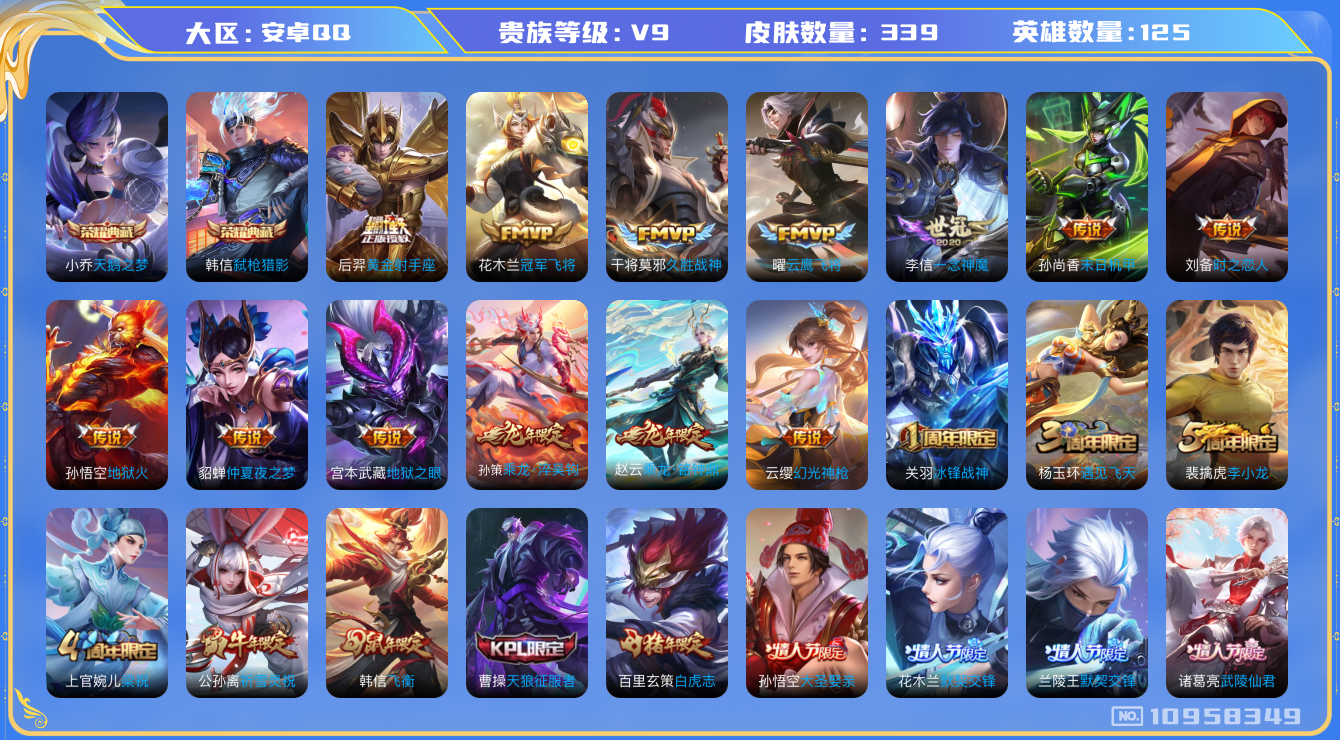[10958349]【商品标题】:安卓Q-V9-至尊星耀IV段位-125英雄-339皮肤-2典藏-0珍品无双-0无双-0珍品传说-23传说-95史诗