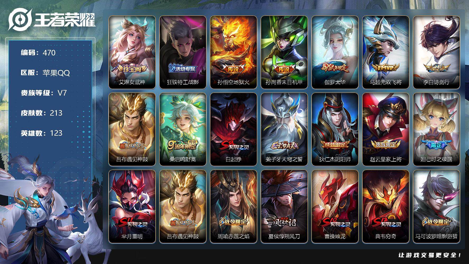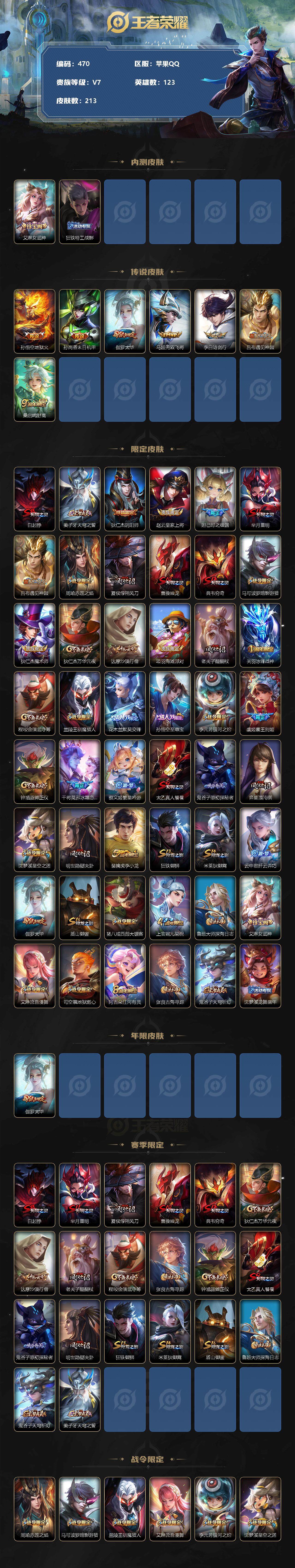 [10958322]【商品标题】:苹果Q-V7-永恒钻石I段位-123英雄-213皮肤-0典藏-0珍品无双-0无双-0珍品传说-7传说-52史诗
