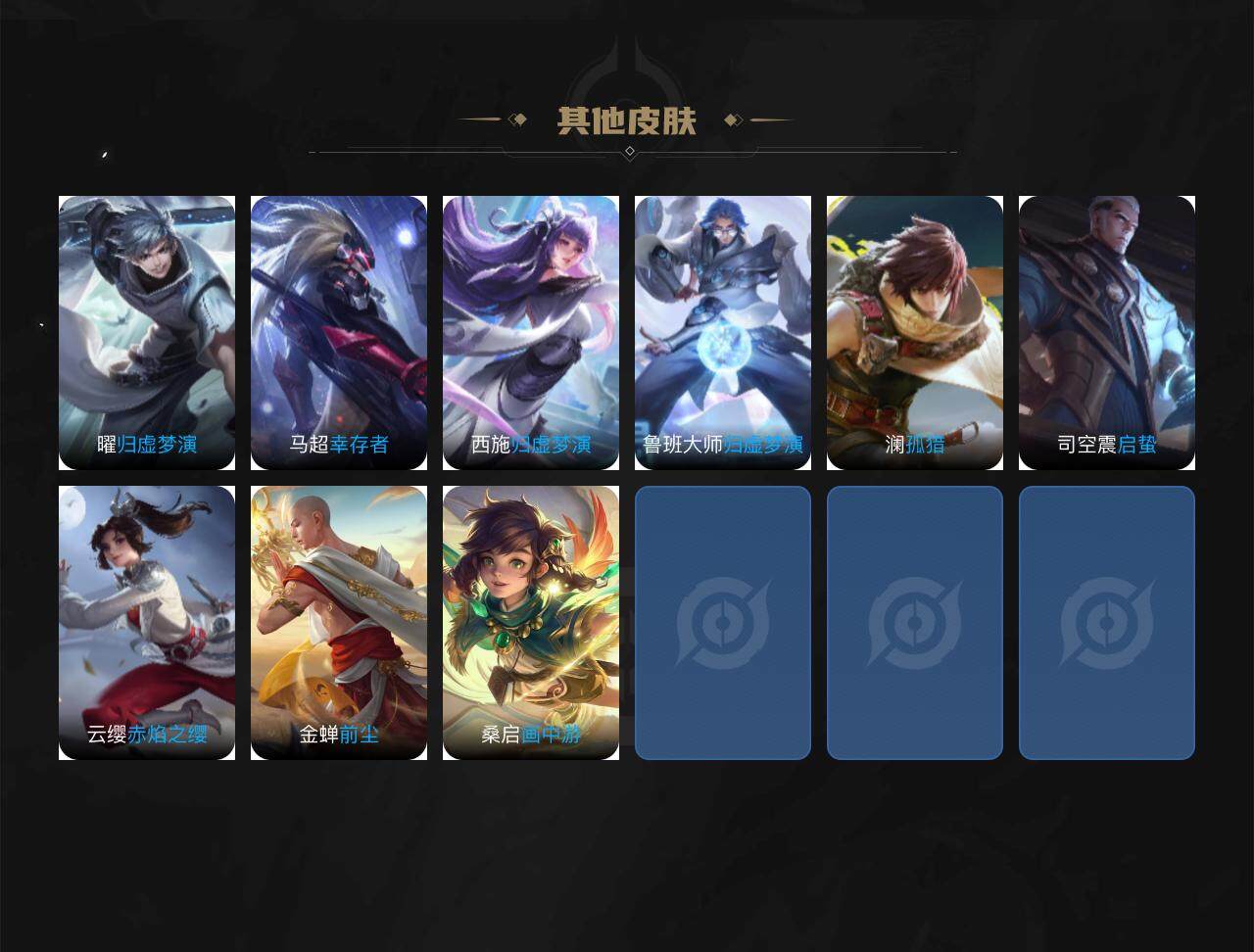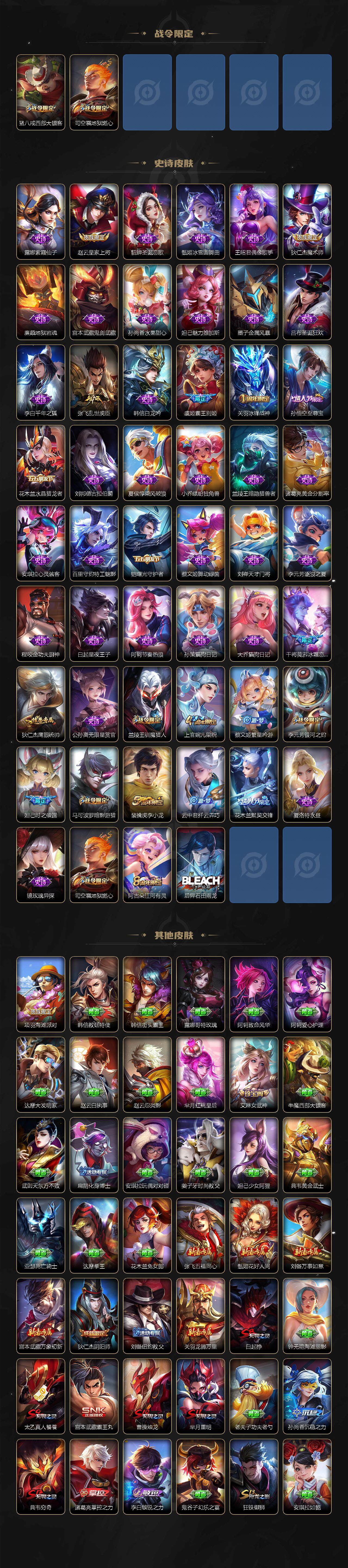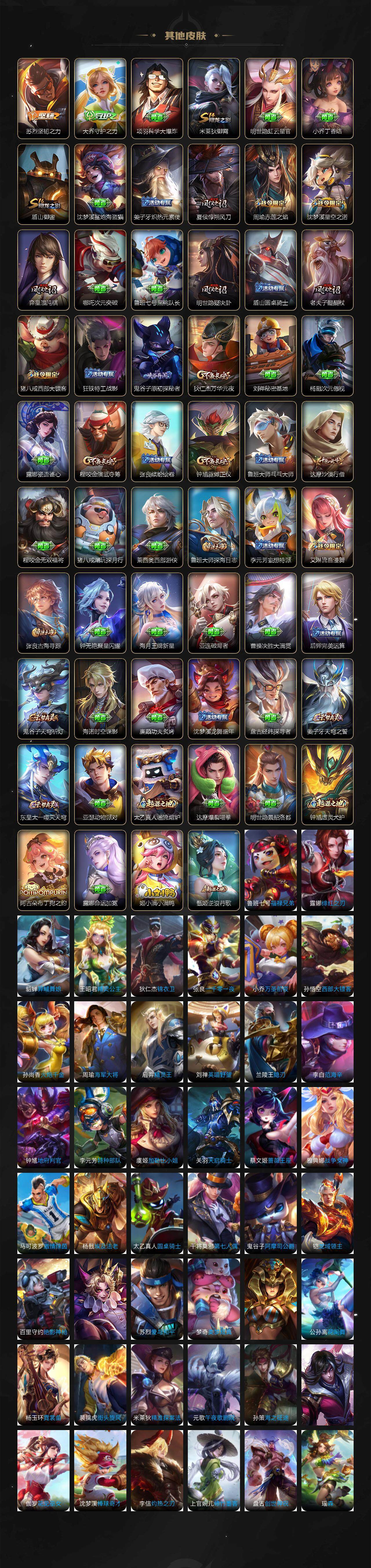 【限定皮肤】:白起狰,姜子牙天穹之誓,狄仁杰阴阳师,赵云皇家上将,妲己时之彼端,芈月重明,吕布遇见神鼓,周瑜赤莲之焰,夏侯惇朔风刀,曹操烛龙,典韦穷奇,马可波罗暗影游猎,狄仁杰魔术师,狄仁杰万华元夜,达摩沙漠行僧,项羽海滩派对,老夫子醍醐杖,关羽冰锋战神,程咬金演武夺筹,兰陵王驯魔猎人,花木兰默契交锋,孙悟空至尊宝,李元芳银河之约,虞姬霸王别姬,钟馗驱傩正仪,干将莫邪冰霜恋舞曲,蔡文姬繁星吟游,太乙真人饕餮,鬼谷子原初探秘者,弈星混沌棋,沈梦溪星空之诺,明世隐疑决卦,裴擒虎李小龙,狂铁御狮,米莱狄御霄,云中君纤云弄巧,伽罗太华,盾山御銮,猪八戒西部大镖客,上官婉儿梁祝,鲁班大师探海日志,艾琳女武神,艾琳流音漫舞,司空震地狱燃心,阿古朵江河有灵,张良古海寻踪,鬼谷子天穹祈灯,沈梦溪龙舞盛年