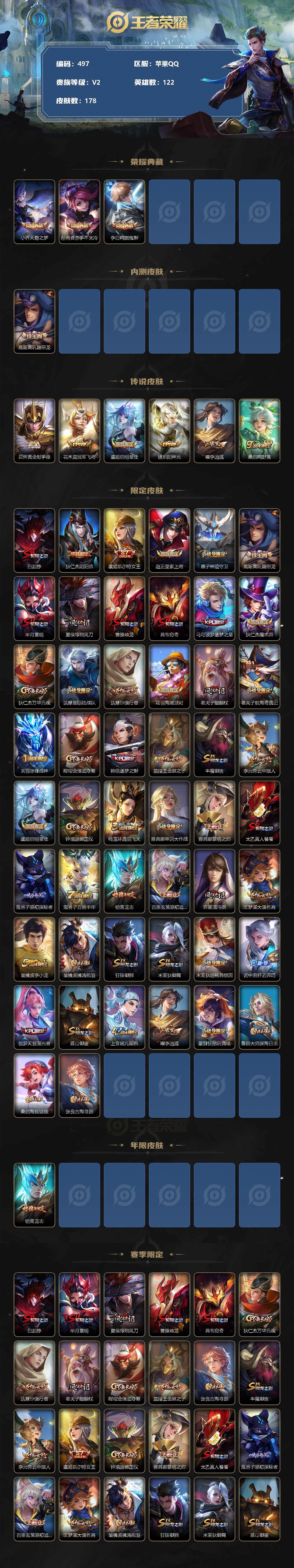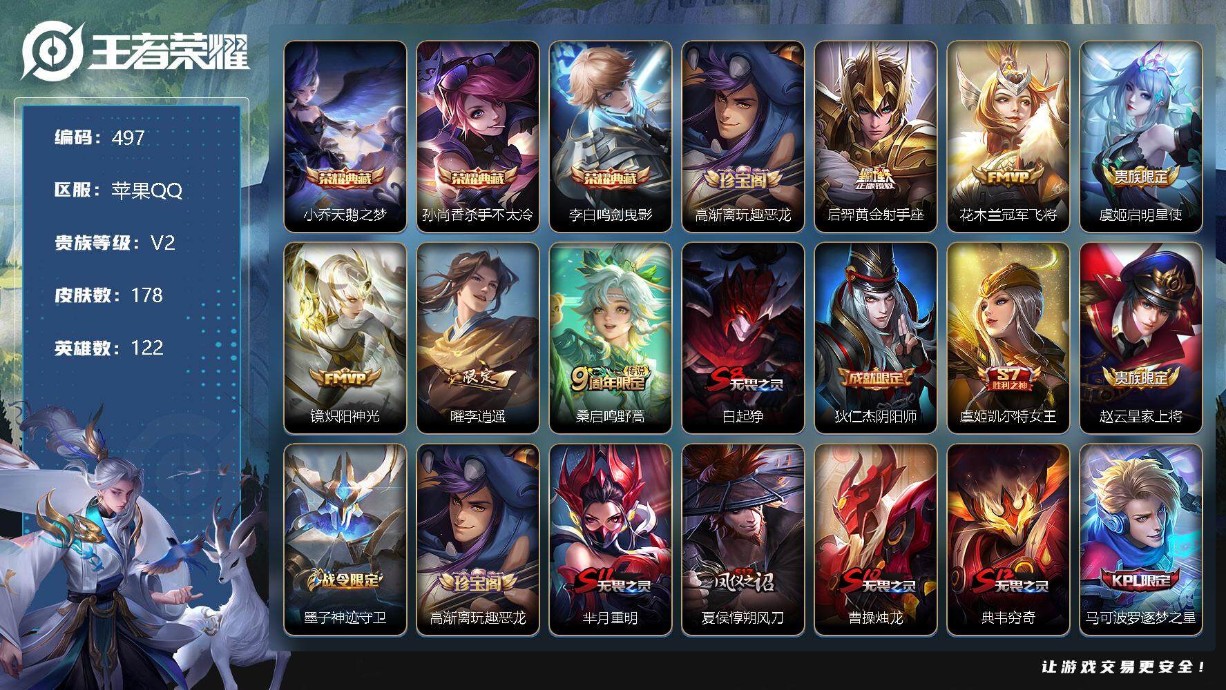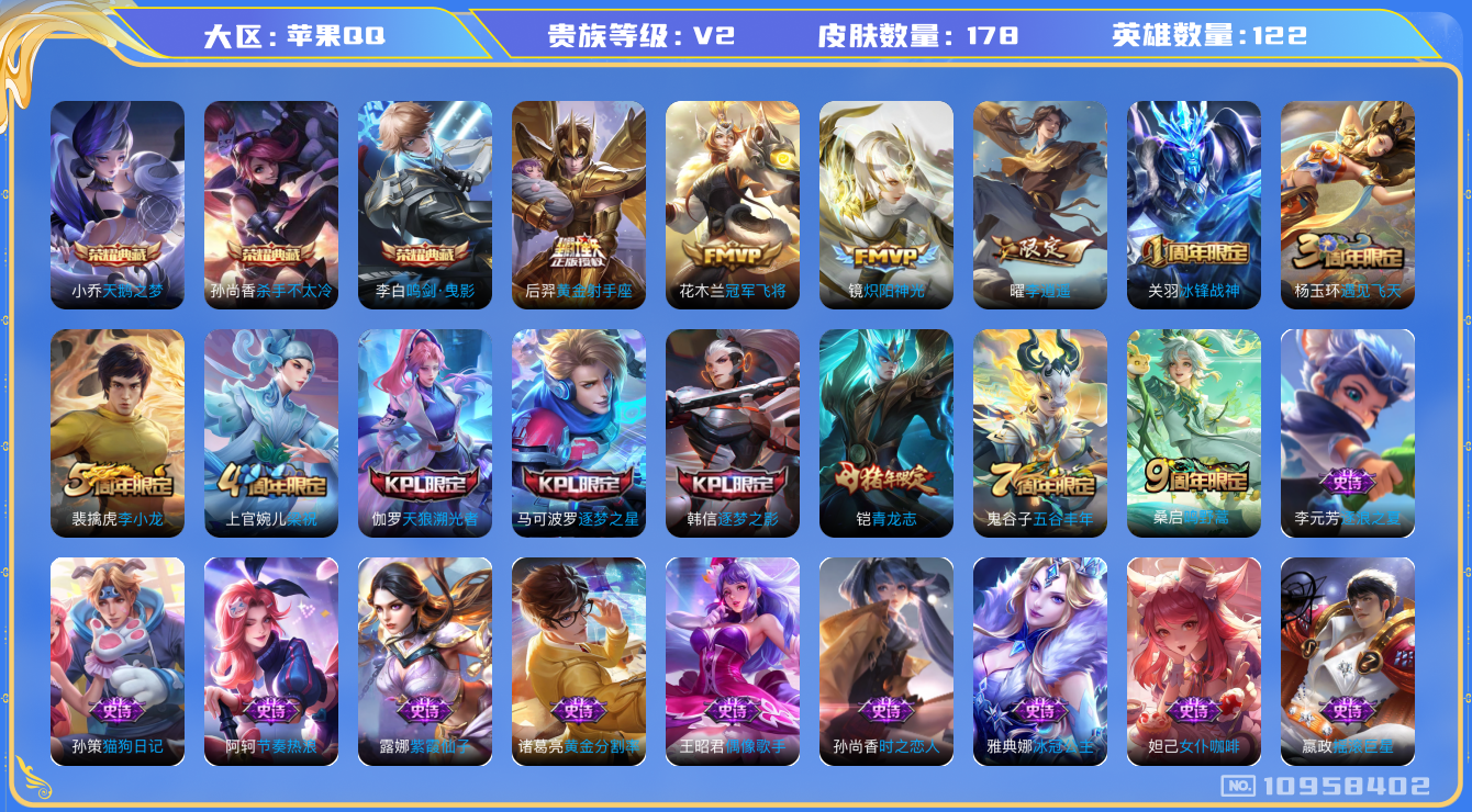 [10958402]【商品标题】:苹果Q-V2-尊贵铂金IV段位-122英雄-178皮肤-3典藏-0珍品无双-0无双-0珍品传说-6传说-45史诗