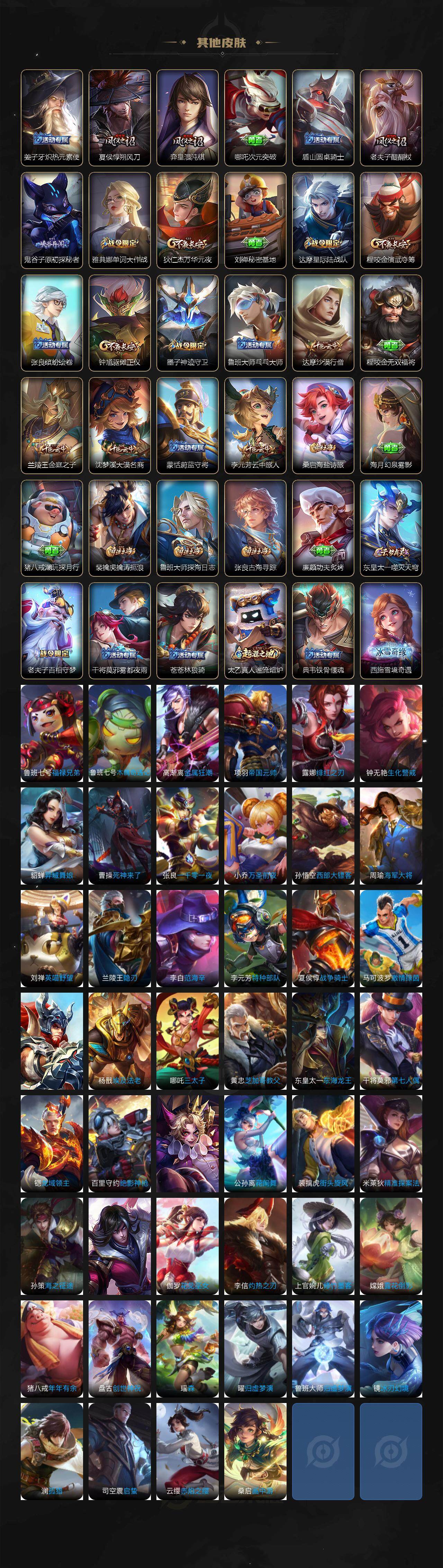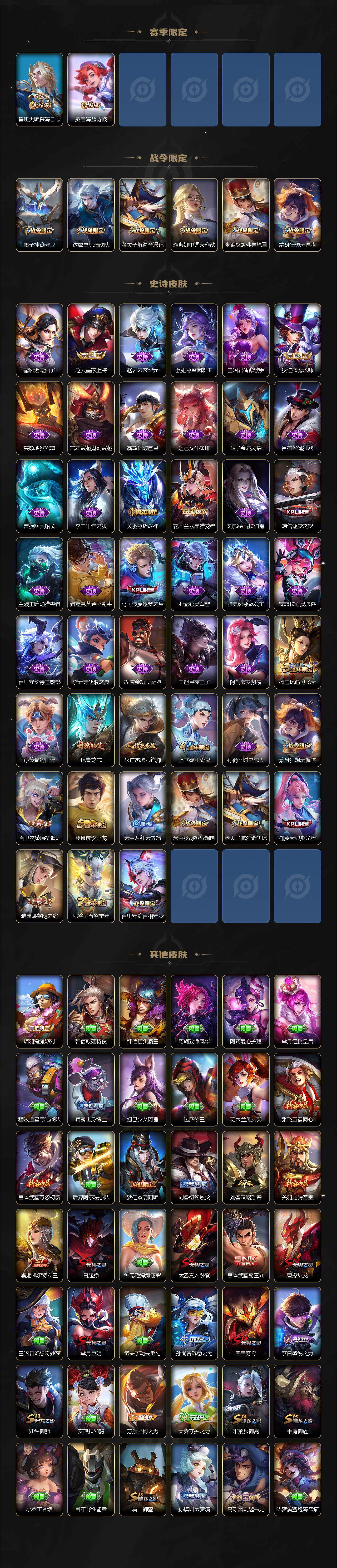 【限定皮肤】:白起狰,狄仁杰阴阳师,虞姬凯尔特女王,赵云皇家上将,墨子神迹守卫,高渐离玩趣恶龙,芈月重明,夏侯惇朔风刀,曹操烛龙,典韦穷奇,马可波罗逐梦之星,狄仁杰魔术师,狄仁杰万华元夜,达摩星际陆战队,达摩沙漠行僧,项羽海滩派对,老夫子醍醐杖,老夫子航海奇遇记,关羽冰锋战神,程咬金演武夺筹,韩信逐梦之影,兰陵王金庭之子,牛魔御旌,李元芳云中旅人,虞姬启明星使,钟馗驱傩正仪,杨玉环遇见飞天,雅典娜单词大作战,雅典娜黎明之约,太乙真人饕餮,鬼谷子原初探秘者,鬼谷子五谷丰年,铠青龙志,百里玄策原初追逐者,弈星混沌棋,沈梦溪大漠名商,裴擒虎李小龙,裴擒虎擒涛扼浪,狂铁御狮,米莱狄御霄,米莱狄胡桃异想国,云中君纤云弄巧,伽罗天狼溯光者,盾山御銮,上官婉儿梁祝,曜李逍遥 ,蒙犽狂想玩偶喵,鲁班大师探海日志,桑启海盐诗旅,张良古海寻踪