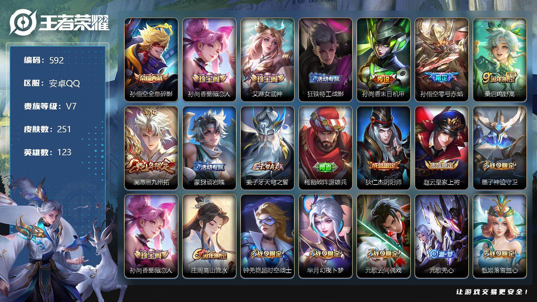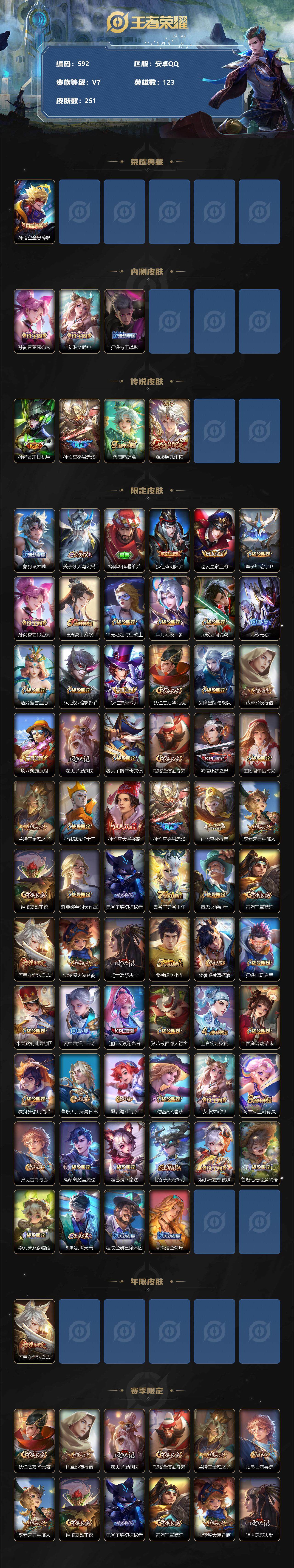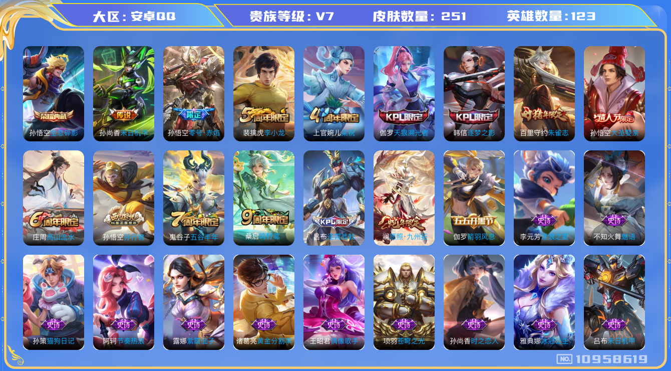 [10958619]【商品标题】:安卓Q-V7-最强王者段位-123英雄-251皮肤-1典藏-0珍品无双-0无双-0珍品传说-4传说-70史诗