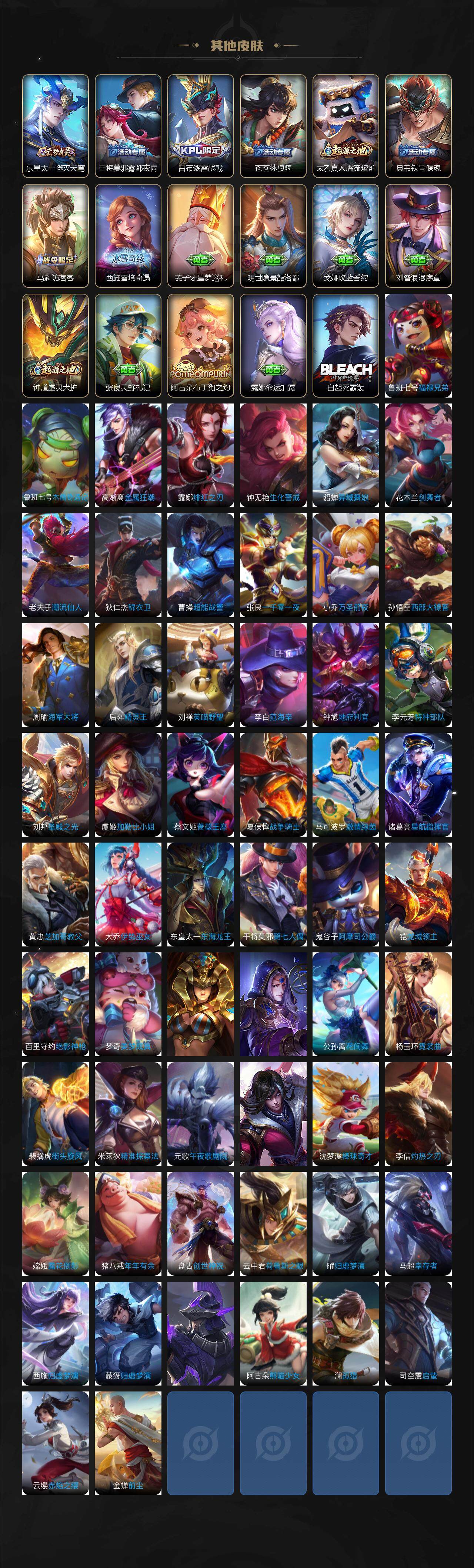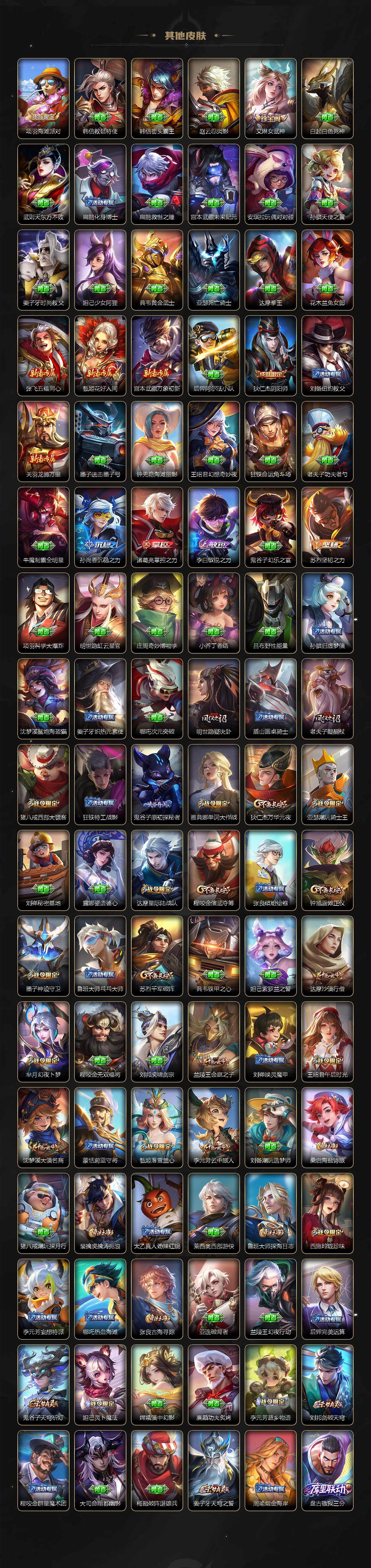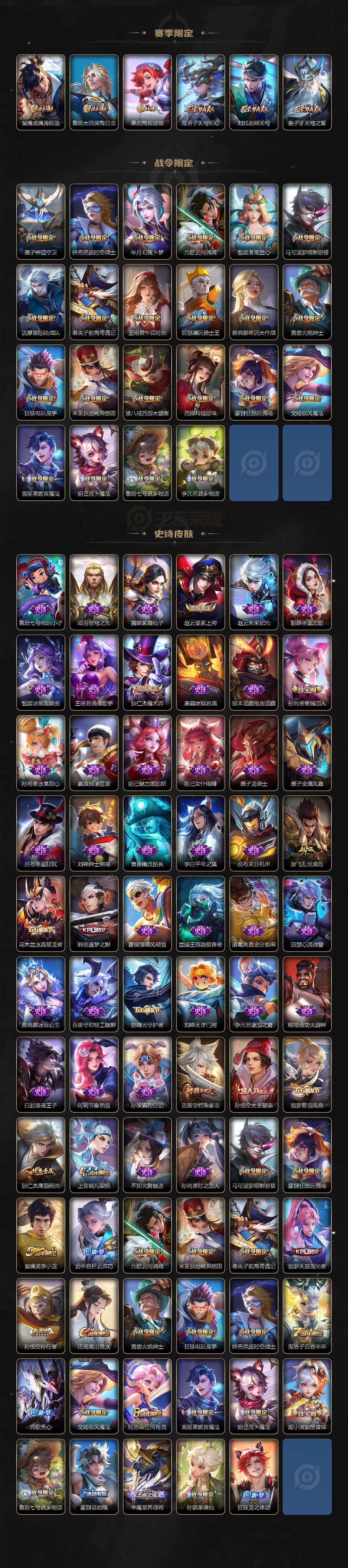 【赛季限定】:狄仁杰万华元夜,达摩沙漠行僧,老夫子醍醐杖,程咬金演武夺筹,兰陵王金庭之子,张良古海寻踪,李元芳云中旅人,钟馗驱傩正仪,鬼谷子原初探秘者,苏烈千军破阵,沈梦溪大漠名商,明世隐疑决卦,裴擒虎擒涛扼浪,鲁班大师探海日志,桑启海盐诗旅,鬼谷子天穹祈灯,刘邦剑破天穹,姜子牙天穹之誓