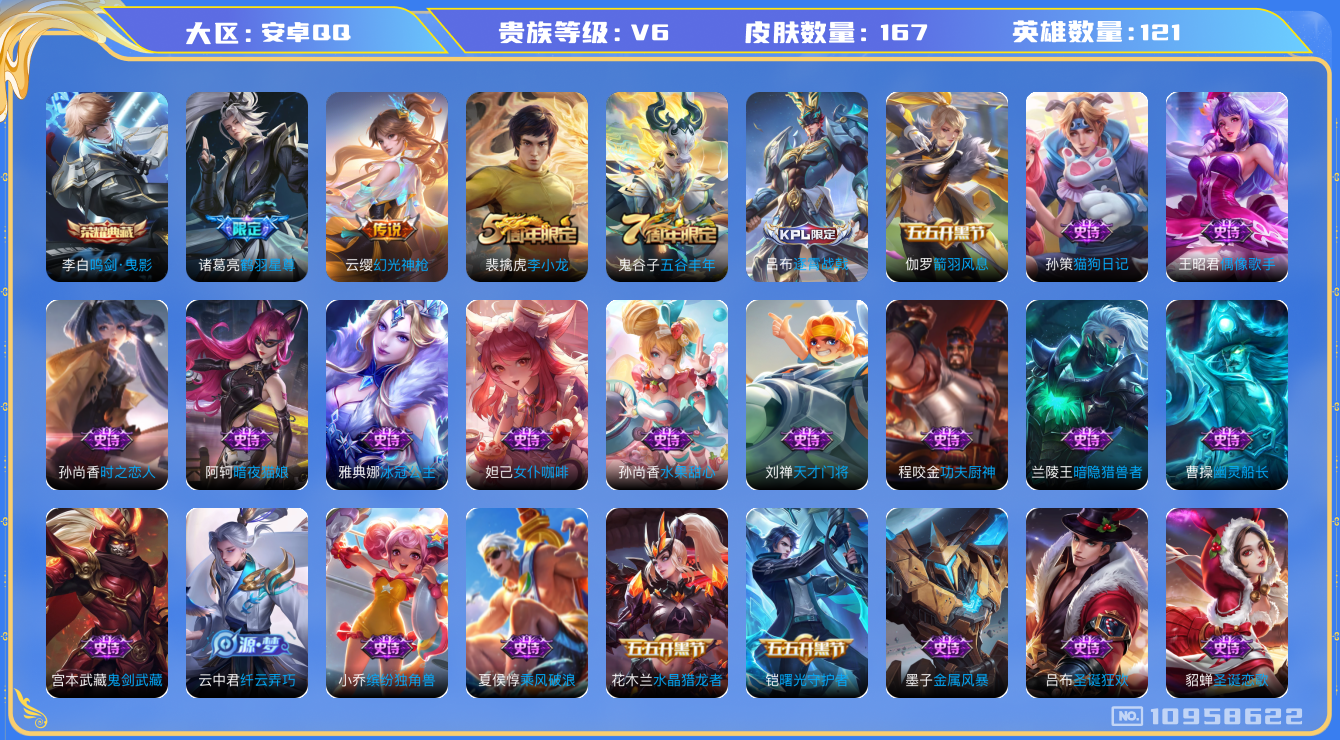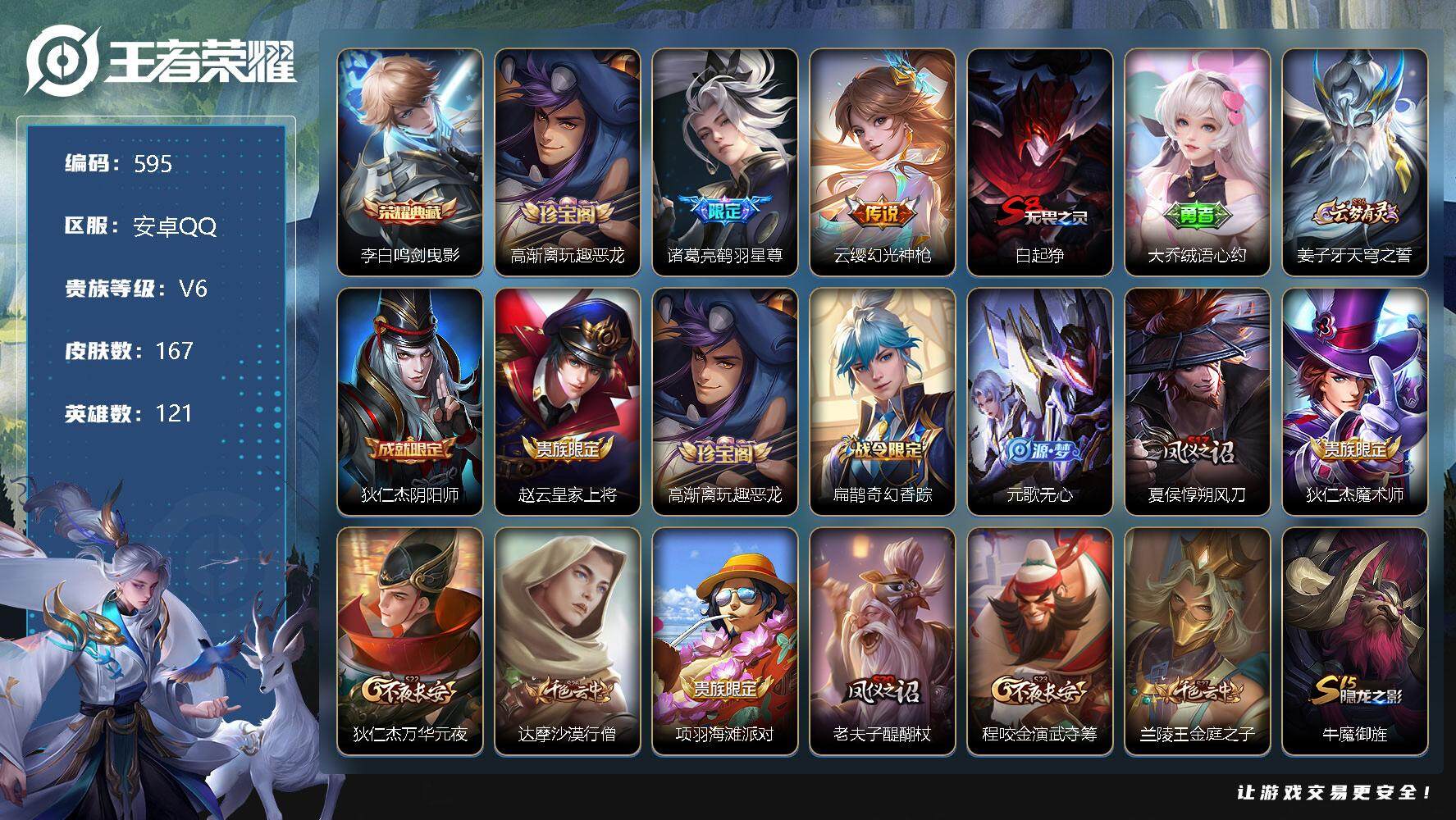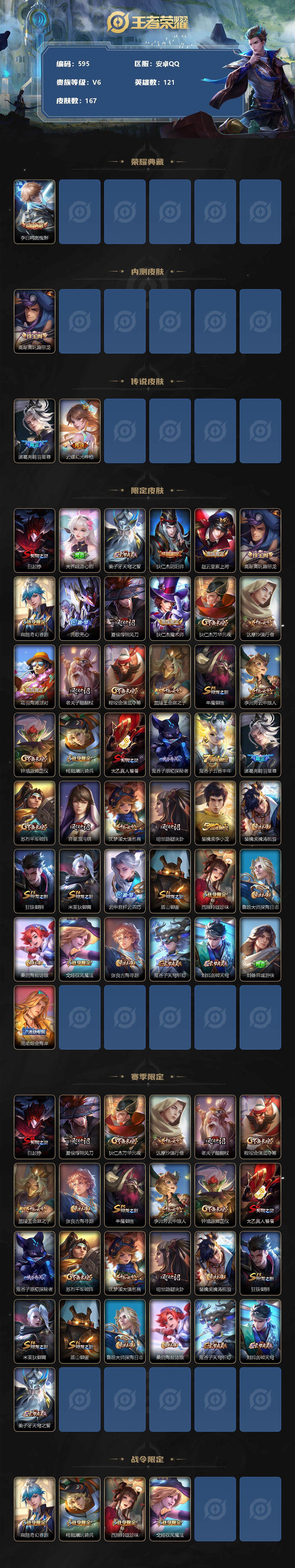 [10958622]【商品标题】:安卓Q-V6-尊贵铂金I段位-121英雄-167皮肤-1典藏-0珍品无双-0无双-0珍品传说-2传说-37史诗