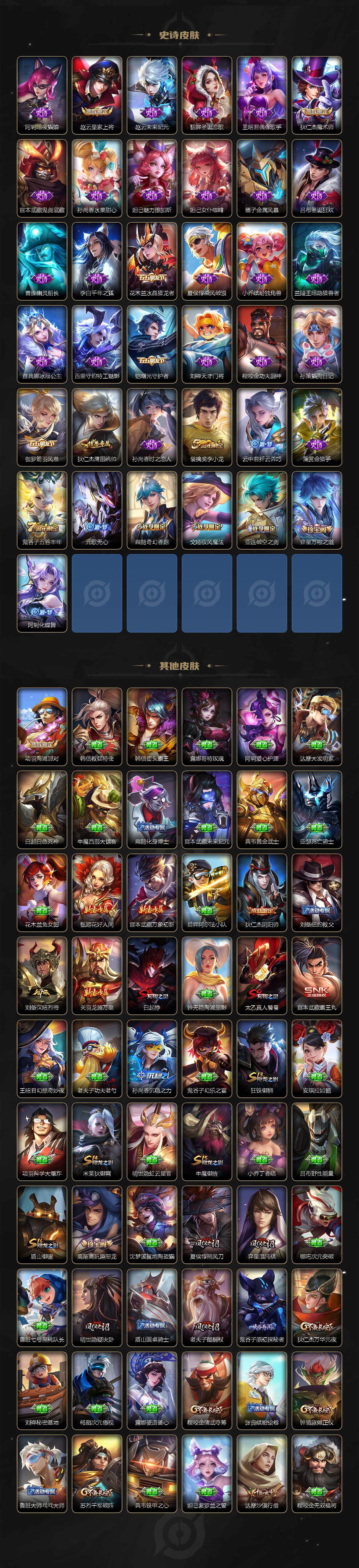 【史诗皮肤】:阿轲暗夜猫娘,赵云皇家上将,赵云未来纪元,貂蝉圣诞恋歌,王昭君偶像歌手,狄仁杰魔术师,宫本武藏鬼剑武藏,孙尚香水果甜心,妲己魅力维加斯,妲己女仆咖啡,墨子金属风暴,吕布圣诞狂欢,曹操幽灵船长,李白千年之狐,花木兰水晶猎龙者,夏侯惇乘风破浪,小乔缤纷独角兽,兰陵王暗隐猎兽者,雅典娜冰冠公主,百里守约特工魅影,铠曙光守护者,刘禅天才门将,程咬金功夫厨神,孙策猫狗日记,伽罗箭羽风息,狄仁杰鹰眼统帅,孙尚香时之恋人,裴擒虎李小龙,云中君纤云弄巧,澜赏金猎手,鬼谷子五谷丰年,元歌无心,扁鹊奇幻香踪,戈娅驭风魔法,亚连破空之剑,弈星万物之道,阿轲化蝶舞