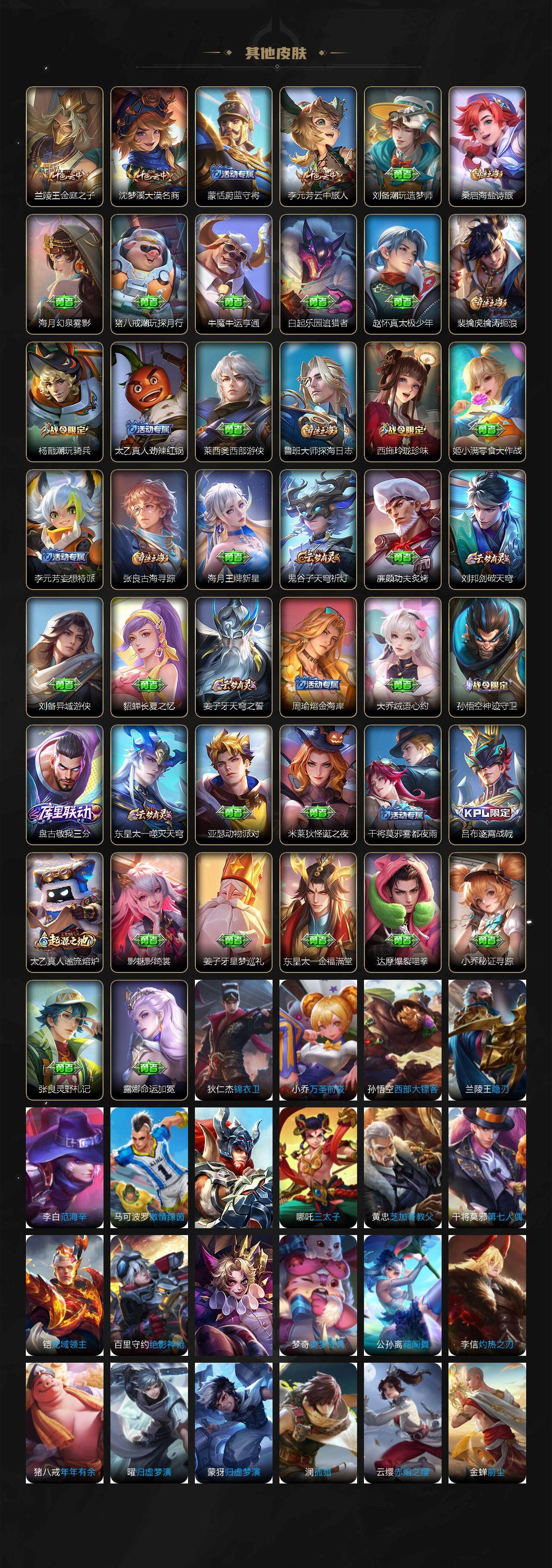 【赛季限定】:白起狰,夏侯惇朔风刀,狄仁杰万华元夜,达摩沙漠行僧,老夫子醍醐杖,程咬金演武夺筹,兰陵王金庭之子,张良古海寻踪,牛魔御旌,李元芳云中旅人,钟馗驱傩正仪,太乙真人饕餮,鬼谷子原初探秘者,苏烈千军破阵,弈星混沌棋,沈梦溪大漠名商,明世隐疑决卦,裴擒虎擒涛扼浪,狂铁御狮,米莱狄御霄,盾山御銮,鲁班大师探海日志,桑启海盐诗旅,鬼谷子天穹祈灯,刘邦剑破天穹,姜子牙天穹之誓