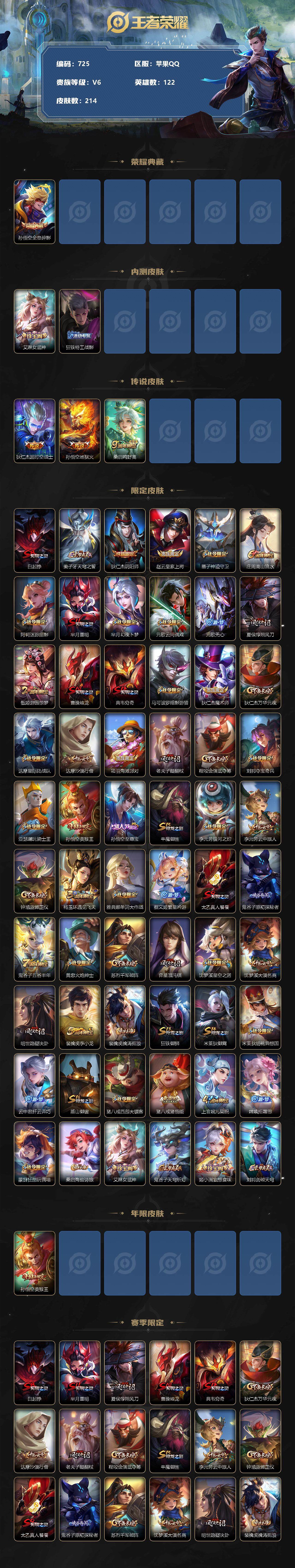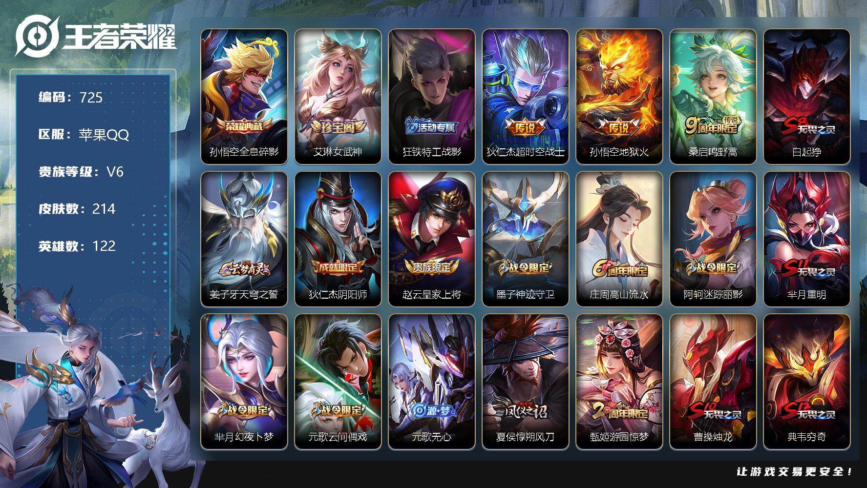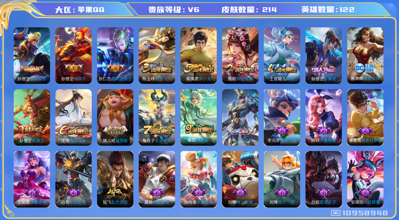 [10958948]【商品标题】:苹果Q-V6-永恒钻石IV段位-122英雄-214皮肤-1典藏-0珍品无双-0无双-0珍品传说-3传说-54史诗
