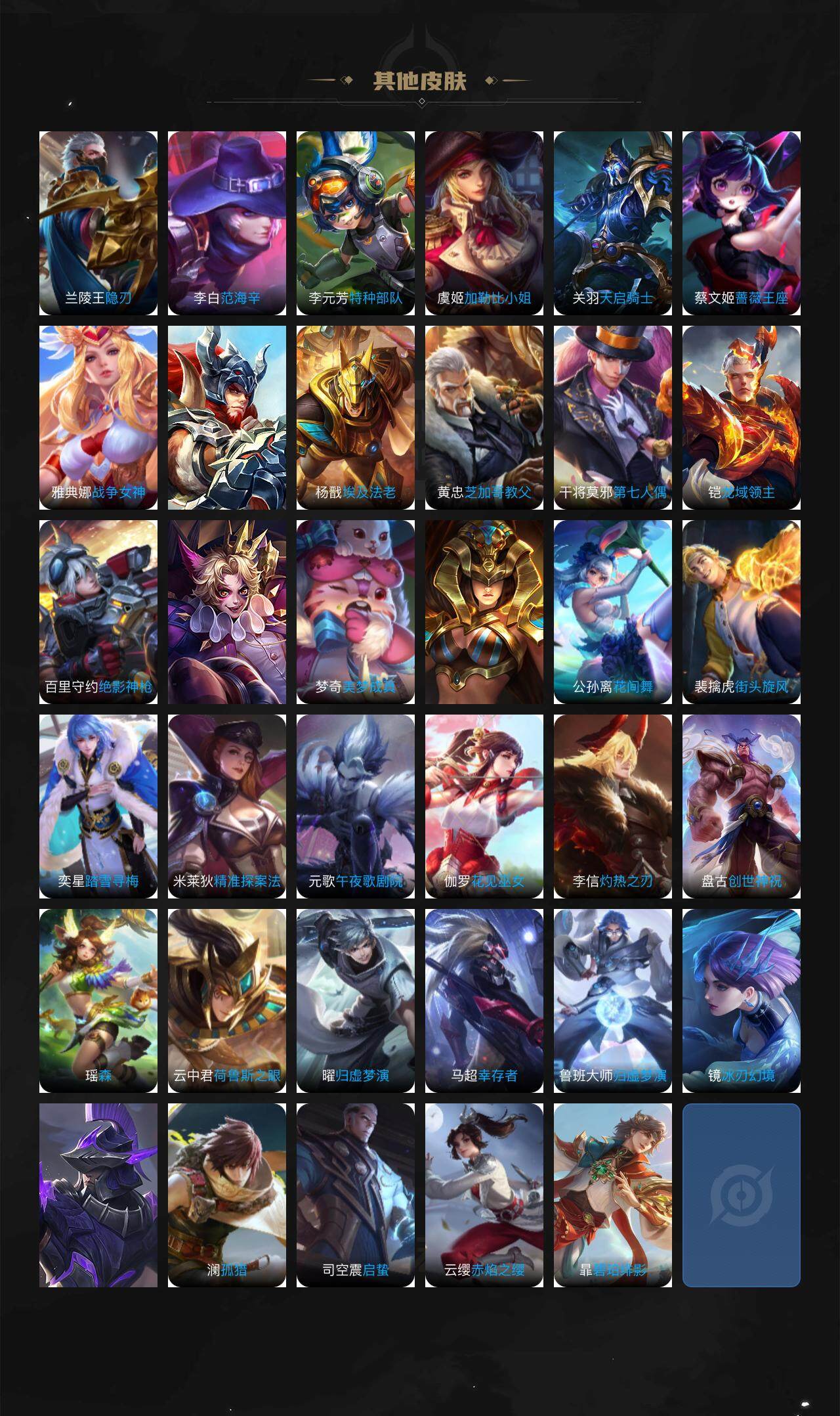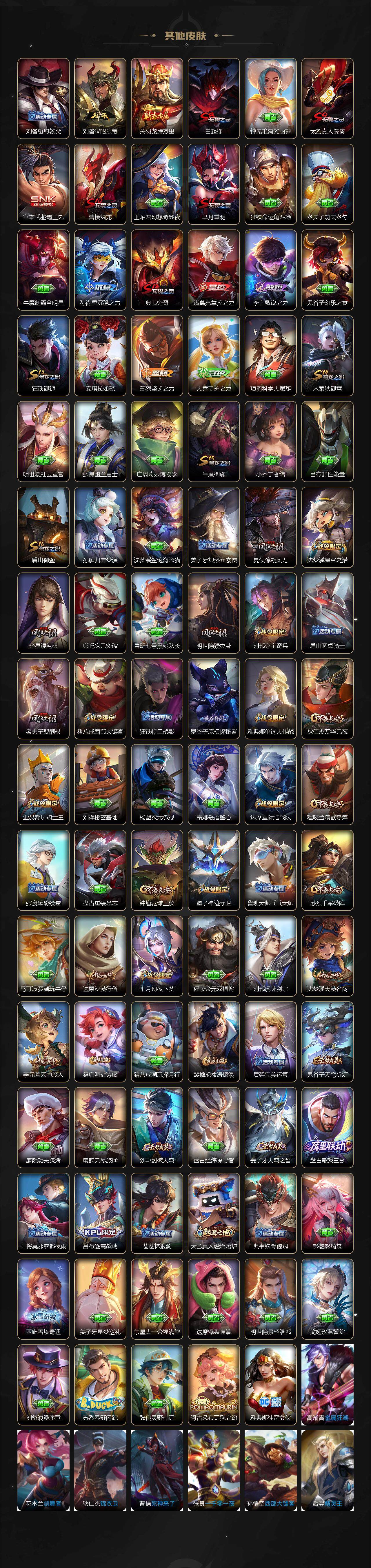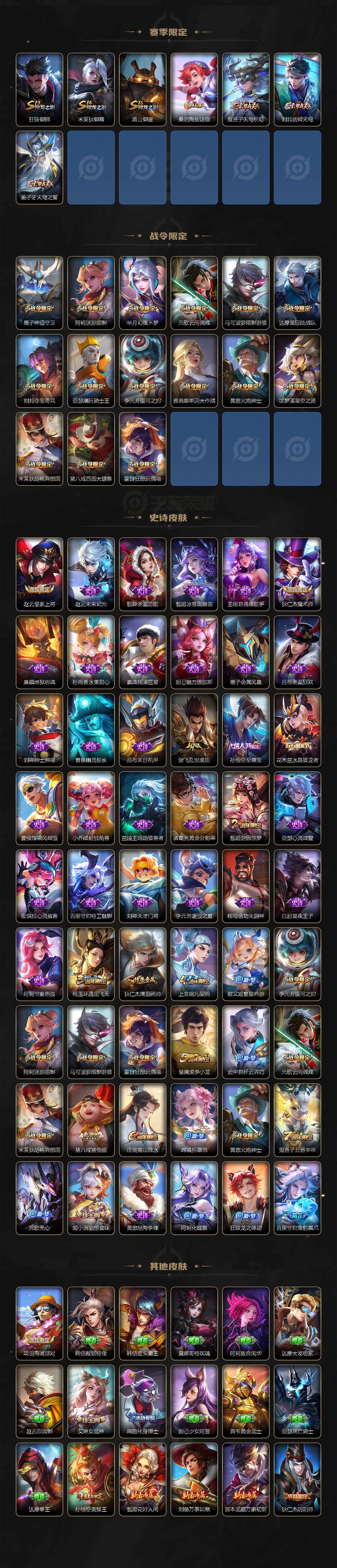 【限定皮肤】:白起狰,姜子牙天穹之誓,狄仁杰阴阳师,赵云皇家上将,墨子神迹守卫,庄周高山流水,阿轲迷踪丽影,芈月重明,芈月幻夜卜梦,元歌云间偶戏,元歌无心,夏侯惇朔风刀,甄姬游园惊梦,曹操烛龙,典韦穷奇,马可波罗暗影游猎,狄仁杰魔术师,狄仁杰万华元夜,达摩星际陆战队,达摩沙漠行僧,项羽海滩派对,老夫子醍醐杖,程咬金演武夺筹,刘邦夺宝奇兵,亚瑟潮玩骑士王,孙悟空美猴王,孙悟空至尊宝,牛魔御旌,李元芳银河之约,李元芳云中旅人,钟馗驱傩正仪,杨玉环遇见飞天,雅典娜单词大作战,蔡文姬繁星吟游,太乙真人饕餮,鬼谷子原初探秘者,鬼谷子五谷丰年,黄忠火炮绅士,苏烈千军破阵,弈星混沌棋,沈梦溪星空之诺,沈梦溪大漠名商,明世隐疑决卦,裴擒虎李小龙,裴擒虎擒涛扼浪,狂铁御狮,米莱狄御霄,米莱狄胡桃异想国,云中君纤云弄巧,盾山御銮,猪八戒西部大镖客,猪八戒猪悟能,上官婉儿梁祝,嫦娥拒霜思,蒙犽狂想玩偶喵,桑启海盐诗旅,艾琳女武神,鬼谷子天穹祈灯,姬小满妄想食味,刘邦剑破天穹