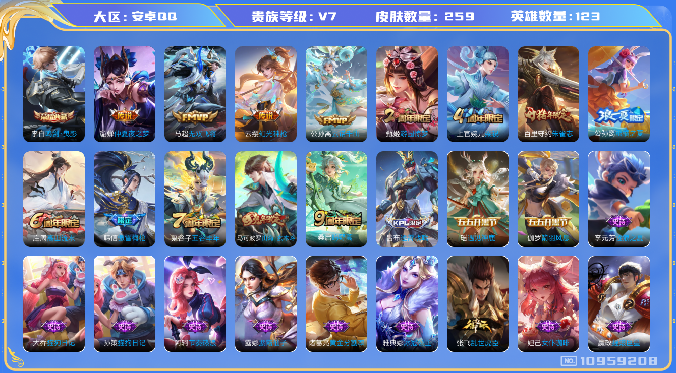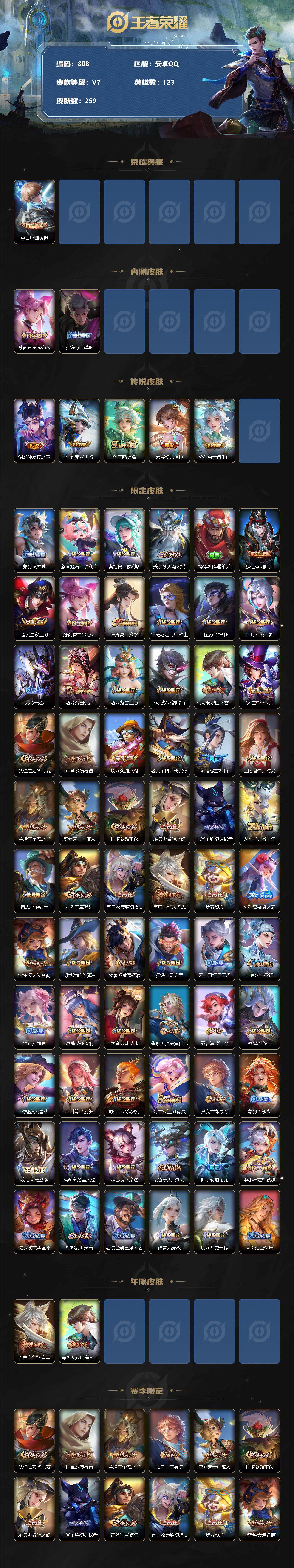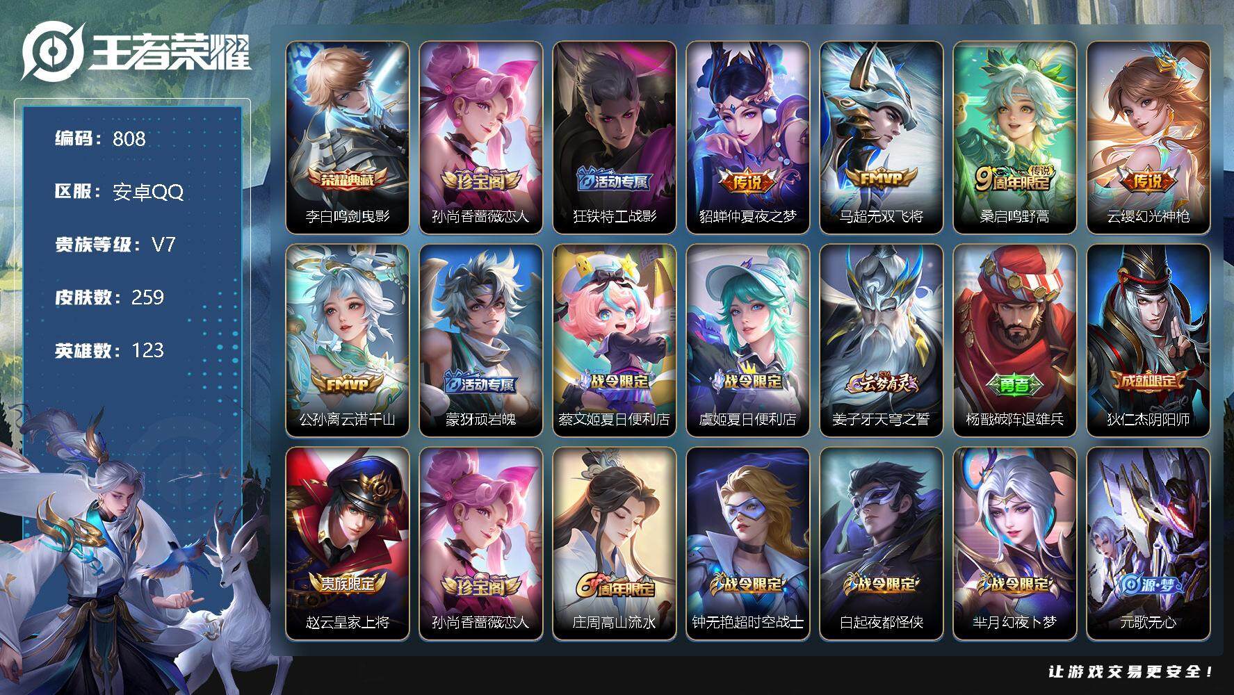 [10959208]【商品标题】:安卓Q-V5-至尊星耀II段位-123英雄-259皮肤-1典藏-0珍品无双-0无双-0珍品传说-5传说-78史诗