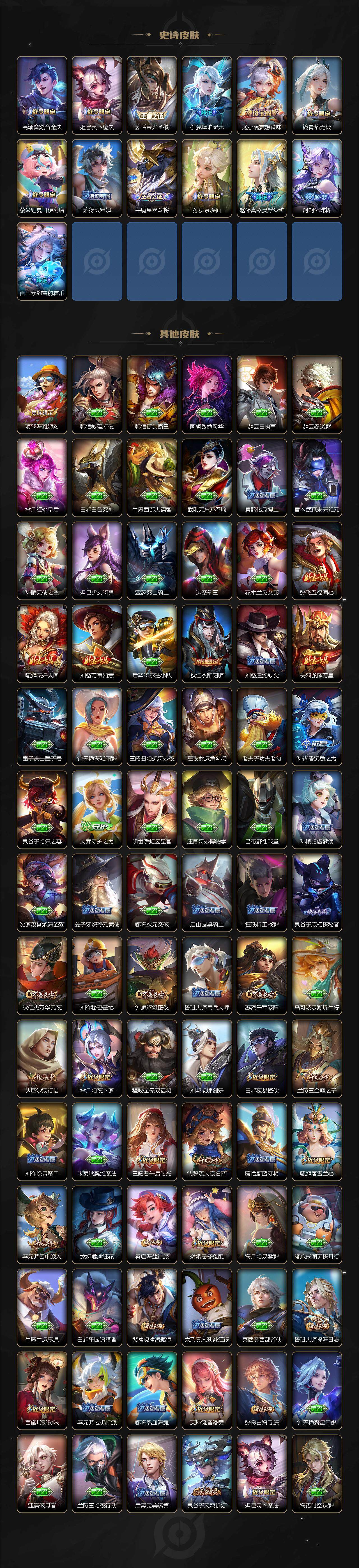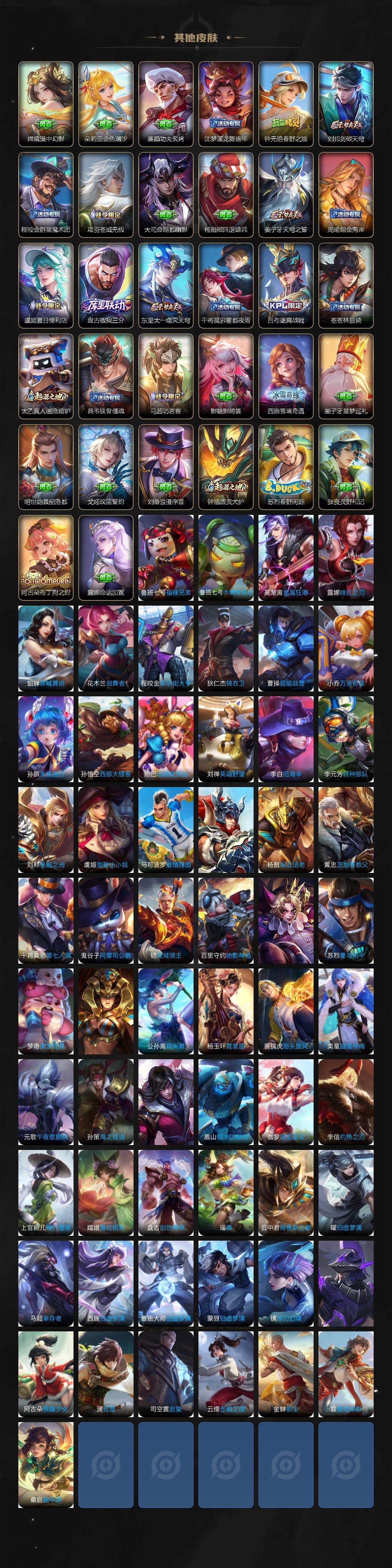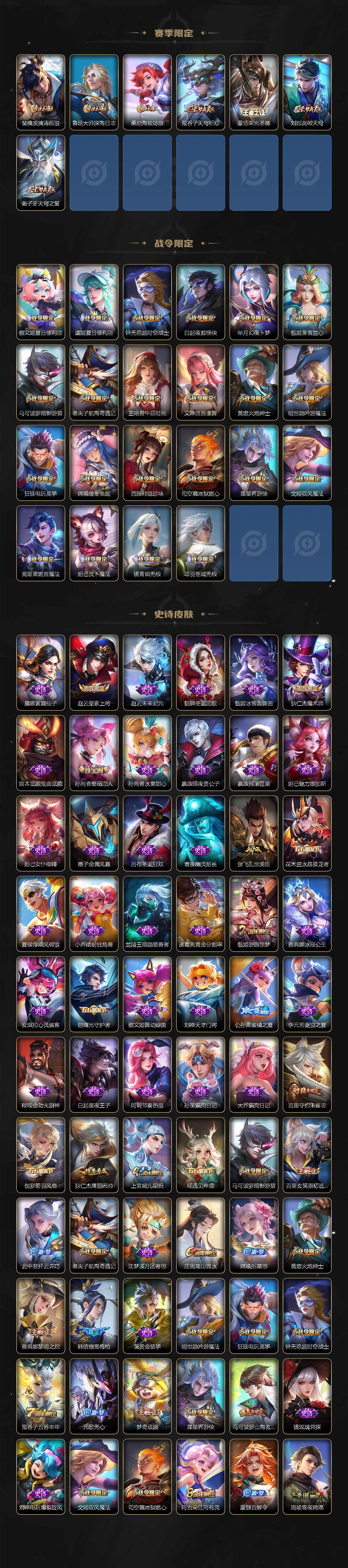 【限定皮肤】:蒙犽顽岩魄,蔡文姬夏日便利店,虞姬夏日便利店,姜子牙天穹之誓,杨戬破阵退雄兵,狄仁杰阴阳师,赵云皇家上将,孙尚香蔷薇恋人,庄周高山流水,钟无艳超时空战士,白起夜都怪侠,芈月幻夜卜梦,元歌无心,甄姬游园惊梦,甄姬落雪兰心,马可波罗暗影游猎,马可波罗山海玄木吟,狄仁杰魔术师,狄仁杰万华元夜,达摩沙漠行僧,项羽海滩派对,老夫子航海奇遇记,韩信傲雪梅枪,王昭君午后时光,兰陵王金庭之子,李元芳云中旅人,钟馗驱傩正仪,雅典娜黎明之约,鬼谷子原初探秘者,鬼谷子五谷丰年,黄忠火炮绅士,苏烈千军破阵,百里玄策原初追逐者,百里守约朱雀志,梦奇顽趣,公孙离蜜橘之夏,沈梦溪大漠名商,明世隐吟游魔法,裴擒虎擒涛扼浪,狂铁电玩高手,云中君纤云弄巧,上官婉儿梁祝,嫦娥拒霜思,嫦娥暖冬兔眠,西施玲珑珍味,鲁班大师探海日志,桑启海盐诗旅,暃星界游侠,戈娅驭风魔法,艾琳流音漫舞,司空震地狱燃心,阿古朵江河有灵,张良古海寻踪,蒙犽百解令,蒙恬荣光圣徽,高渐离燃音魔法,妲己灵卜魔法,鬼谷子天穹祈灯,伽罗琥珀纪元,姬小满妄想食味,沈梦溪龙舞盛年,刘邦剑破天穹,程咬金群星魔术团,镜青焰无极,项羽苍威无极,周瑜熔金海岸