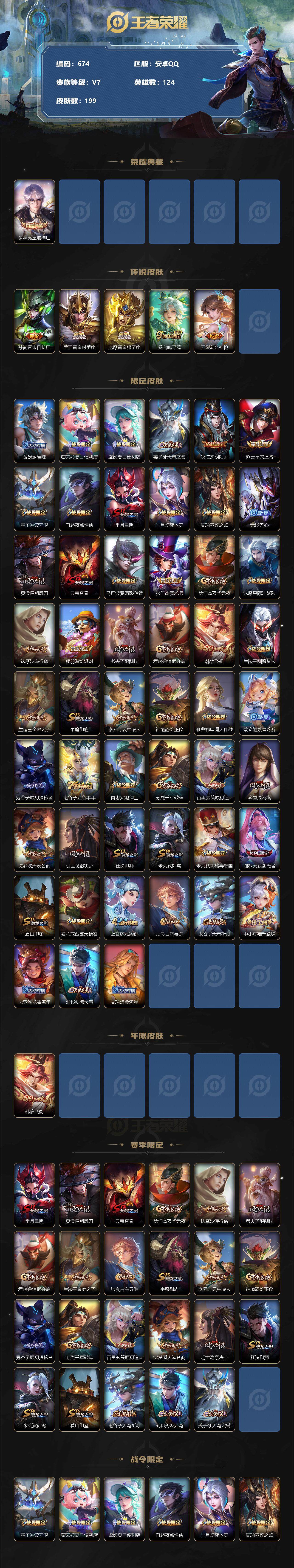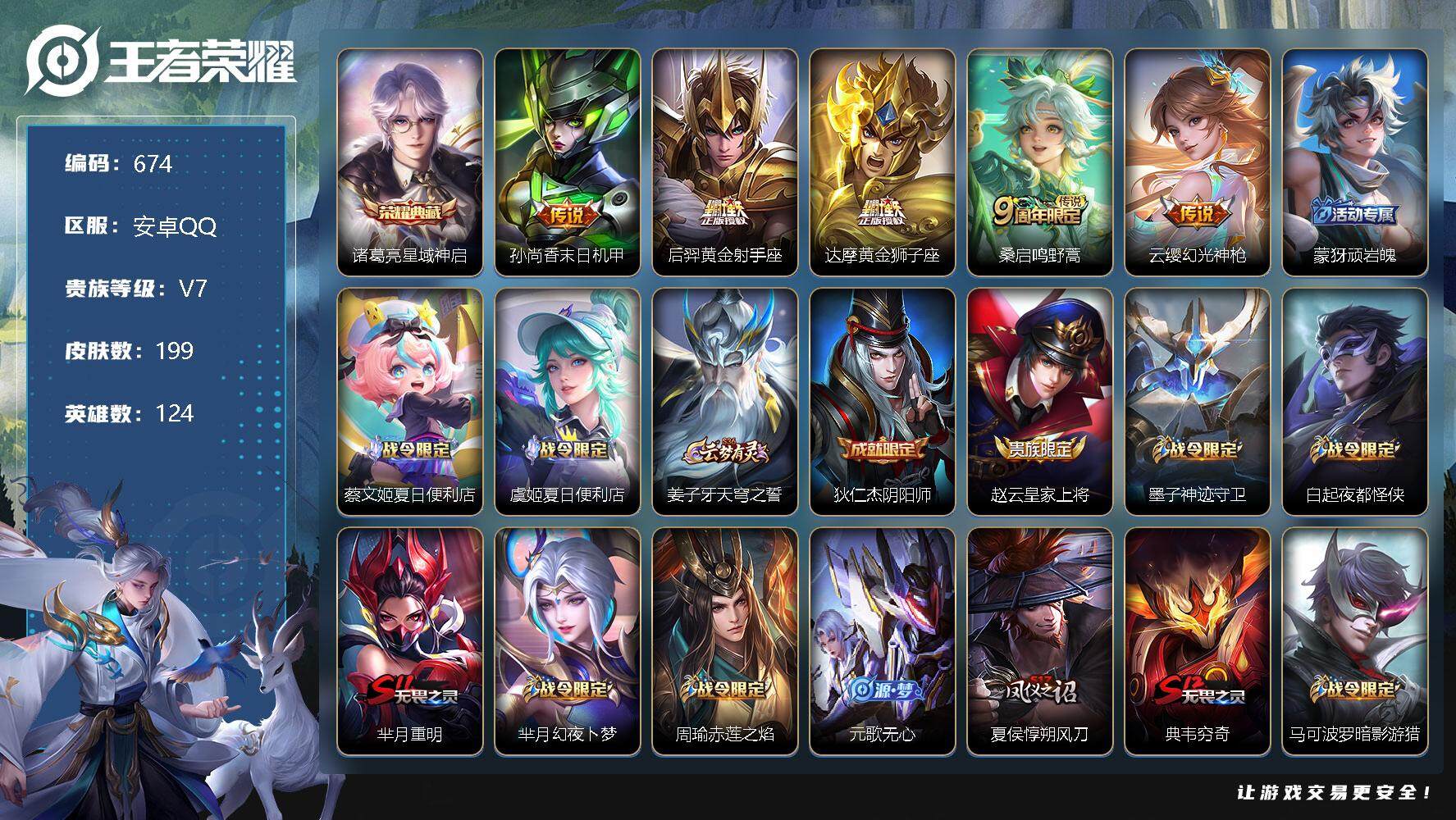 [10958812]【商品标题】:安卓Q-V7-最强王者段位-124英雄-199皮肤-1典藏-0珍品无双-0无双-0珍品传说-5传说-40史诗