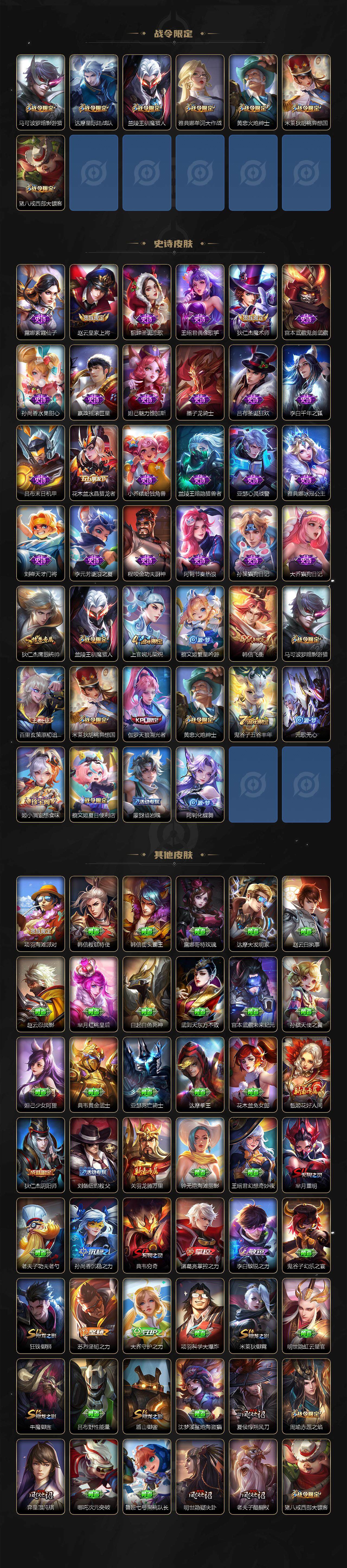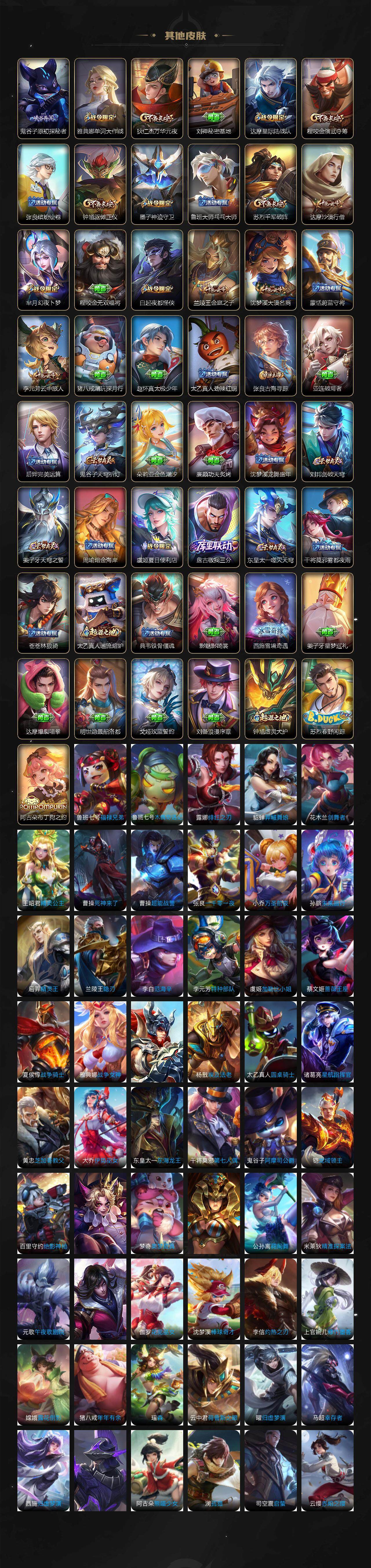 【限定皮肤】:蒙犽顽岩魄,蔡文姬夏日便利店,虞姬夏日便利店,姜子牙天穹之誓,狄仁杰阴阳师,赵云皇家上将,墨子神迹守卫,白起夜都怪侠,芈月重明,芈月幻夜卜梦,周瑜赤莲之焰,元歌无心,夏侯惇朔风刀,典韦穷奇,马可波罗暗影游猎,狄仁杰魔术师,狄仁杰万华元夜,达摩星际陆战队,达摩沙漠行僧,项羽海滩派对,老夫子醍醐杖,程咬金演武夺筹,韩信飞衡,兰陵王驯魔猎人,兰陵王金庭之子,牛魔御旌,李元芳云中旅人,钟馗驱傩正仪,雅典娜单词大作战,蔡文姬繁星吟游,鬼谷子原初探秘者,鬼谷子五谷丰年,黄忠火炮绅士,苏烈千军破阵,百里玄策原初追逐者,弈星混沌棋,沈梦溪大漠名商,明世隐疑决卦,狂铁御狮,米莱狄御霄,米莱狄胡桃异想国,伽罗天狼溯光者,盾山御銮,猪八戒西部大镖客,上官婉儿梁祝,张良古海寻踪,鬼谷子天穹祈灯,姬小满妄想食味,沈梦溪龙舞盛年,刘邦剑破天穹,周瑜熔金海岸