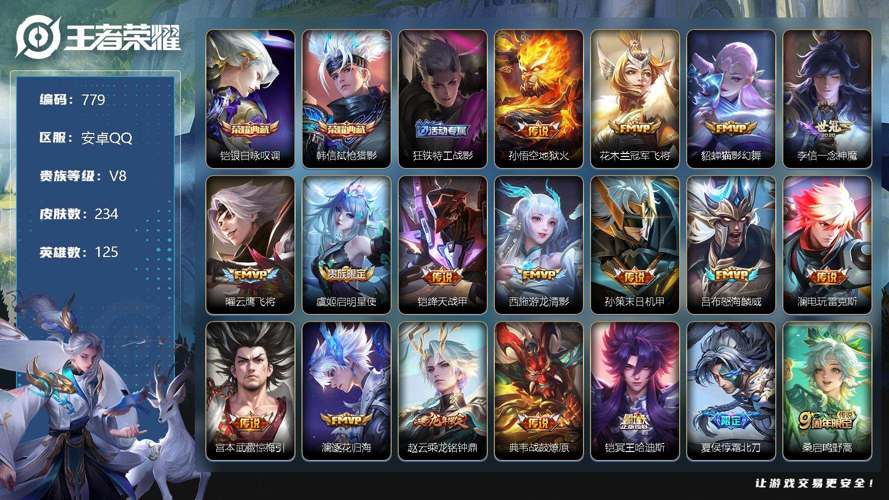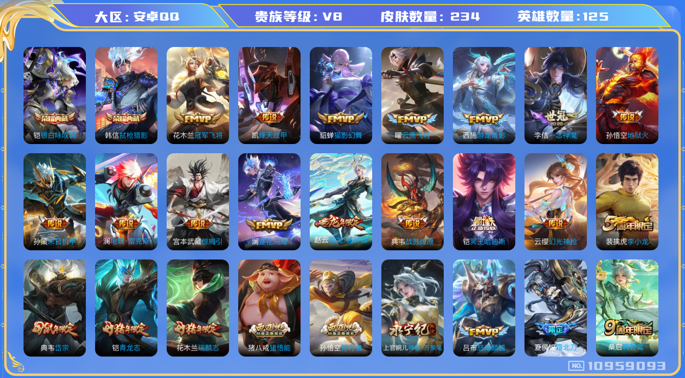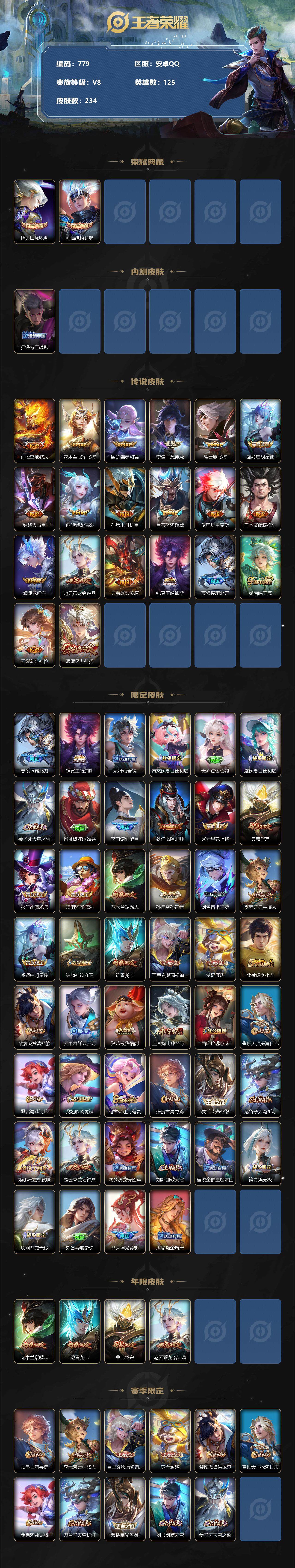 [10959093]【商品标题】:安卓Q-V8-至尊星耀II段位-125英雄-234皮肤-2典藏-0珍品无双-0无双-0珍品传说-20传说-75史诗