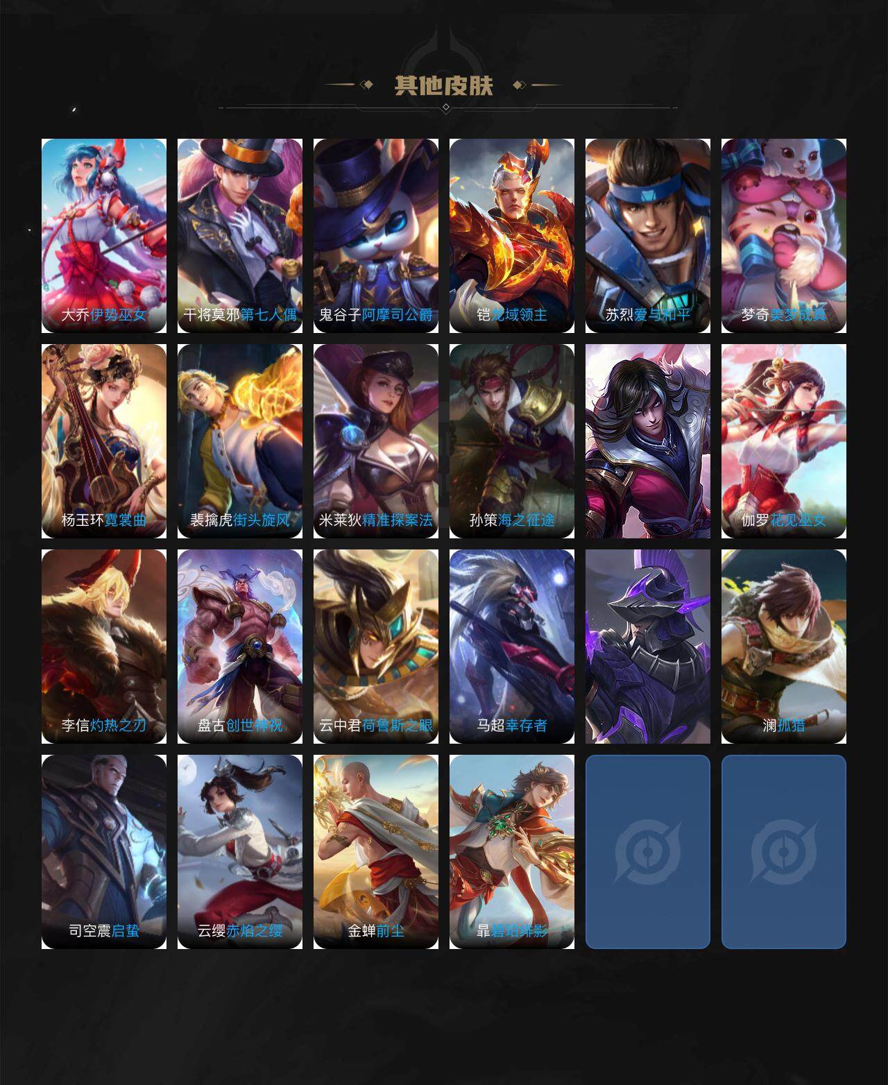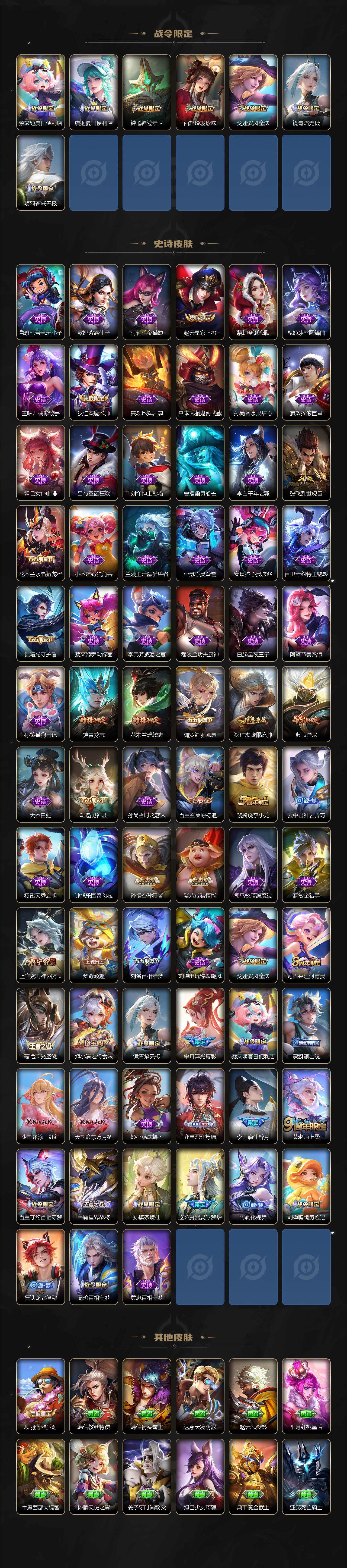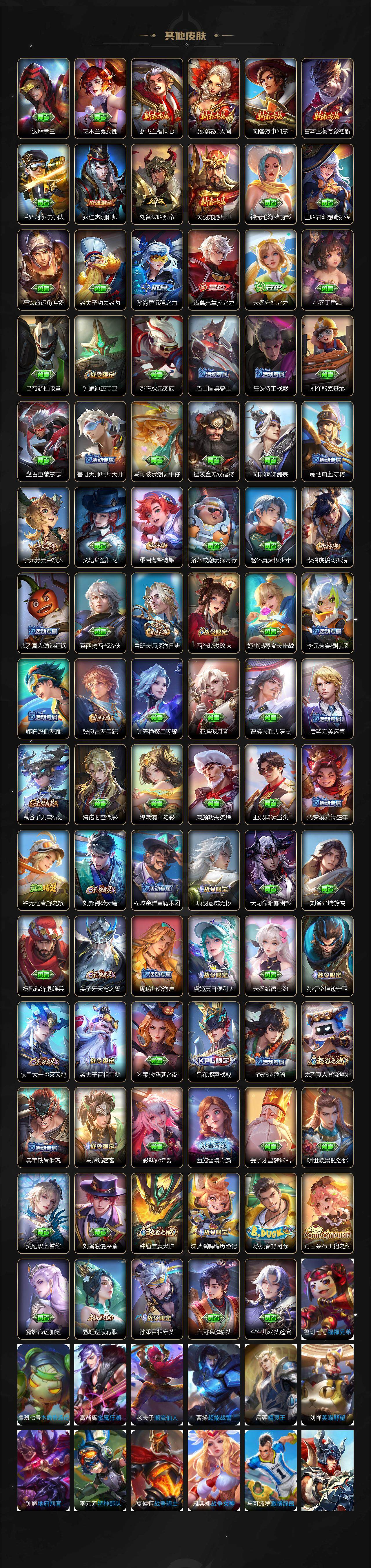 【限定皮肤】:夏侯惇霜北刀,铠冥王哈迪斯,蒙犽顽岩魄,蔡文姬夏日便利店,大乔绒语心约,虞姬夏日便利店,姜子牙天穹之誓,杨戬破阵退雄兵,李白谪仙醉月,狄仁杰阴阳师,赵云皇家上将,典韦岱宗,狄仁杰魔术师,项羽海滩派对,花木兰瑞麟志,孙悟空孙行者,刘备百相守梦,李元芳云中旅人,虞姬启明星使,钟馗神迹守卫,铠青龙志,百里玄策原初追逐者,梦奇顽趣,裴擒虎李小龙,裴擒虎擒涛扼浪,云中君纤云弄巧,猪八戒猪悟能,上官婉儿神器万象笔,西施玲珑珍味,鲁班大师探海日志,桑启海盐诗旅,戈娅驭风魔法,阿古朵江河有灵,张良古海寻踪,蒙恬荣光圣徽,鬼谷子天穹祈灯,姬小满妄想食味,赵云乘龙铭钟鼎,沈梦溪龙舞盛年,刘邦剑破天穹,程咬金群星魔术团,镜青焰无极,项羽苍威无极,刘备异域游侠,芈月浮光幕影,周瑜熔金海岸