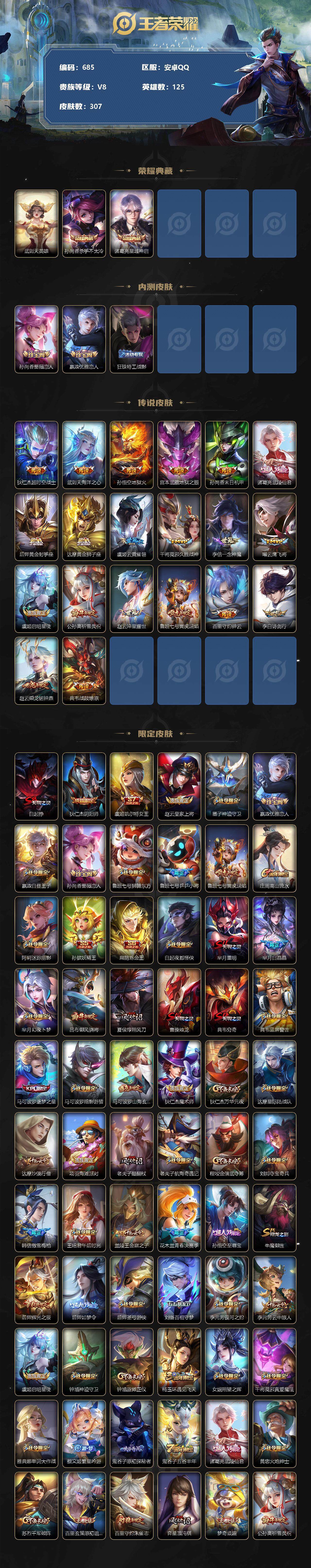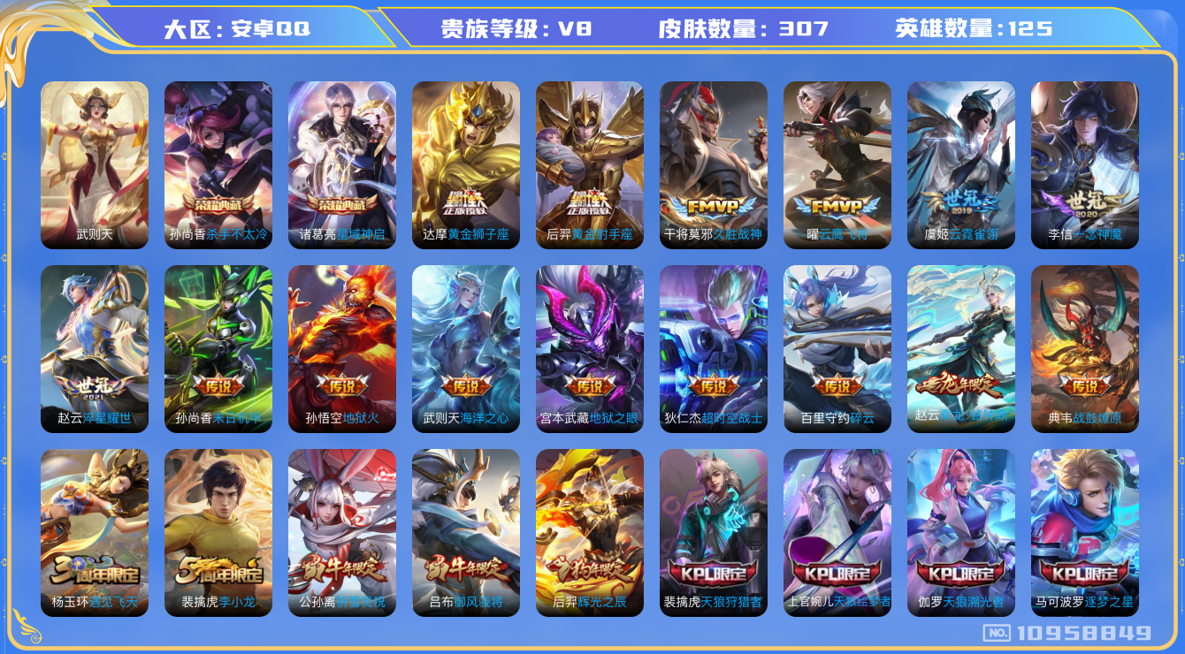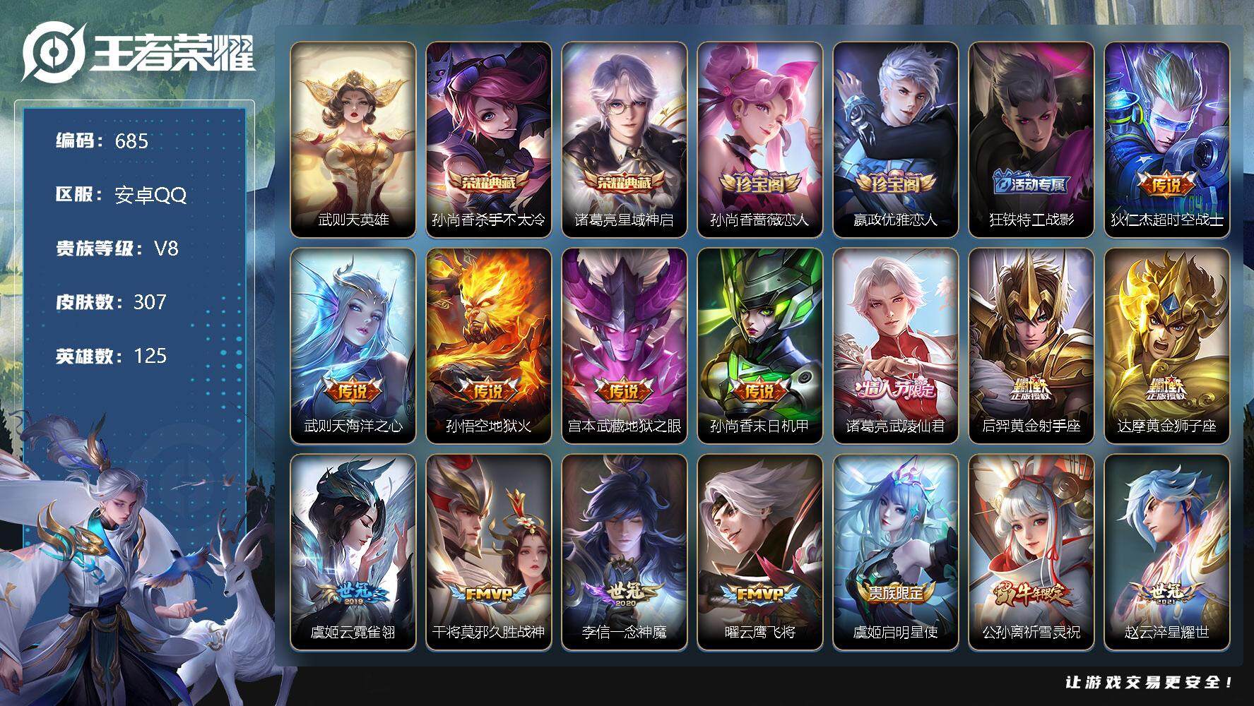 [10958849]【商品标题】:安卓Q-V8-最强王者段位-125英雄-307皮肤-2典藏-0珍品无双-0无双-0珍品传说-20传说-94史诗
