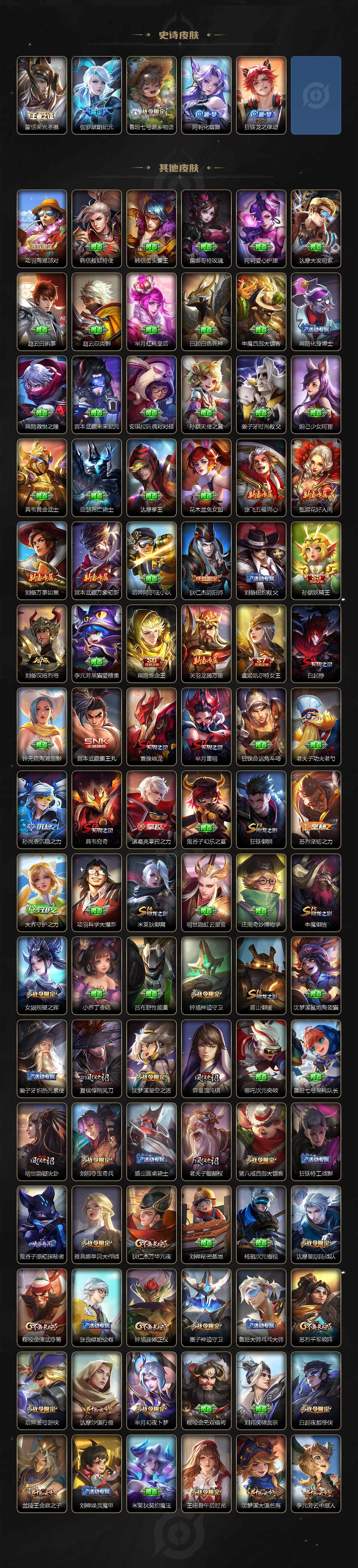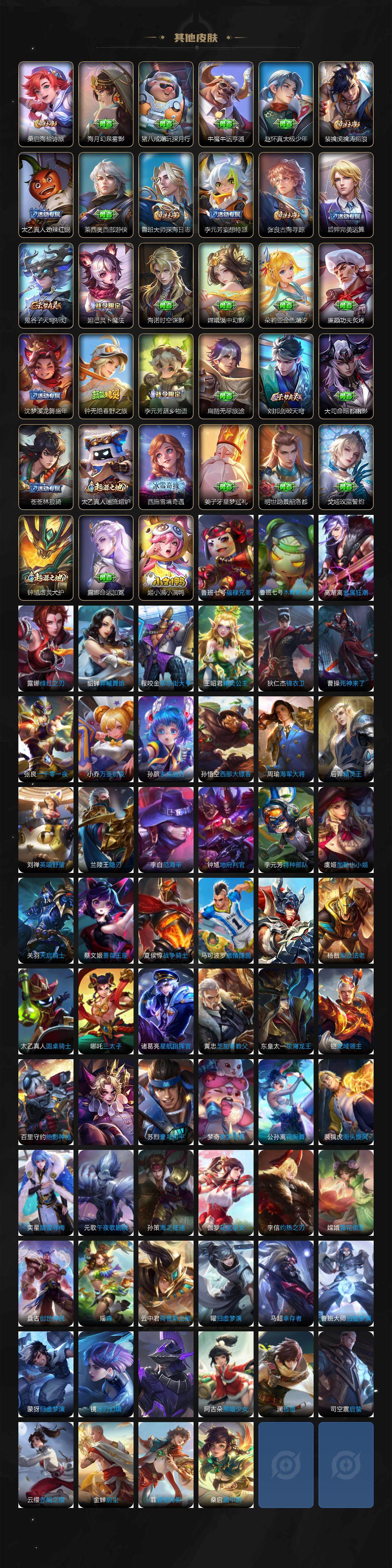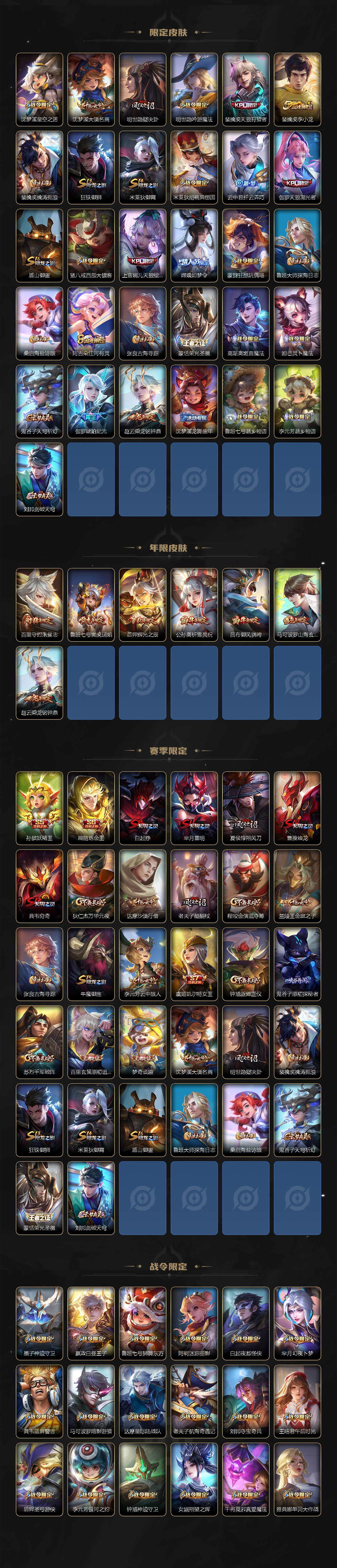 【限定皮肤】:白起狰,狄仁杰阴阳师,虞姬凯尔特女王,赵云皇家上将,墨子神迹守卫,嬴政优雅恋人,嬴政白昼王子,孙尚香蔷薇恋人,鲁班七号狮舞东方,鲁班七号乒乒小将,鲁班七号寅虎瑞焰,庄周高山流水,阿轲迷踪丽影,孙膑妖精王,扁鹊炼金王,白起夜都怪侠,芈月重明,芈月白晶晶,芈月幻夜卜梦,吕布御风骁将,夏侯惇朔风刀,曹操烛龙,典韦穷奇,典韦蓝屏警告,马可波罗逐梦之星,马可波罗暗影游猎,马可波罗山海玄木吟,狄仁杰魔术师,狄仁杰万华元夜,达摩星际陆战队,达摩沙漠行僧,项羽海滩派对,老夫子醍醐杖,老夫子航海奇遇记,程咬金演武夺筹,刘邦夺宝奇兵,韩信傲雪梅枪,王昭君午后时光,兰陵王金庭之子,花木兰青春决赛季,孙悟空至尊宝,牛魔御旌,后羿辉光之辰,后羿如梦令,后羿圣弓游侠,刘备百相守梦,李元芳银河之约,李元芳云中旅人,虞姬启明星使,钟馗神迹守卫,钟馗驱傩正仪,杨玉环遇见飞天,女娲朔望之晖,干将莫邪真爱魔法,雅典娜单词大作战,蔡文姬繁星吟游,鬼谷子原初探秘者,鬼谷子五谷丰年,诸葛亮武陵仙君,黄忠火炮绅士,苏烈千军破阵,百里玄策原初追逐者,百里守约朱雀志,弈星混沌棋,梦奇顽趣,公孙离祈雪灵祝,沈梦溪星空之诺,沈梦溪大漠名商,明世隐疑决卦,明世隐吟游魔法,裴擒虎天狼狩猎者,裴擒虎李小龙,裴擒虎擒涛扼浪,狂铁御狮,米莱狄御霄,米莱狄胡桃异想国,云中君纤云弄巧,伽罗天狼溯光者,盾山御銮,猪八戒西部大镖客,上官婉儿天狼绘梦者,嫦娥如梦令,蒙犽狂想玩偶喵,鲁班大师探海日志,桑启海盐诗旅,阿古朵江河有灵,张良古海寻踪,蒙恬荣光圣徽,高渐离燃音魔法,妲己灵卜魔法,鬼谷子天穹祈灯,伽罗琥珀纪元,赵云乘龙铭钟鼎,沈梦溪龙舞盛年,鲁班七号蔬乡物语,李元芳