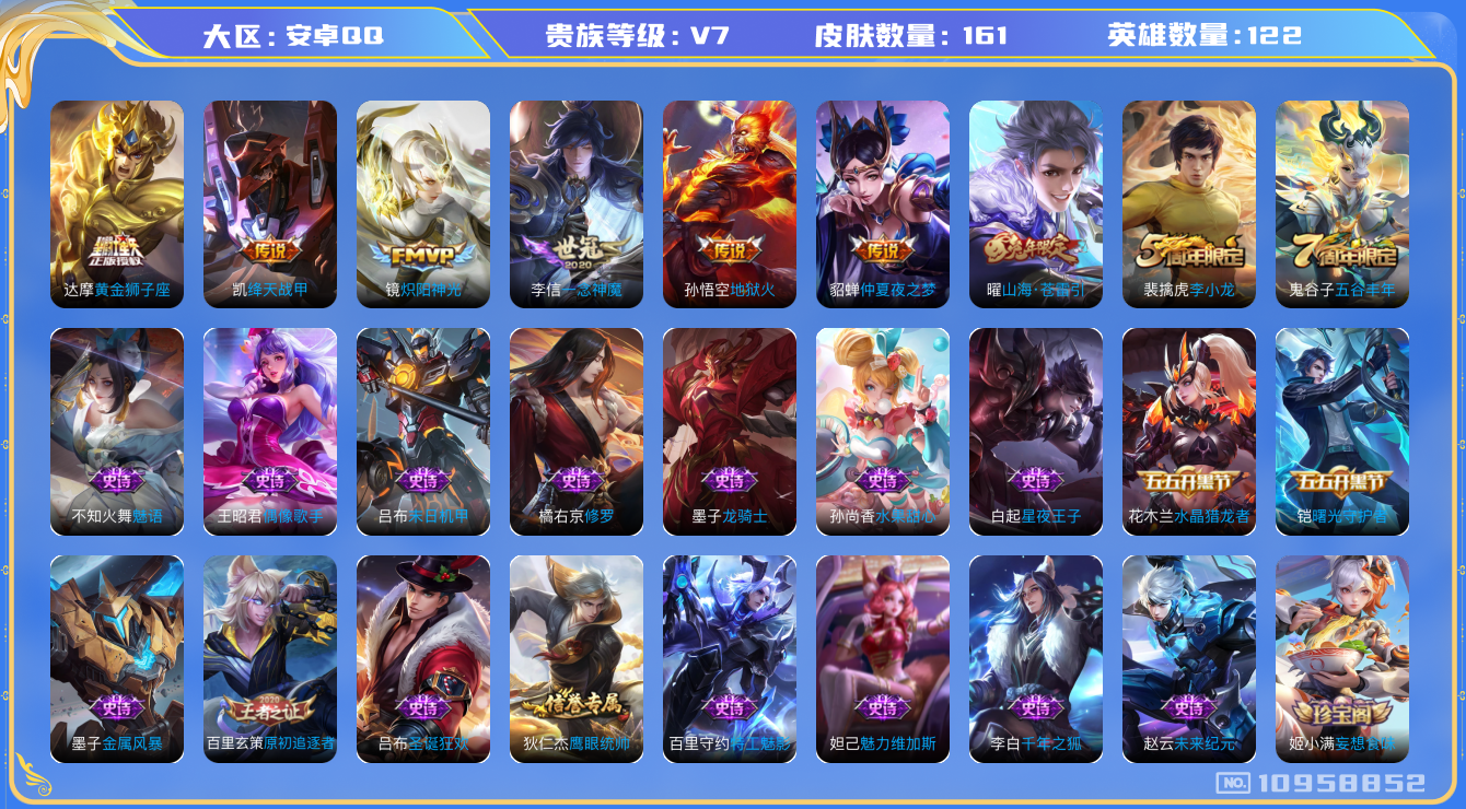 [10958852]【商品标题】:安卓Q-V7-至尊星耀V段位-122英雄-161皮肤-0典藏-0珍品无双-0无双-0珍品传说-7传说-28史诗