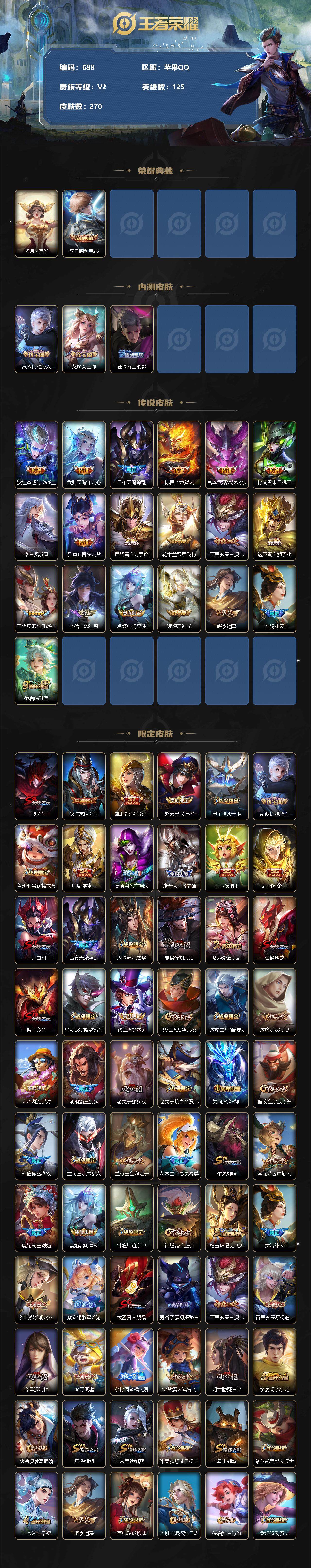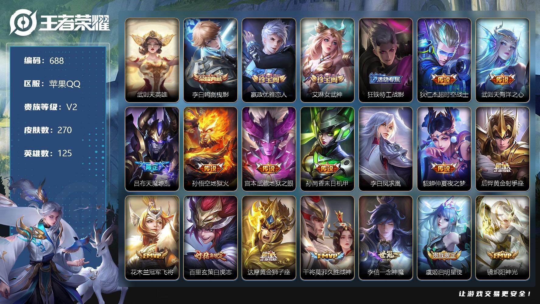 [10958859]【商品标题】:苹果Q-V2-荣耀黄金I段位-125英雄-270皮肤-1典藏-0珍品无双-0无双-0珍品传说-19传说-77史诗