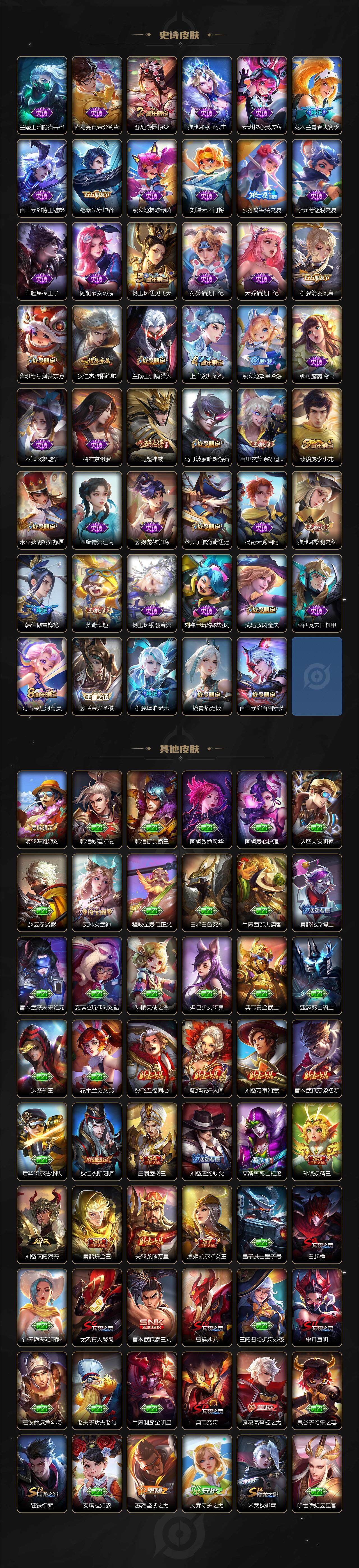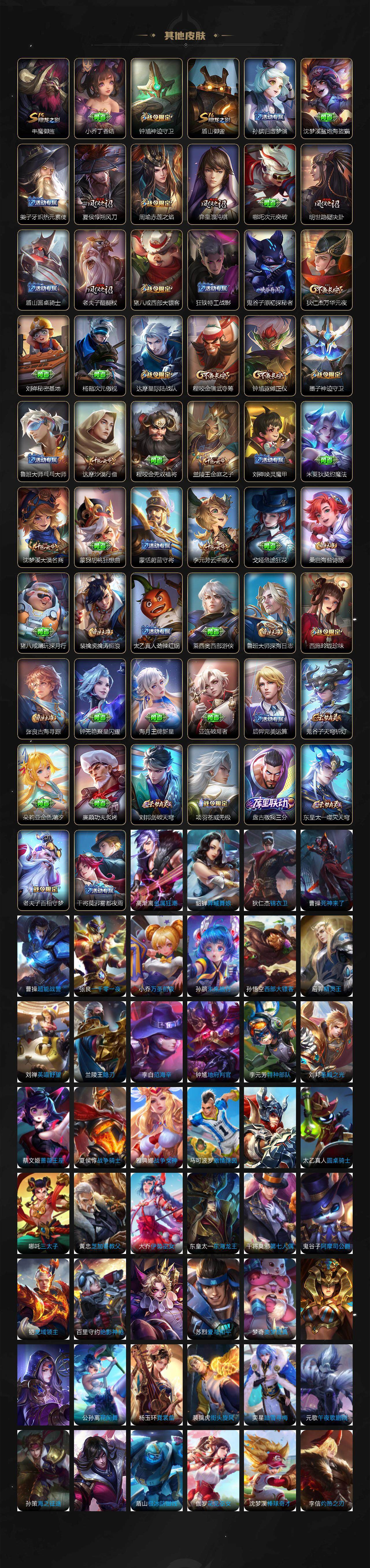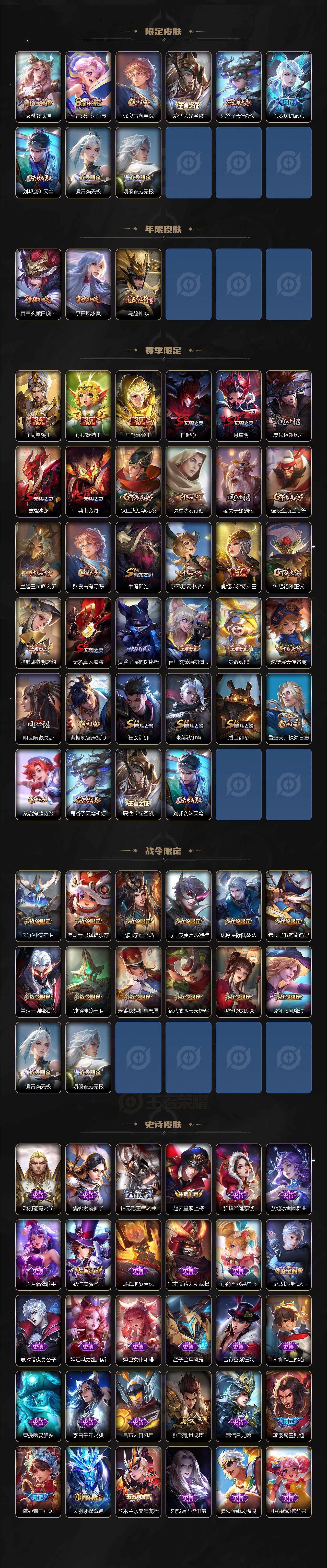 【限定皮肤】:白起狰,狄仁杰阴阳师,虞姬凯尔特女王,赵云皇家上将,墨子神迹守卫,嬴政优雅恋人,鲁班七号狮舞东方,庄周蜃楼王,高渐离死亡摇滚,钟无艳王者之锤,孙膑妖精王,扁鹊炼金王,芈月重明,吕布天魔缭乱,周瑜赤莲之焰,夏侯惇朔风刀,甄姬游园惊梦,曹操烛龙,典韦穷奇,马可波罗暗影游猎,狄仁杰魔术师,狄仁杰万华元夜,达摩星际陆战队,达摩沙漠行僧,项羽海滩派对,项羽霸王别姬,老夫子醍醐杖,老夫子航海奇遇记,关羽冰锋战神,程咬金演武夺筹,韩信傲雪梅枪,兰陵王驯魔猎人,兰陵王金庭之子,花木兰青春决赛季,牛魔御旌,李元芳云中旅人,虞姬霸王别姬,虞姬启明星使,钟馗神迹守卫,钟馗驱傩正仪,杨玉环遇见飞天,女娲补天,雅典娜黎明之约,蔡文姬繁星吟游,太乙真人饕餮,鬼谷子原初探秘者,百里玄策白虎志,百里玄策原初追逐者,弈星混沌棋,梦奇顽趣,公孙离蜜橘之夏,沈梦溪大漠名商,明世隐疑决卦,裴擒虎李小龙,裴擒虎擒涛扼浪,狂铁御狮,米莱狄御霄,米莱狄胡桃异想国,盾山御銮,猪八戒西部大镖客,上官婉儿梁祝,曜李逍遥 ,西施玲珑珍味,鲁班大师探海日志,桑启海盐诗旅,戈娅驭风魔法,艾琳女武神,阿古朵江河有灵,张良古海寻踪,蒙恬荣光圣徽,鬼谷子天穹祈灯,伽罗琥珀纪元,刘邦剑破天穹,镜青焰无极,项羽苍威无极
