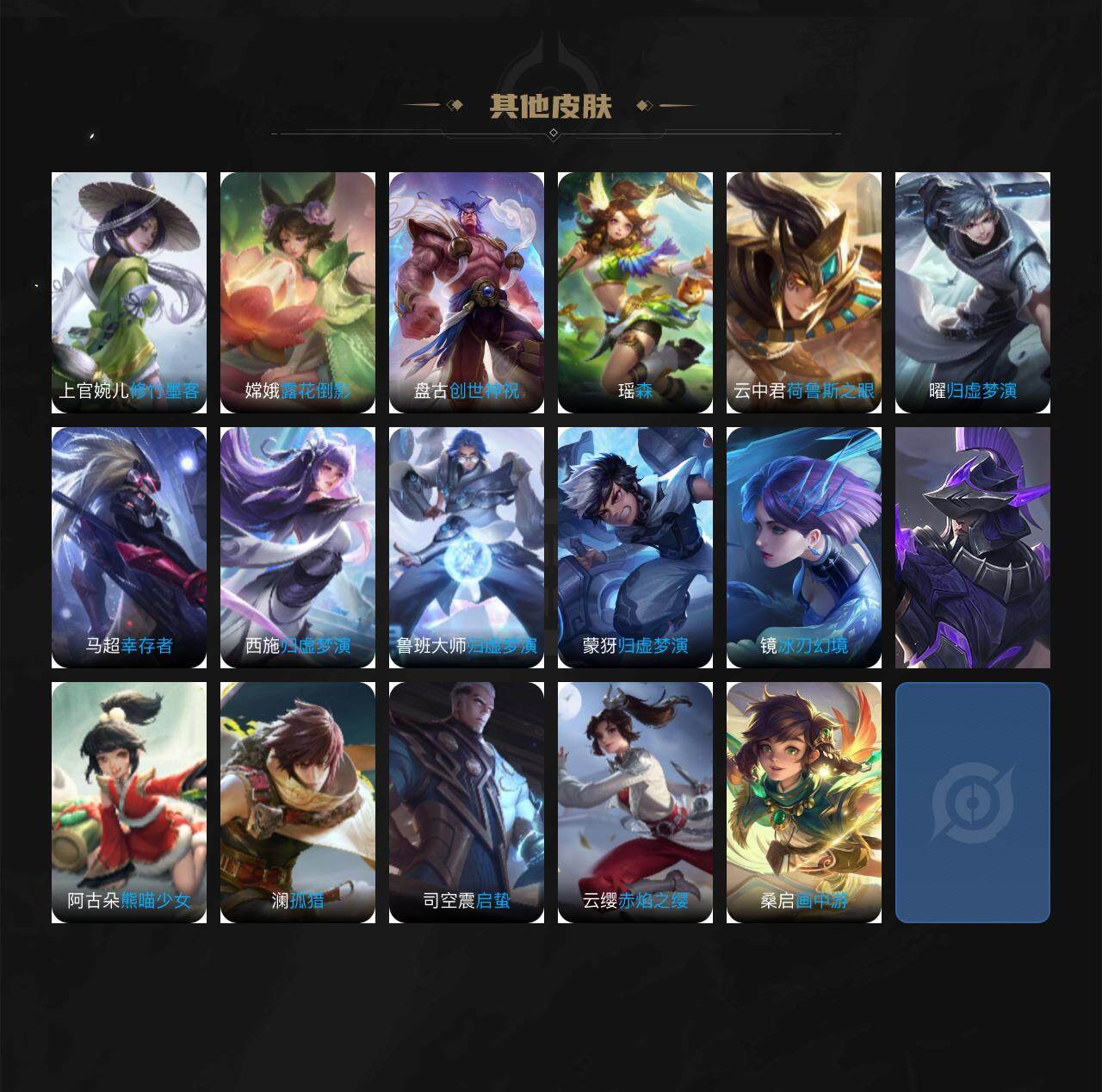 【赛季限定】:庄周蜃楼王,孙膑妖精王,扁鹊炼金王,白起狰,芈月重明,夏侯惇朔风刀,曹操烛龙,典韦穷奇,狄仁杰万华元夜,达摩沙漠行僧,老夫子醍醐杖,程咬金演武夺筹,兰陵王金庭之子,张良古海寻踪,牛魔御旌,李元芳云中旅人,虞姬凯尔特女王,钟馗驱傩正仪,雅典娜黎明之约,太乙真人饕餮,鬼谷子原初探秘者,百里玄策原初追逐者,弈星混沌棋,梦奇顽趣,沈梦溪大
