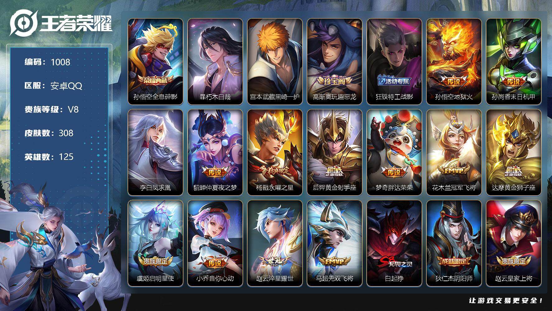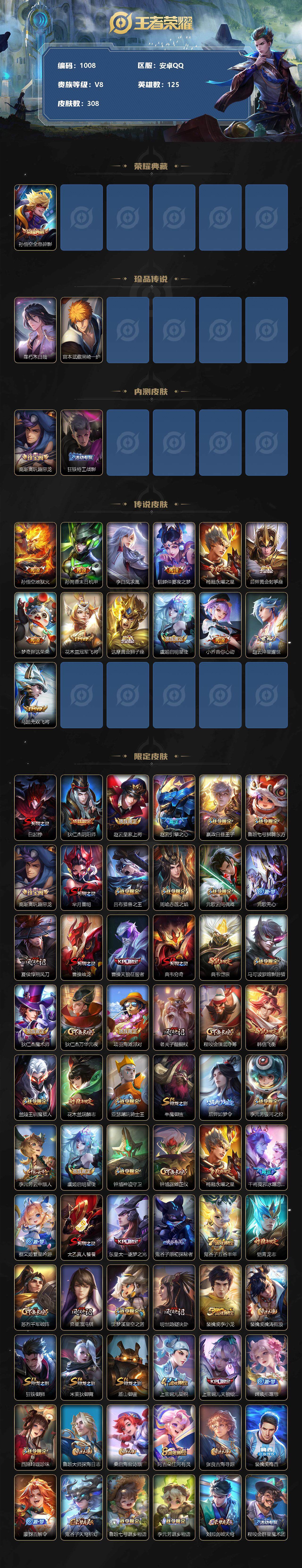 [10959508]【商品标题】:安卓Q-V8-至尊星耀IV段位-125英雄-308皮肤-1典藏-0珍品无双-0无双-2珍品传说-13传说-84史诗