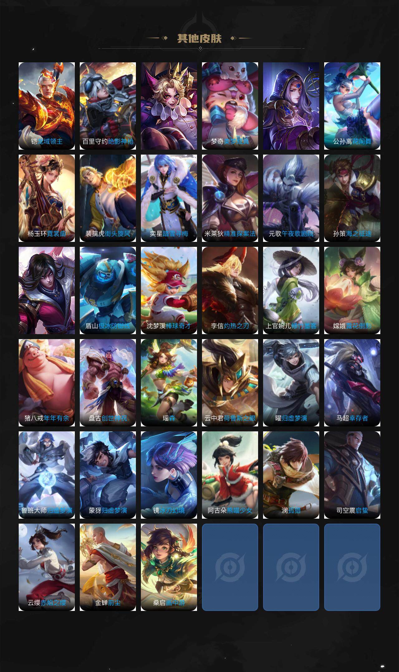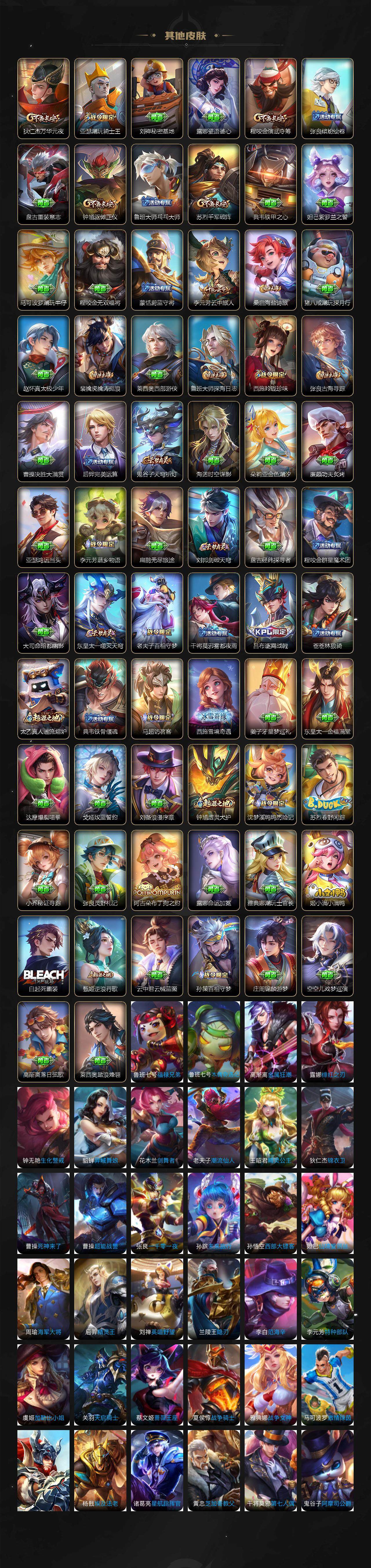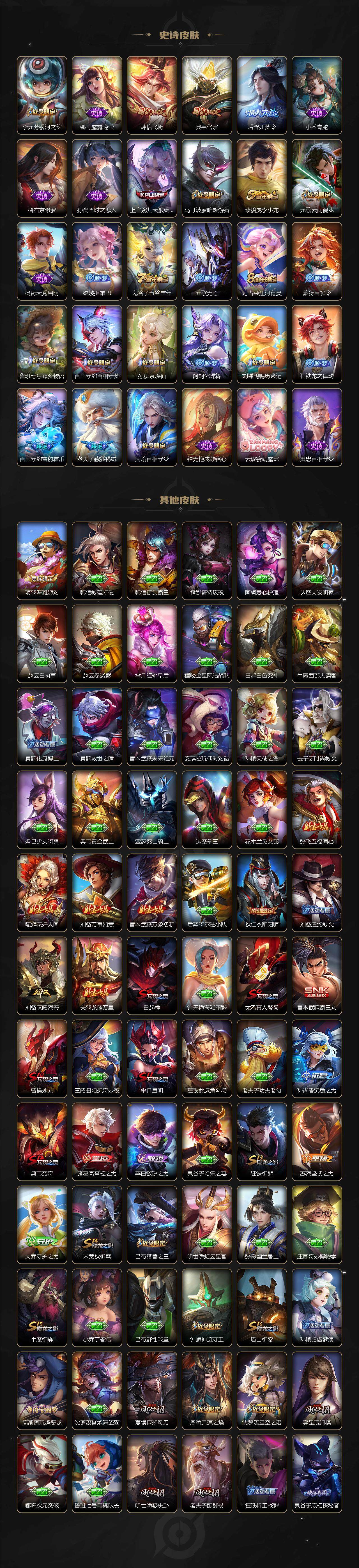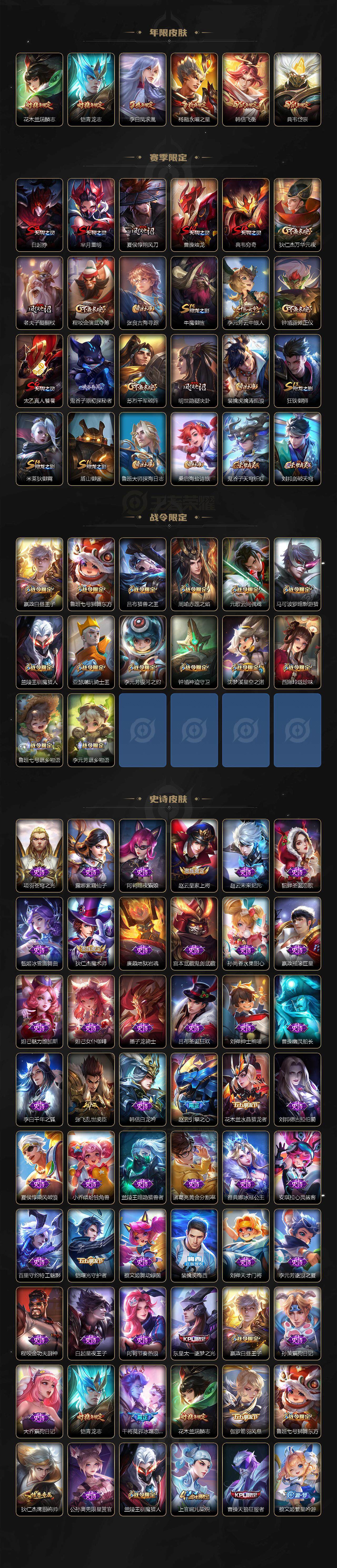 【限定皮肤】:白起狰,狄仁杰阴阳师,赵云皇家上将,赵云引擎之心,嬴政白昼王子,鲁班七号狮舞东方,高渐离玩趣恶龙,芈月重明,吕布猎兽之王,周瑜赤莲之焰,元歌云间偶戏,元歌无心,夏侯惇朔风刀,曹操烛龙,曹操天狼征服者,典韦穷奇,典韦岱宗,马可波罗暗影游猎,狄仁杰魔术师,狄仁杰万华元夜,项羽海滩派对,老夫子醍醐杖,程咬金演武夺筹,韩信飞衡,兰陵王驯魔猎人,花木兰瑞麟志,亚瑟潮玩骑士王,牛魔御旌,后羿如梦令,李元芳银河之约,李元芳云中旅人,虞姬启明星使,钟馗神迹守卫,钟馗驱傩正仪,杨戬永曜之星,干将莫邪冰霜恋舞曲,蔡文姬繁星吟游,太乙真人饕餮,东皇太一逐梦之光,鬼谷子原初探秘者,鬼谷子五谷丰年,铠青龙志,苏烈千军破阵,弈星混沌棋,沈梦溪星空之诺,明世隐疑决卦,裴擒虎李小龙,裴擒虎擒涛扼浪,狂铁御狮,米莱狄御霄,盾山御銮,上官婉儿梁祝,上官婉儿天狼绘梦者,嫦娥拒霜思,西施玲珑珍味,鲁班大师探海日志,桑启海盐诗旅,阿古朵江河有灵,张良古海寻踪,裴擒虎梅西,蒙犽百解令,鬼谷子天穹祈灯,鲁班七号蔬乡物语,李元芳蔬乡物语,刘邦剑破天穹,程咬金群星魔术团