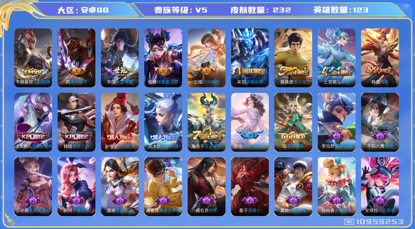 [10959253]【商品标题】:安卓Q-V5-至尊星耀III段位-123英雄-232皮肤-0典藏-0珍品无双-0无双-0珍品传说-5传说-56史诗