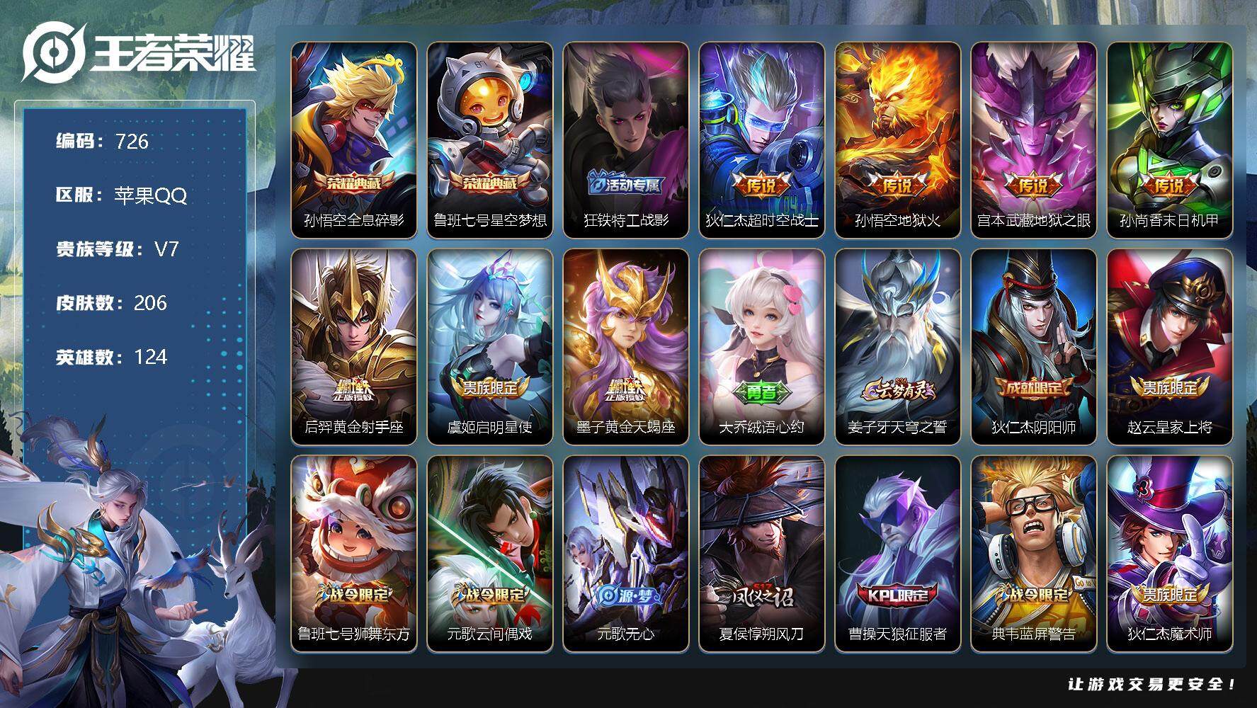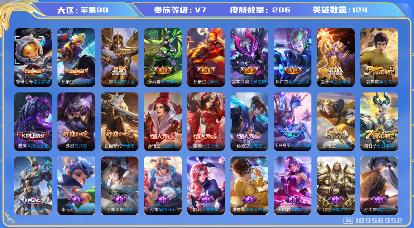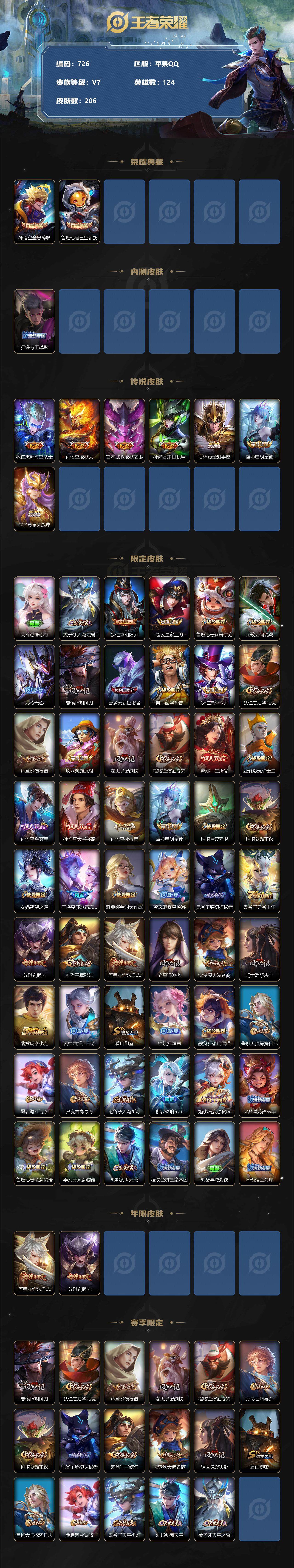 [10958952]【商品标题】:苹果Q-V7-至尊星耀IV段位-124英雄-206皮肤-2典藏-0珍品无双-0无双-0珍品传说-7传说-60史诗