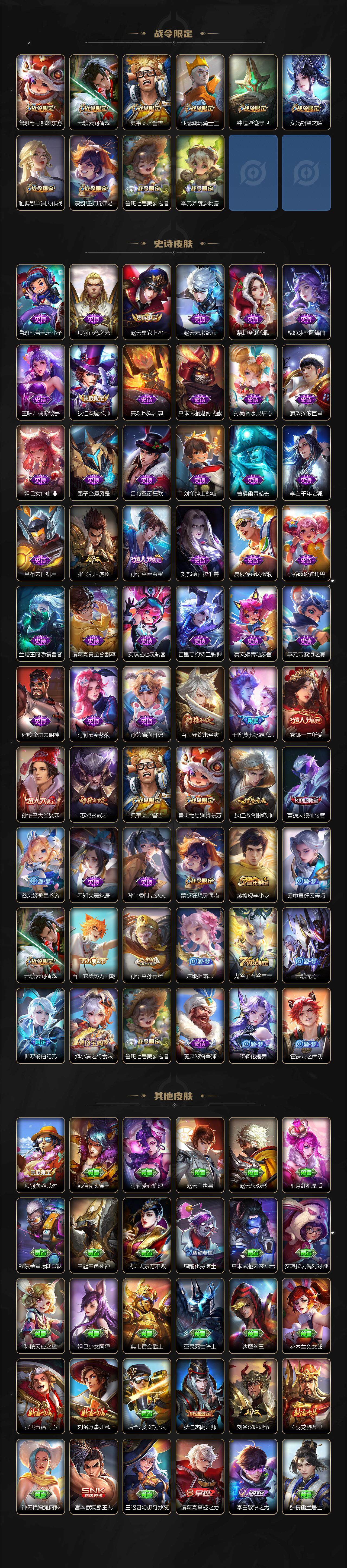 【史诗皮肤】:鲁班七号电玩小子,项羽苍穹之光,赵云皇家上将,赵云未来纪元,貂蝉圣诞恋歌,甄姬冰雪圆舞曲,王昭君偶像歌手,狄仁杰魔术师,廉颇地狱岩魂,宫本武藏鬼剑武藏,孙尚香水果甜心,嬴政摇滚巨星,妲己女仆咖啡,墨子金属风暴,吕布圣诞狂欢,刘禅绅士熊喵,曹操幽灵船长,李白千年之狐,吕布末日机甲,张飞乱世虎臣,孙悟空至尊宝,刘邦德古拉伯爵,夏侯惇乘风破浪,小乔