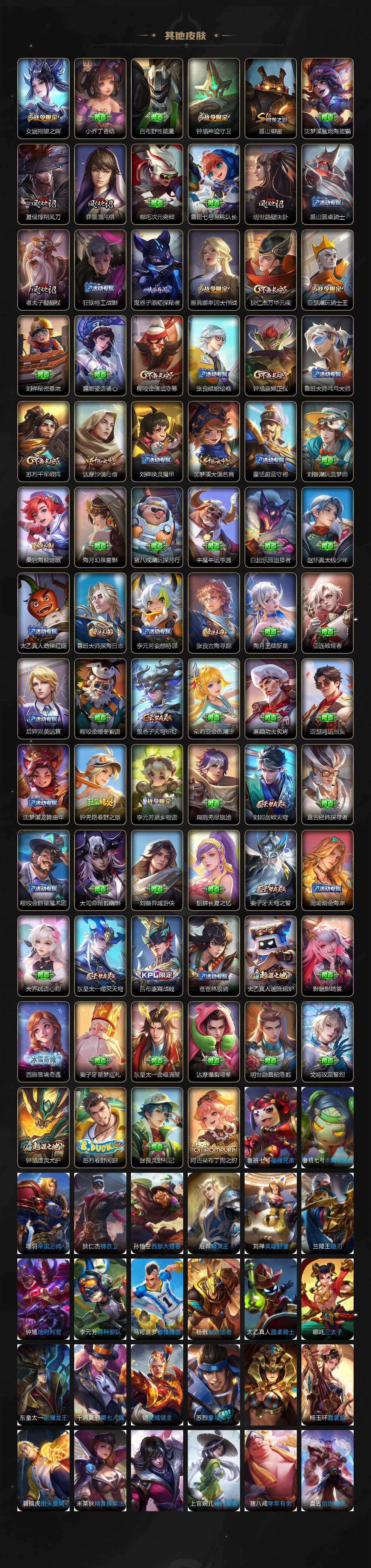 【赛季限定】:夏侯惇朔风刀,狄仁杰万华元夜,达摩沙漠行僧,老夫子醍醐杖,程咬金演武夺筹,张良古海寻踪,钟馗驱傩正仪,鬼谷子原初探秘者,苏烈千军破阵,弈星混沌棋,沈梦溪大漠名商,明世隐疑决卦,盾山御銮,鲁班大师探海日志,桑启海盐诗旅,鬼谷子天穹祈灯,刘邦剑破天穹,姜子牙天穹之誓