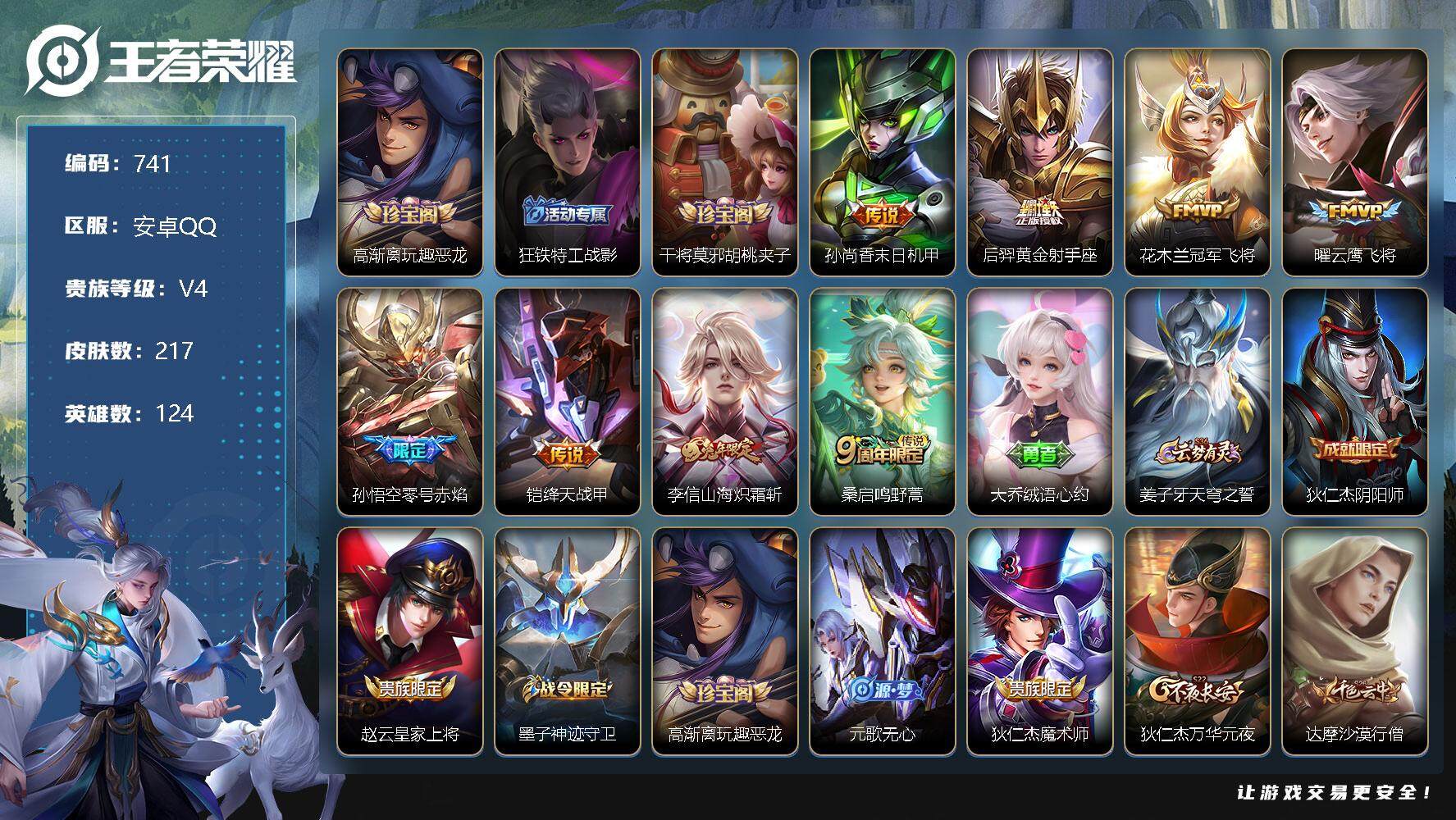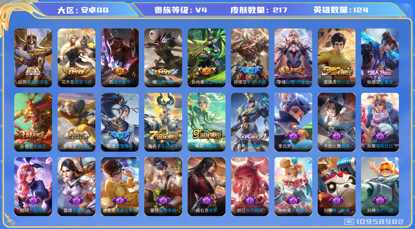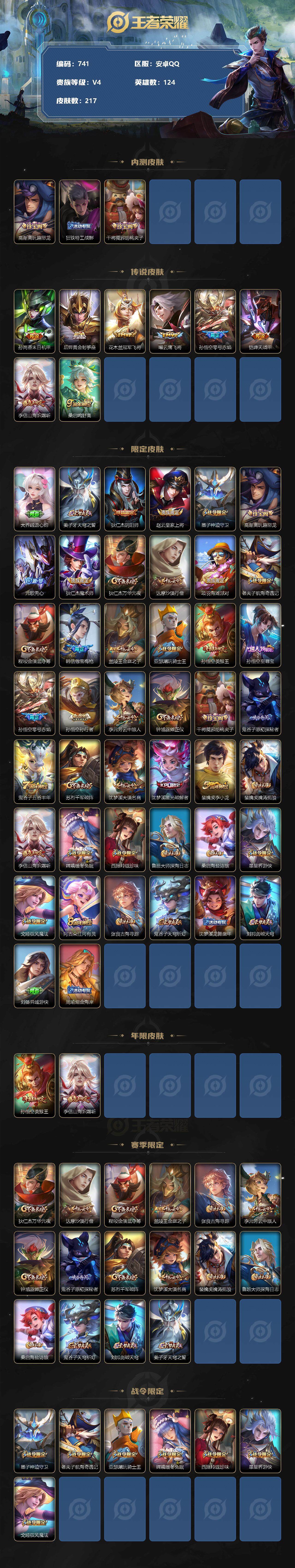 [10958982]【商品标题】:安卓Q-V4-永恒钻石I段位-124英雄-217皮肤-0典藏-0珍品无双-0无双-0珍品传说-8传说-48史诗