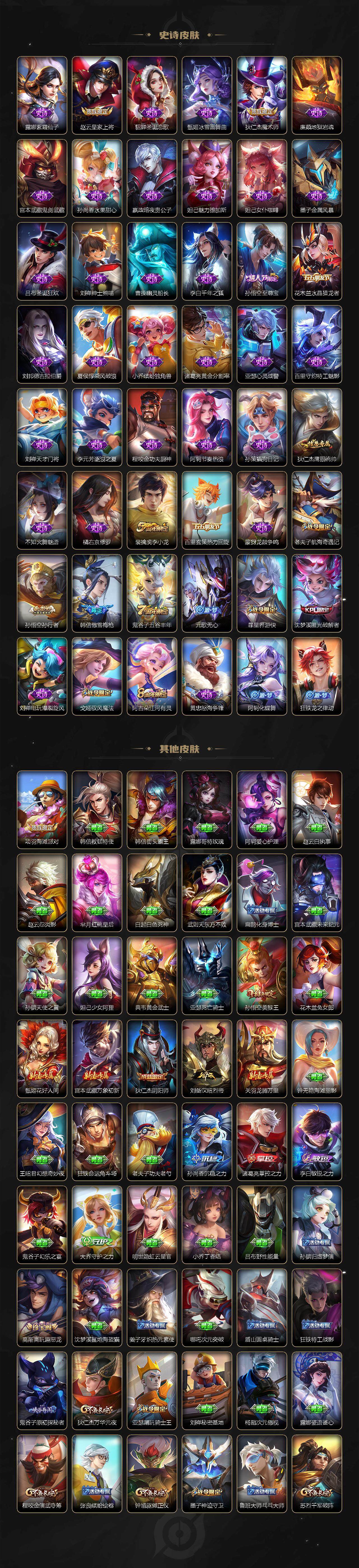 【史诗皮肤】:露娜紫霞仙子,赵云皇家上将,貂蝉圣诞恋歌,甄姬冰雪圆舞曲,狄仁杰魔术师,廉颇地狱岩魂,宫本武藏鬼剑武藏,孙尚香水果甜心,嬴政暗夜贵公子,妲己魅力维加斯,妲己女仆咖啡,墨子金属风暴,吕布圣诞狂欢,刘禅绅士熊喵,曹操幽灵船长,李白千年之狐,孙悟空至尊宝,花木兰水晶猎龙者,刘邦德古拉伯爵,夏侯惇乘风破浪,小乔缤纷独角兽,诸葛亮黄金分割率,亚瑟心灵战警,百里守约特工魅影,刘禅天才门将,李元芳逐浪之夏,程咬金功夫厨神,阿轲节奏热浪,孙策猫狗日记,狄仁杰鹰眼统帅,不知火舞魅语,橘右京修罗,裴擒虎李小龙,百里玄策热力回旋,蒙犽龙鼓争鸣,老夫子航海奇遇记,孙悟空孙行者,韩信傲雪梅