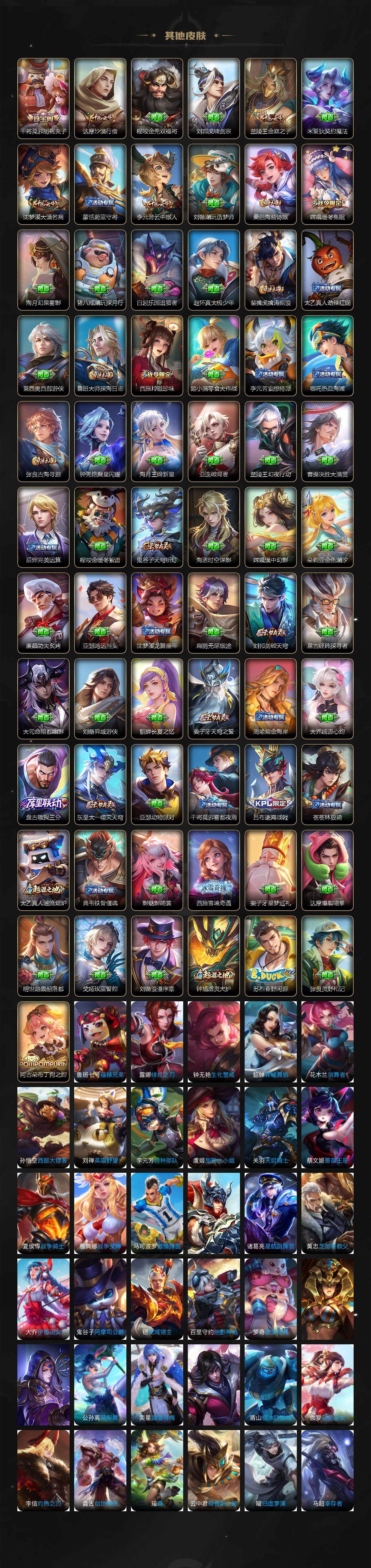 【赛季限定】:狄仁杰万华元夜,达摩沙漠行僧,程咬金演武夺筹,兰陵王金庭之子,张良古海寻踪,李元芳云中旅人,钟馗驱傩正仪,鬼谷子原初探秘者,苏烈千军破阵,沈梦溪大漠名商,裴擒虎擒涛扼浪,鲁班大师探海日志,桑启海盐诗旅,鬼谷子天穹祈灯,刘邦剑破天穹,姜子牙天穹之誓