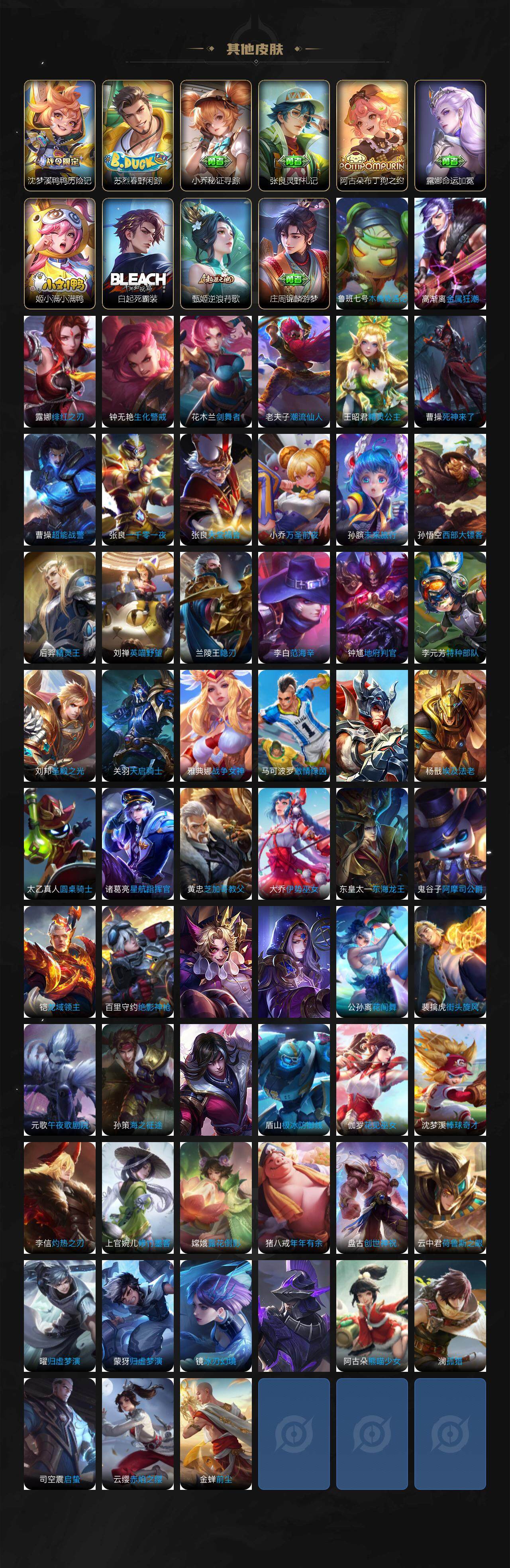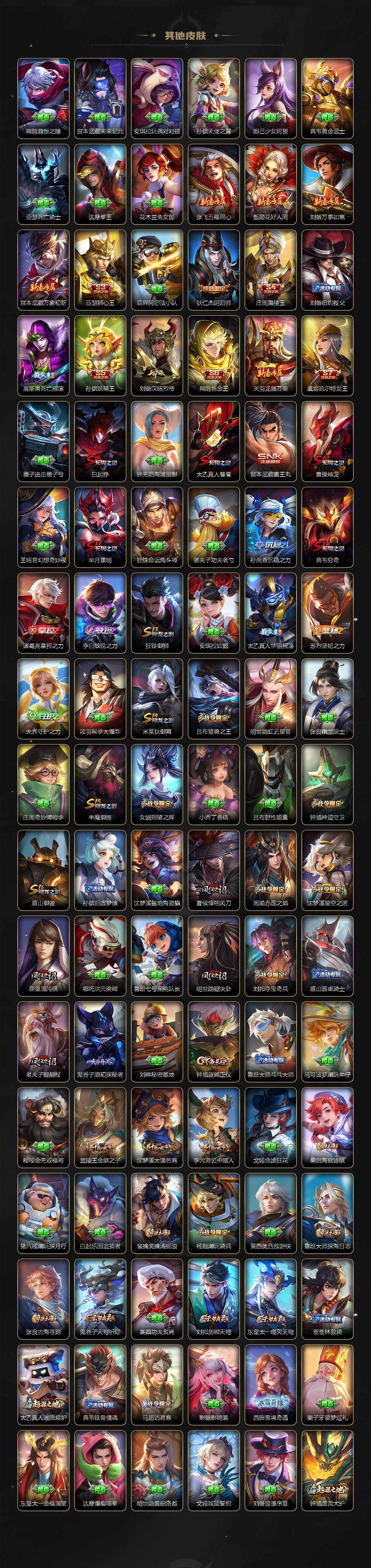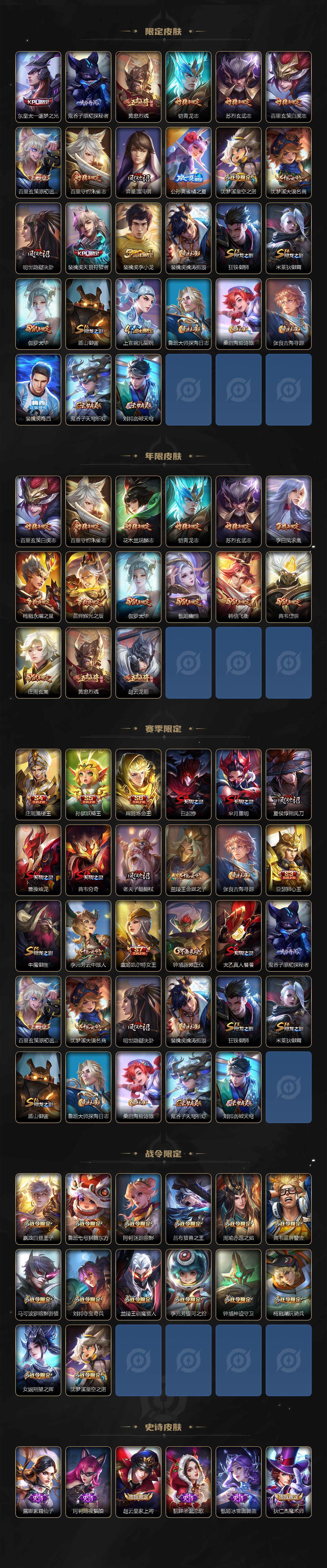 【限定皮肤】:白起狰,狄仁杰阴阳师,虞姬凯尔特女王,赵云皇家上将,赵云引擎之心,赵云龙胆,嬴政优雅恋人,嬴政白昼王子,鲁班七号狮舞东方,庄周蜃楼王,庄周玄嵩,高渐离死亡摇滚,阿轲迷踪丽影,孙膑妖精王,扁鹊炼金王,芈月重明,吕布猎兽之王,周瑜赤莲之焰,夏侯惇朔风刀,甄姬幽恒,曹操烛龙,曹操天狼征服者,典韦穷奇,典韦蓝屏警告,典韦岱宗,马可波罗暗影游猎,狄仁杰魔术师,项羽海滩派对,老夫子醍醐杖,关羽冰锋战神,露娜一生所爱,刘邦夺宝奇兵,韩信逐梦之影,韩信飞衡,兰陵王驯魔猎人,兰陵王金庭之子,花木兰瑞麟志,亚瑟狮心王,孙悟空大圣娶亲,牛魔御旌,后羿辉光之辰,李元芳银河之约,李元芳云中旅人,虞姬启明星使,钟馗神迹守卫,钟馗驱傩正仪,杨玉环遇见飞天,杨戬永曜之星,杨戬潮玩骑兵,女娲朔望之晖,哪吒逐梦之翼,蔡文姬繁星吟游,太乙真人饕餮,太乙真人华丽摇滚,东皇太一逐梦之光,鬼谷子原初探秘者,黄忠烈魂,铠青龙志,苏烈玄武志,百里玄策白虎志,百里玄策原初追逐者,百里守约朱雀志,弈星混沌棋,公孙离蜜橘之夏,沈梦溪星空之诺,沈梦溪大漠名商,明世隐疑决卦,裴擒虎天狼狩猎者,裴擒虎李小龙,裴擒虎擒涛扼浪,狂铁御狮,米莱狄御霄,伽罗太华,盾山御銮,上官婉儿梁祝,鲁班大师探海日志,桑启海盐诗旅,张良古海寻踪,裴擒虎梅西,鬼谷子天穹祈灯,刘邦剑破天穹