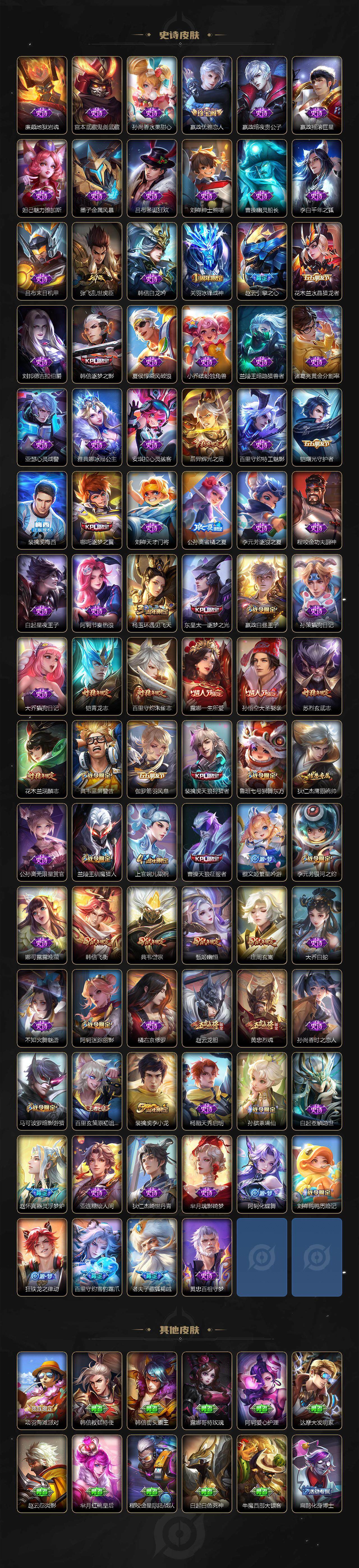 - PX_2096931-贵族5/皮肤205/传说5/史诗41/英雄123/蔷薇恋人/玩趣恶龙/特工战影/地狱之眼/桑启鸣野蒿/云缨幻光神枪/妲己愿照众生和/女娲愿照千秋盛/姜子牙天穹之誓/狄仁杰阴阳师/赵云皇家上将/蔷薇恋人/高渐离死亡摇滚/玩趣恶龙/重明/元歌无心/朔风刀/烛龙/穷奇/沙漠行僧/项羽海滩派对/醍醐杖/演武夺筹/金庭之子/御旌/云中旅人/驱傩正仪/黎明之约/蔡文姬繁星吟游/原初探秘者