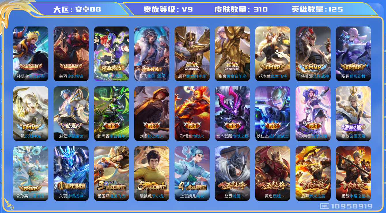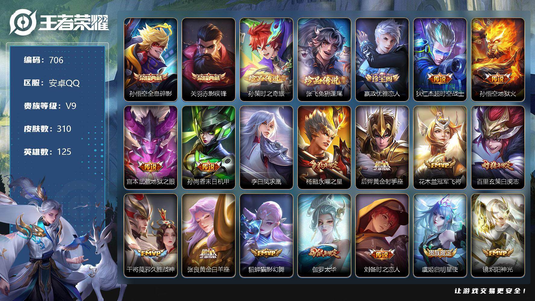 [10958919]【商品标题】:安卓Q-V9-最强王者段位-125英雄-310皮肤-2典藏-0珍品无双-0无双-2珍品传说-27传说-94史诗