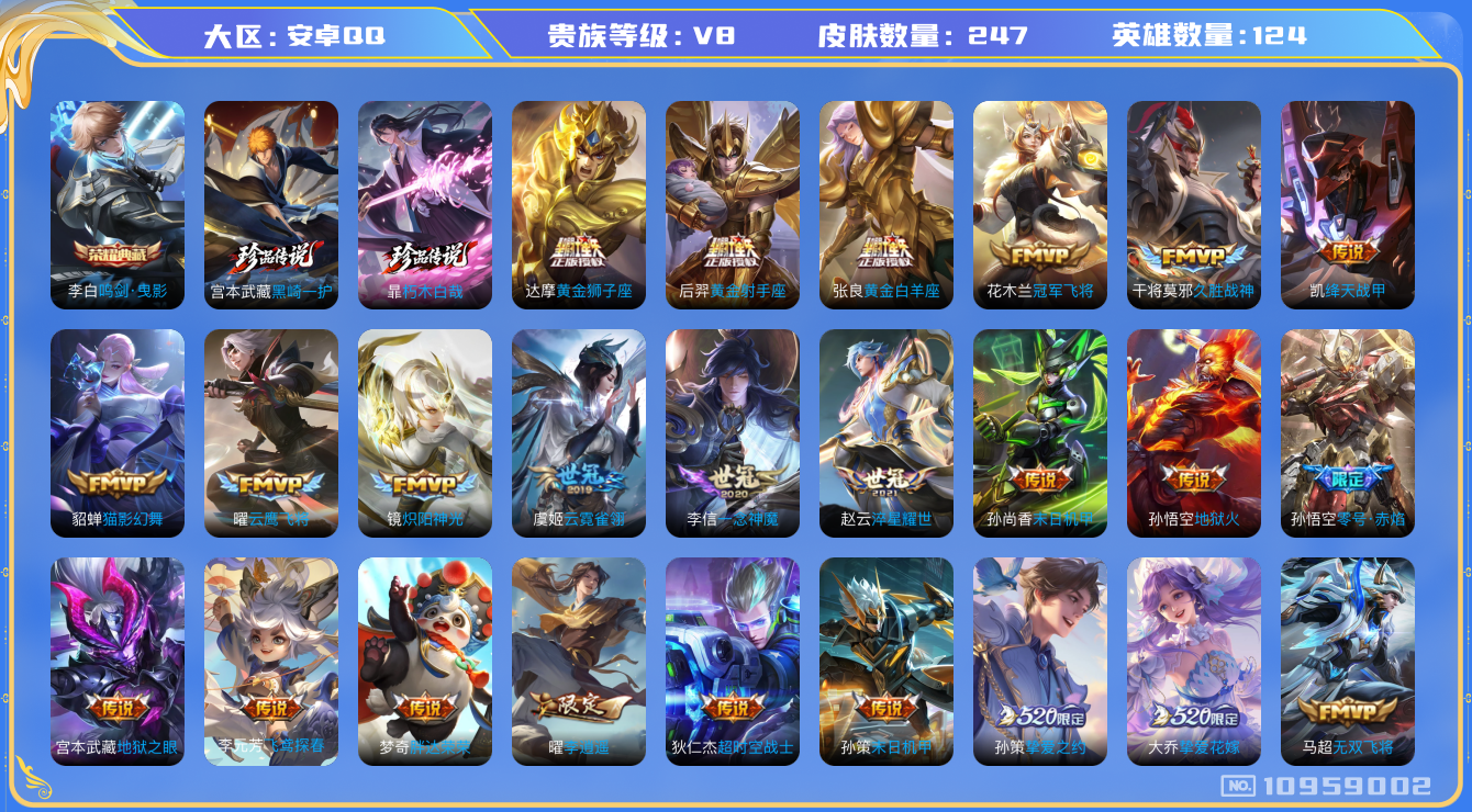 [10959002]【商品标题】:安卓Q-V8-至尊星耀IV段位-124英雄-247皮肤-1典藏-0珍品无双-0无双-2珍品传说-30传说-79史诗