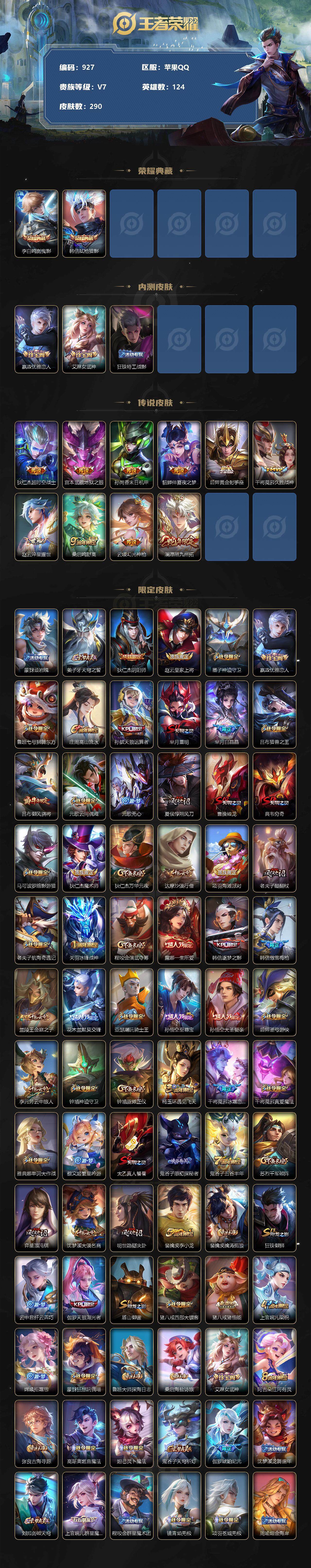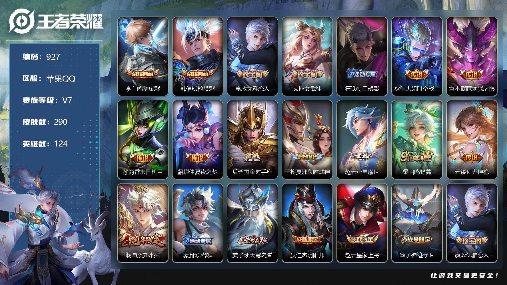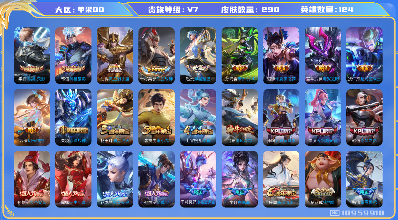 [10959918]【商品标题】:苹果Q-V6-至尊星耀IV段位-124英雄-290皮肤-2典藏-0珍品无双-0无双-0珍品传说-10传说-83史诗