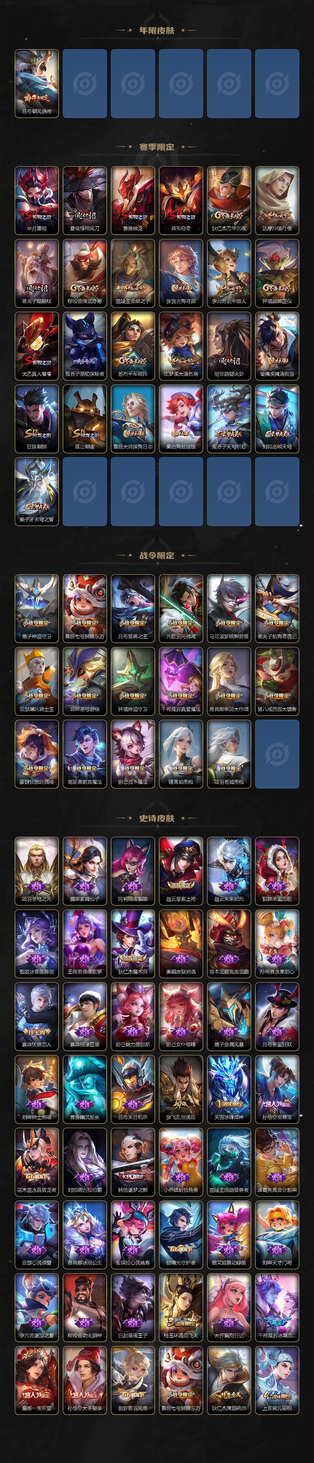 【赛季限定】:芈月重明,夏侯惇朔风刀,曹操烛龙,典韦穷奇,狄仁杰万华元夜,达摩沙漠行僧,老夫子醍醐杖,程咬金演武夺筹,兰陵王金庭之子,张良古海寻踪,李元芳云中旅人,钟馗驱傩正仪,太乙真人饕餮,鬼谷子原初探秘者,苏烈千军破阵,弈星混沌棋,沈梦溪大漠名商,明世隐疑决卦,裴擒虎擒涛扼浪,狂铁御狮,盾山御銮,鲁班大师探海日志,桑启海盐诗旅,鬼谷子天穹祈灯,刘邦剑破天穹,姜子牙天穹之誓