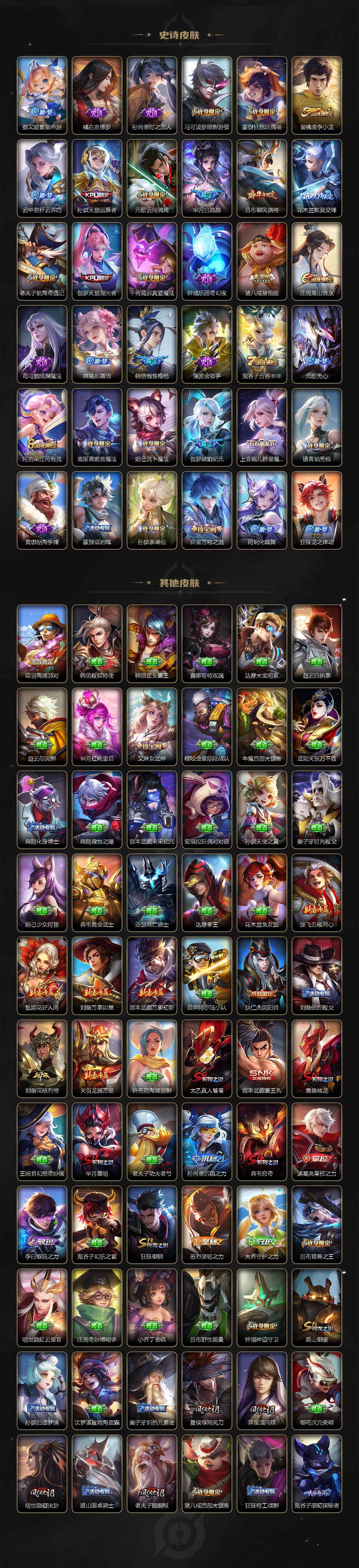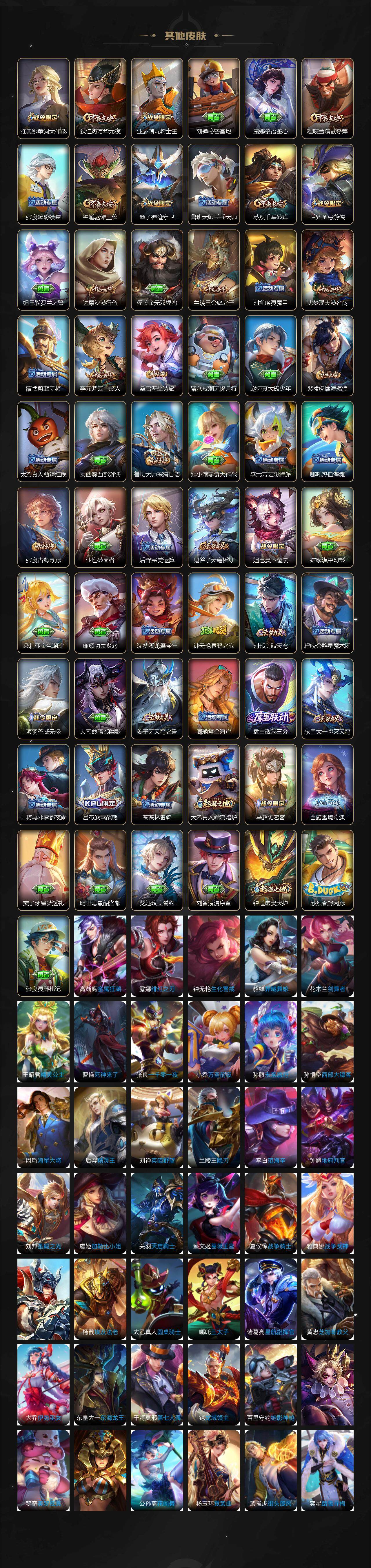 【限定皮肤】:蒙犽顽岩魄,姜子牙天穹之誓,狄仁杰阴阳师,赵云皇家上将,墨子神迹守卫,嬴政优雅恋人,鲁班七号狮舞东方,庄周高山流水,孙膑天狼运算者,芈月重明,芈月白晶晶,吕布猎兽之王,吕布御风骁将,元歌云间偶戏,元歌无心,夏侯惇朔风刀,曹操烛龙,典韦穷奇,马可波罗暗影游猎,狄仁杰魔术师,狄仁杰万华元夜,达摩沙漠行僧,项羽海滩派对,老夫子醍醐杖,老夫子航海奇遇记,关羽冰锋战神,程咬金演武夺筹,露娜一生所爱,韩信逐梦之影,韩信傲雪梅枪,兰陵王金庭之子,花木兰默契交锋,亚瑟潮玩骑士王,孙悟空至尊宝,孙悟空大圣娶亲,后羿圣弓游侠,李元芳云中旅人,钟馗神迹守卫,钟馗驱傩正仪,杨玉环遇见飞天,干将莫邪冰霜恋舞曲,干将莫邪真爱魔法,雅典娜单词大作战,蔡文姬繁星吟游,太乙真人饕餮,鬼谷子原初探秘者,鬼谷子五谷丰年,苏烈千军破阵,弈星混沌棋,沈梦溪大漠名商,明世隐疑决卦,裴擒虎李小龙,裴擒虎擒涛扼浪,狂铁御狮,云中君纤云弄巧,伽罗天狼溯光者,盾山御銮,猪八戒西部大镖客,猪八戒猪悟能,上官婉儿梁祝,嫦娥拒霜思,蒙犽狂想玩偶喵,鲁班大师探海日志,桑启海盐诗旅,艾琳女武神,阿古朵江河有灵,张良古海寻踪,高渐离燃音魔法,妲己灵卜魔法,鬼谷子天穹祈灯,伽罗琥珀纪元,沈梦溪龙舞盛年,刘邦剑破天穹,上官婉儿群星魔术团,程咬金群星魔术团,镜青焰无极,项羽苍威无极,周瑜熔金海岸