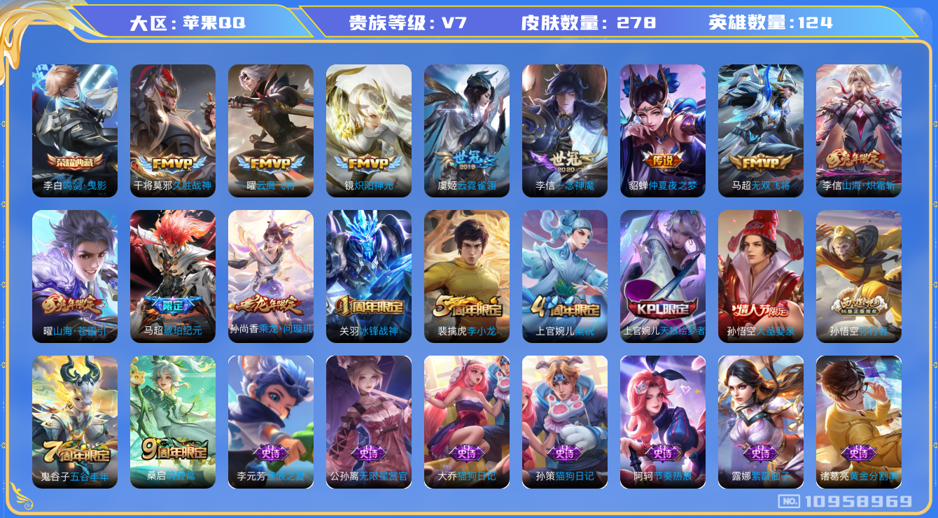 [10958969]【商品标题】:苹果Q-V7-至尊星耀V段位-124英雄-278皮肤-1典藏-0珍品无双-0无双-0珍品传说-12传说-80史诗